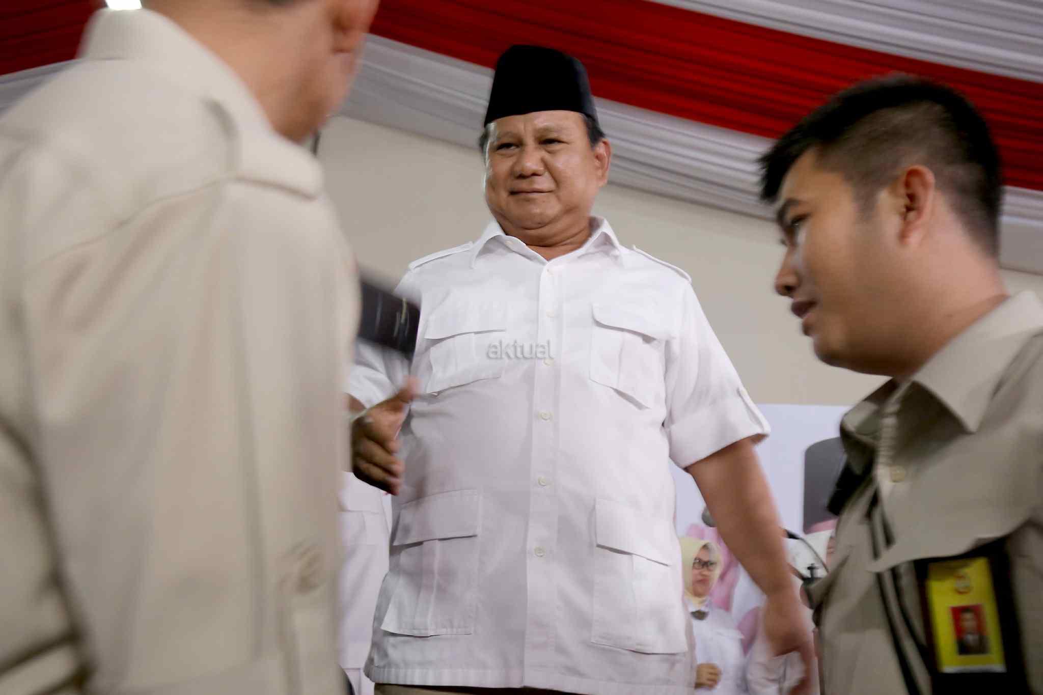 Ketua Umum Partai Gerindra Prabowo Subianto usai memberikan keterangan di DPP Gerindra, Jakarta, Rabu (15/2). Menurut Prabowo, Pilkada DKI merupakan simbol ‘pertarungan’ dua kekuatan. “Pilkada, DKI khususnya sudah menjadi simbol pertarungan antara yang ingin memperjuangkan keadilan, kebenaran, kejujuran dan yang ingin membuktikan bahwa uang bisa menjajah seluruh rakyat Indonesia. AKTUAL/Tino Oktaviano