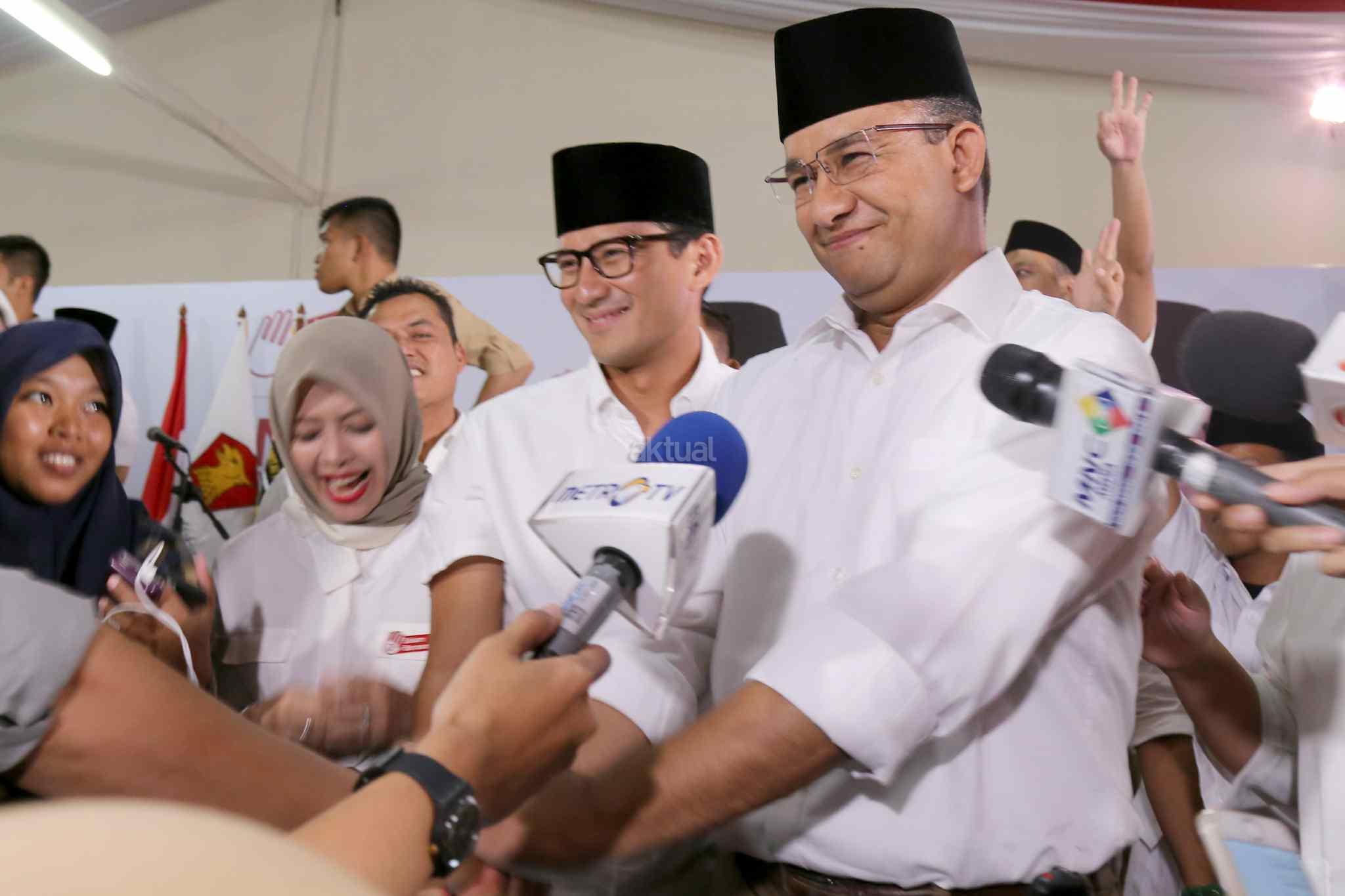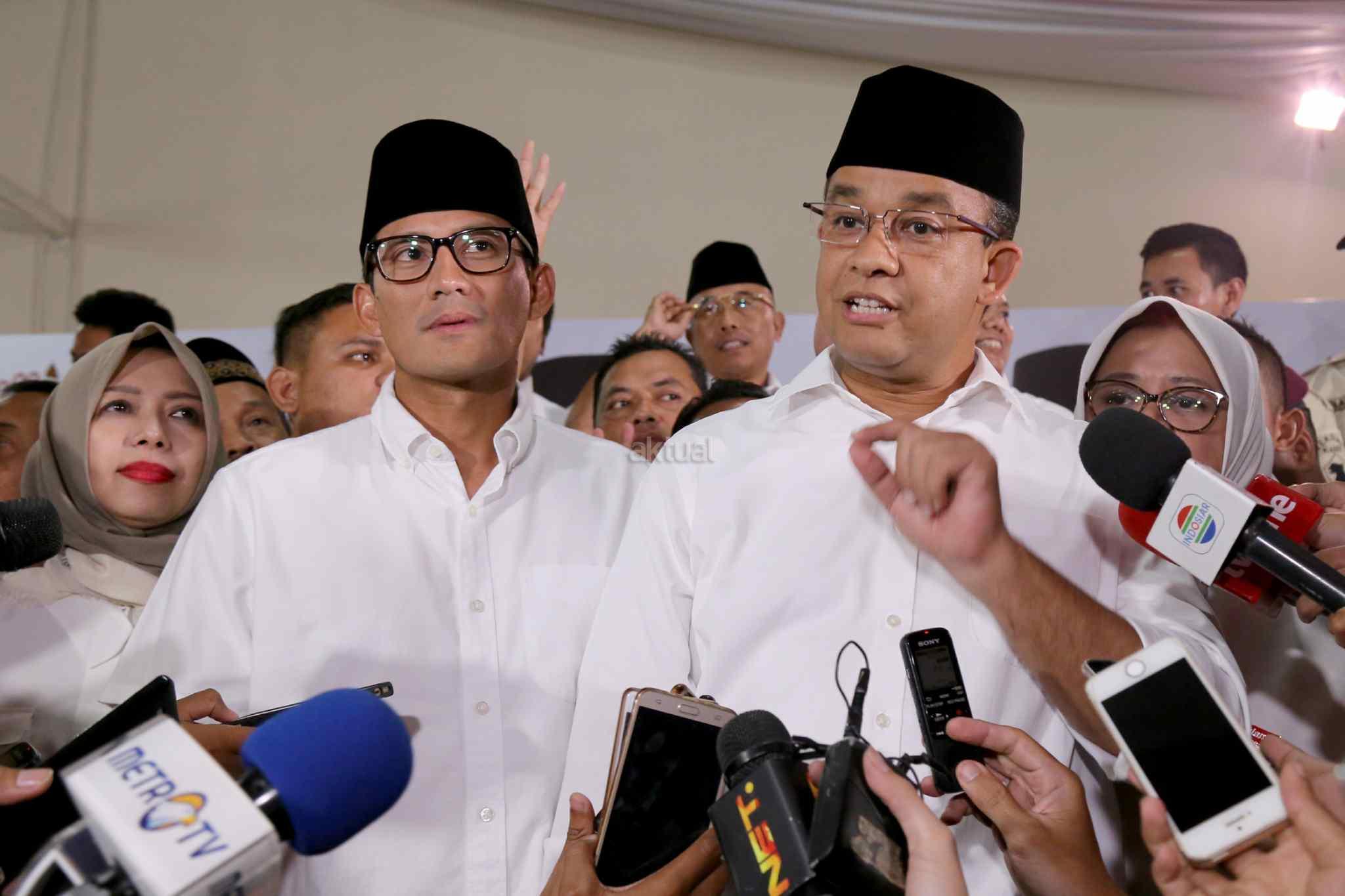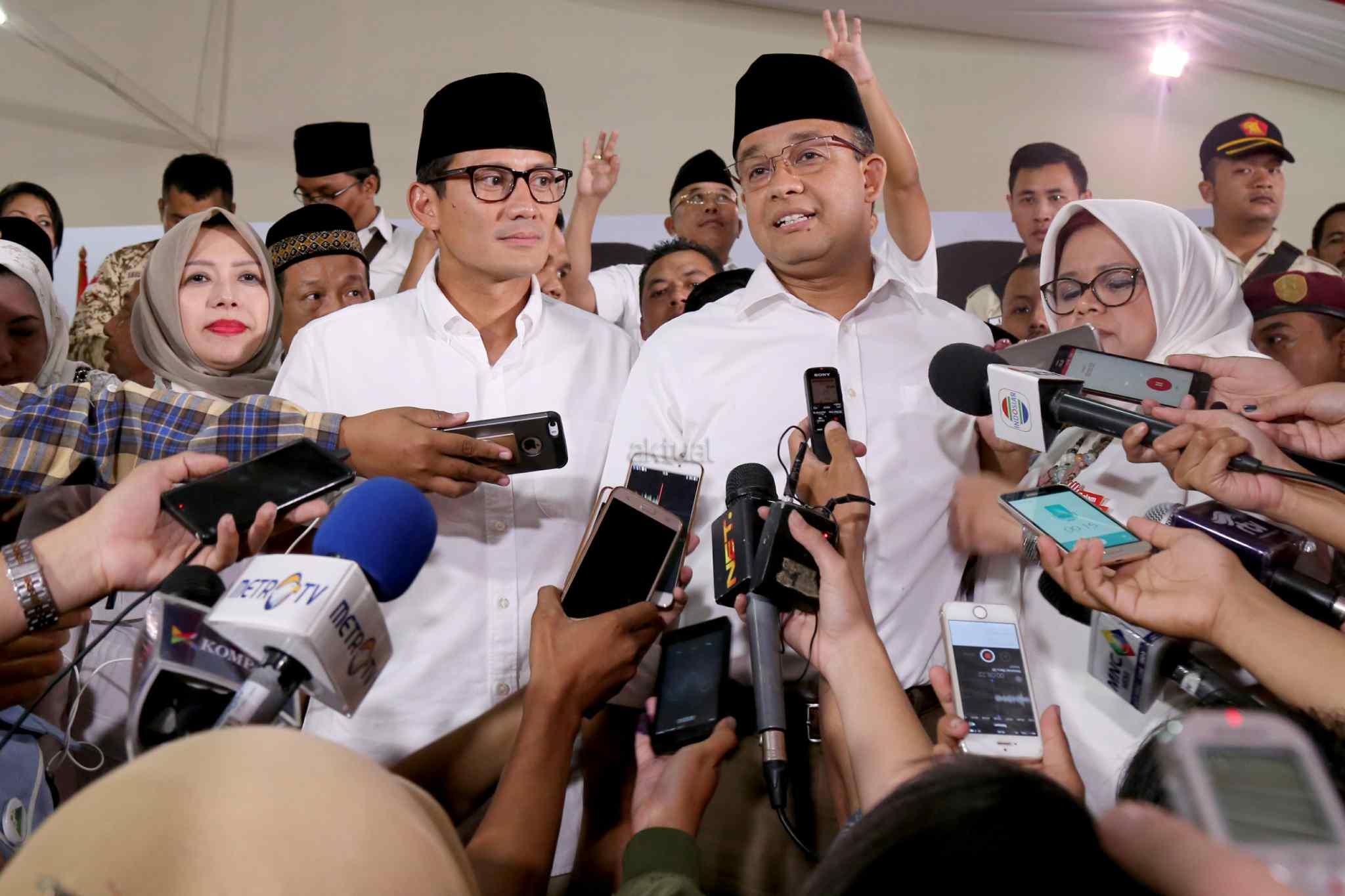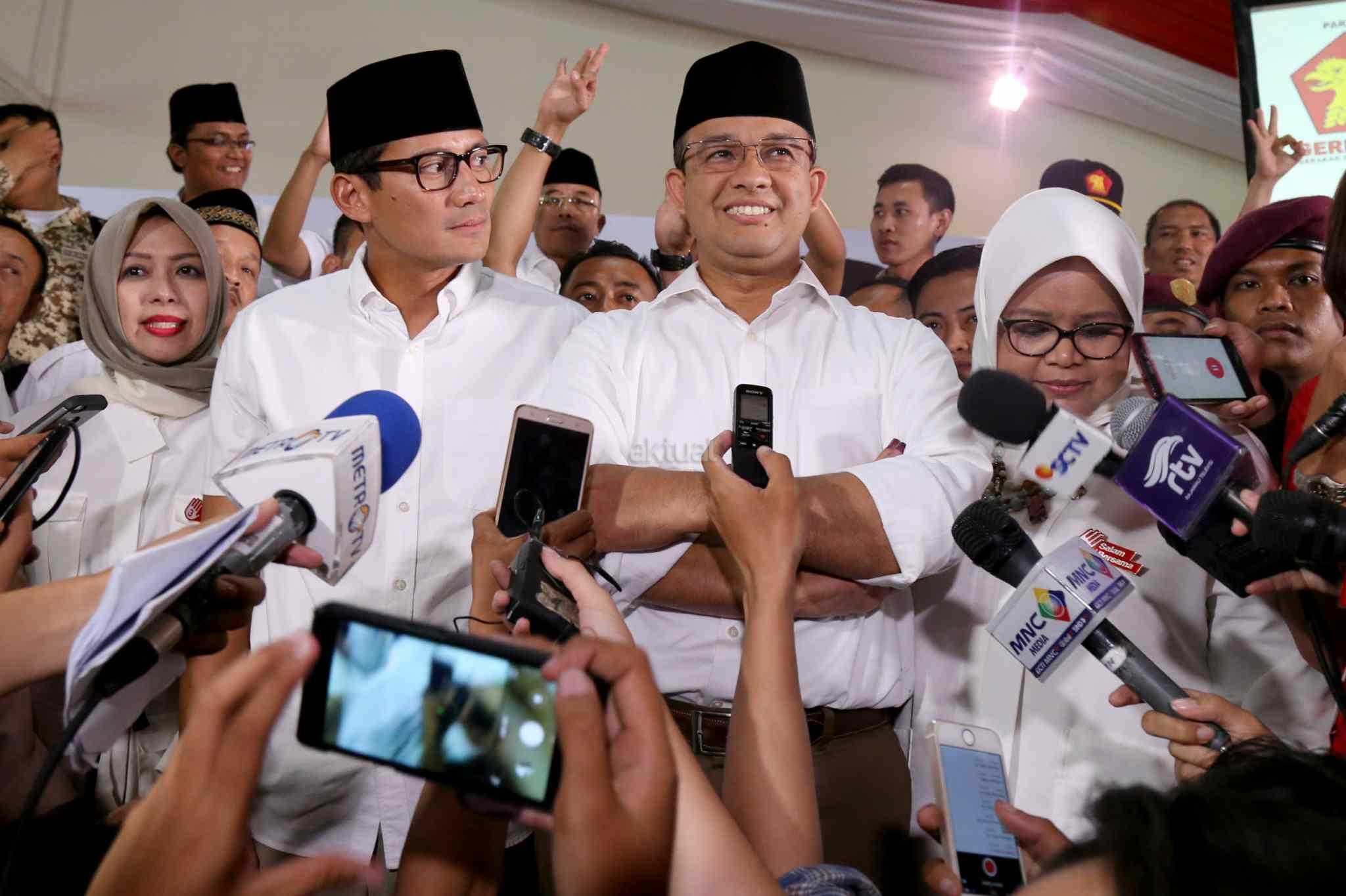Calon gubernur dan wakil gubernur DKI, Anies Baswedan dan Sandiaga Uno memberikan keterangan di DPP Gerindra, Jakarta, Rabu (15/2). Pilkada DKI merupakan simbol ‘pertarungan’ dua kekuatan. “Pilkada, DKI khususnya sudah menjadi simbol pertarungan antara yang ingin memperjuangkan keadilan, kebenaran, kejujuran dan yang ingin membuktikan bahwa uang bisa menjajah seluruh rakyat Indonesia. AKTUAL/Tino Oktaviano