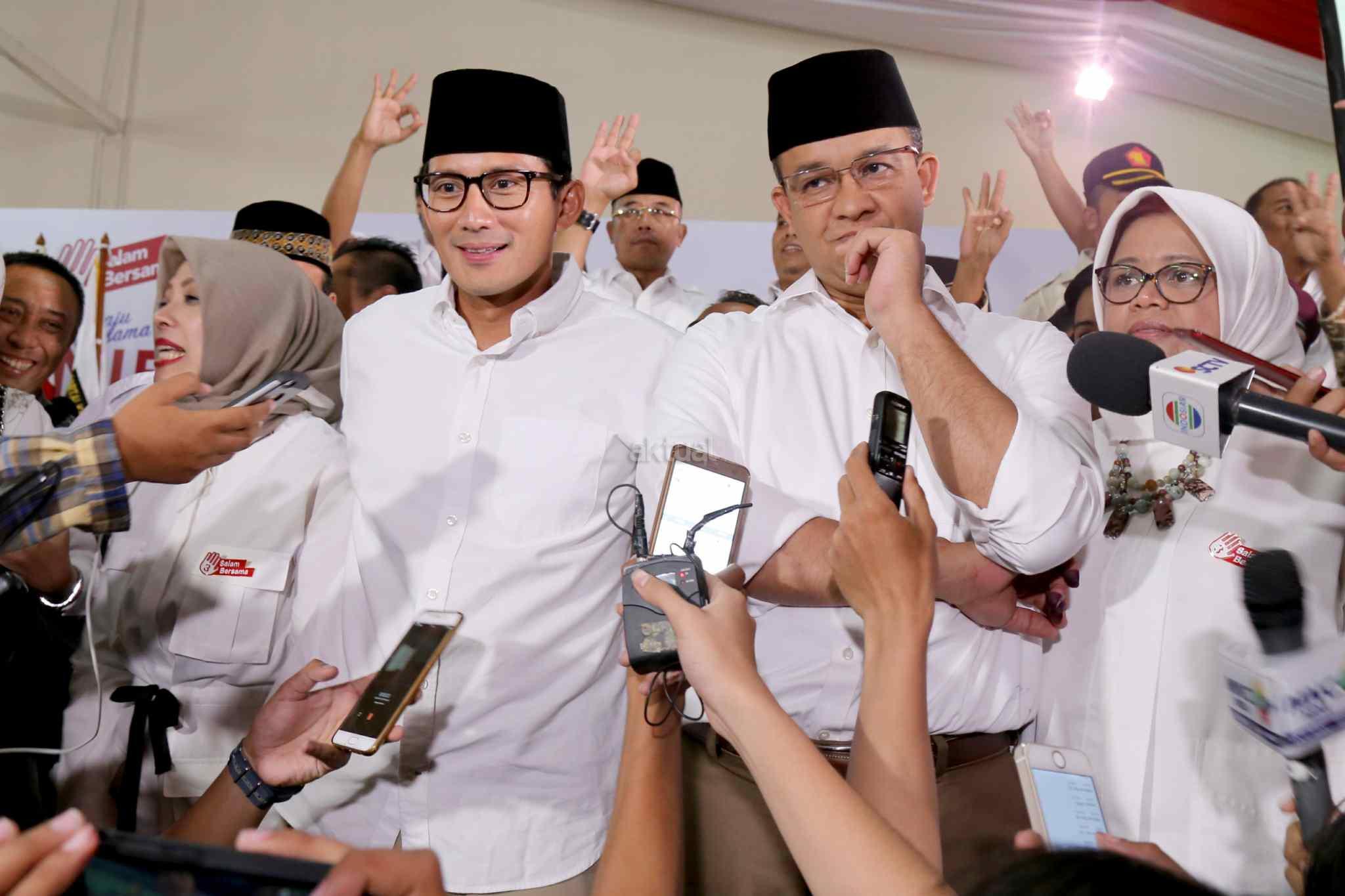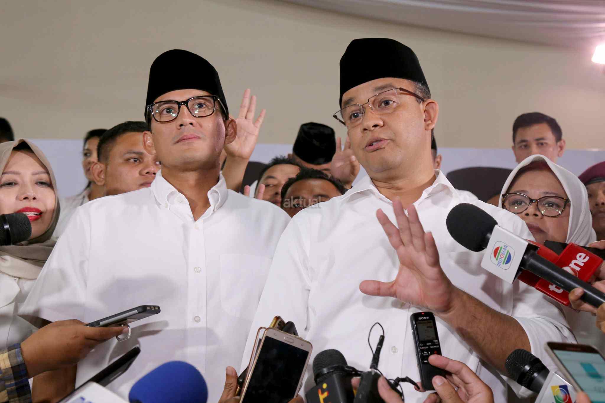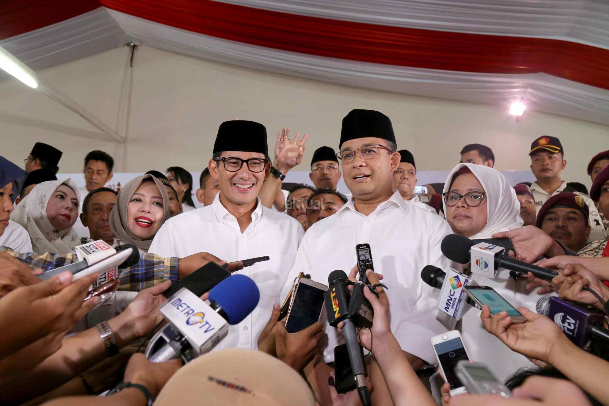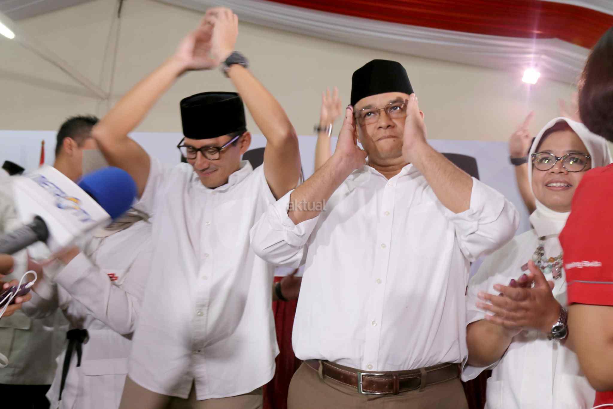 Calon gubernur dan wakil gubernur DKI, Anies Baswedan dan Sandiaga Uno memberikan keterangan di DPP Gerindra, Jakarta, Rabu (15/2). Pilkada DKI merupakan simbol ‘pertarungan’ dua kekuatan. “Pilkada, DKI khususnya sudah menjadi simbol pertarungan antara yang ingin memperjuangkan keadilan, kebenaran, kejujuran dan yang ingin membuktikan bahwa uang bisa menjajah seluruh rakyat Indonesia. AKTUAL/Tino Oktaviano