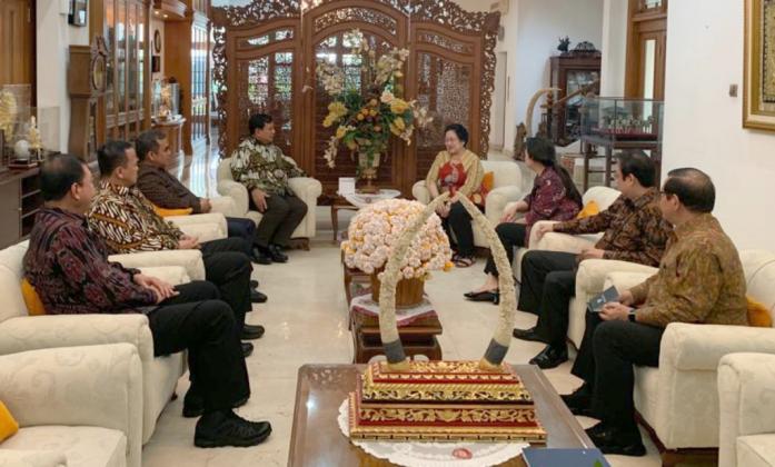 Ketum Gerindra Prabowo Subianto dan Ketum PDIP Megawati Soekarnoputri didampingi Kepala Badan Intelijen Nasional (BIN) Budi Gunawan, Menteri PMK Puan Maharani, Ketua DPP PDIP Bidang Ekonomi Kreatif Prananda Prabowo, Sekjen Partai Gerindra Ahmad Muzani dan Politikus senior PDIP Pramono Anung saat bertemu di kediaman Mega jalan Teuku Umar, Menteng, Jakarta Pusat, Rabu (24/7/2019). Pertemuan ini merupakan pertemuan dua tokoh politik yang integritasnya luar biasa dan sangat menjunjung tinggi komitmen dalam pentas politik nasional. AKTUAL/IST