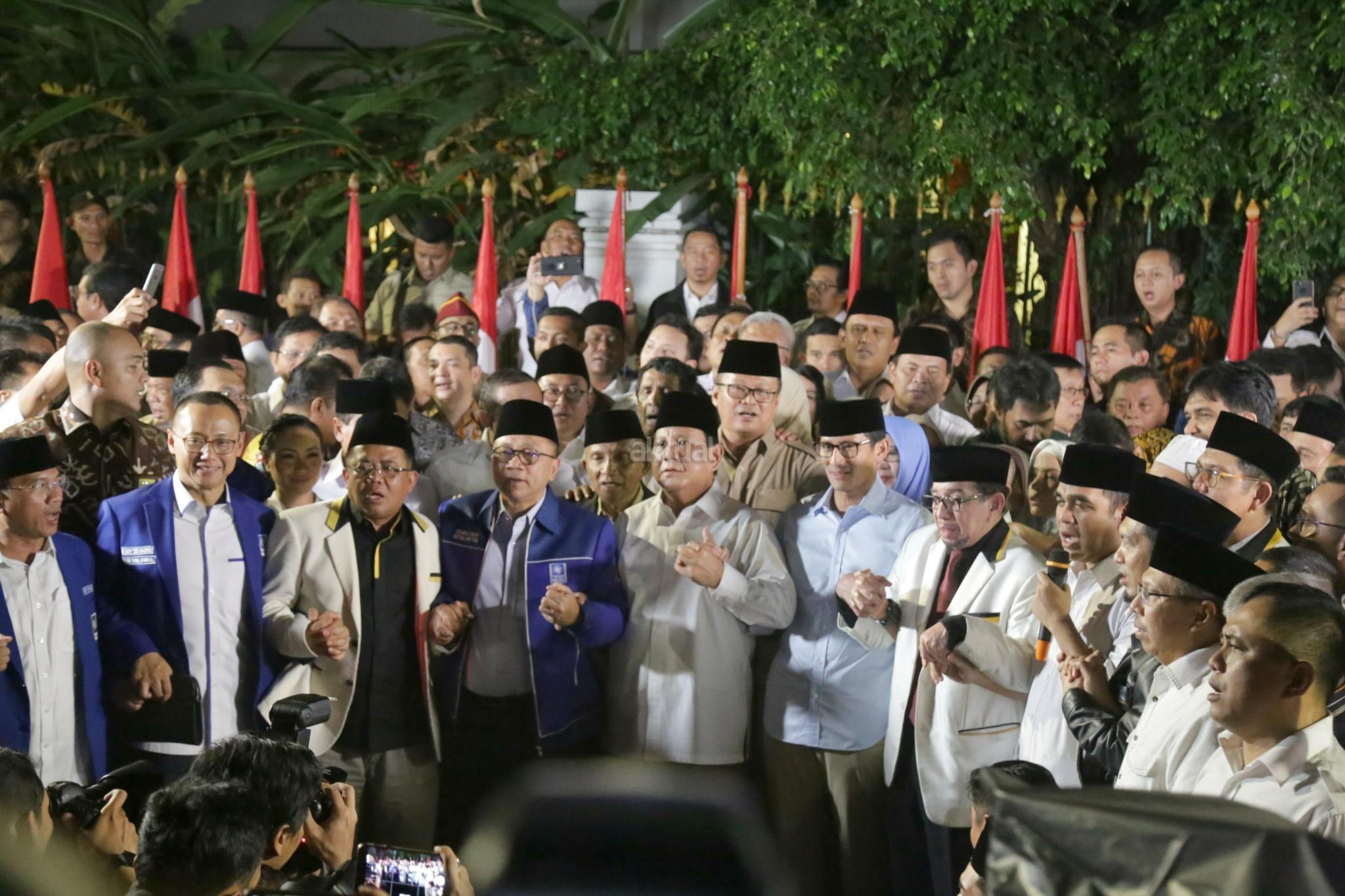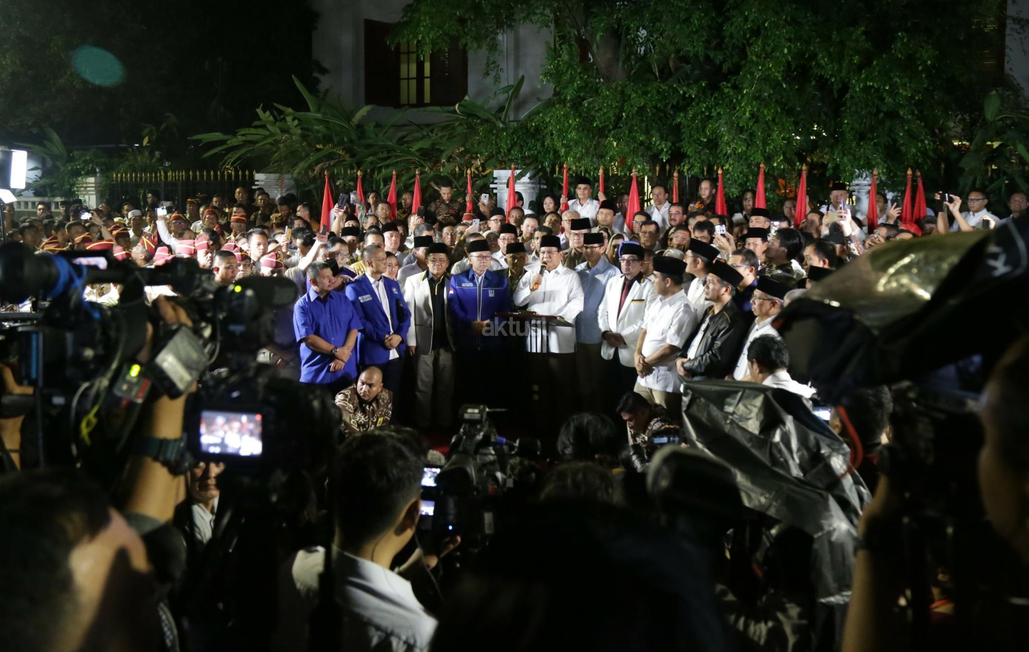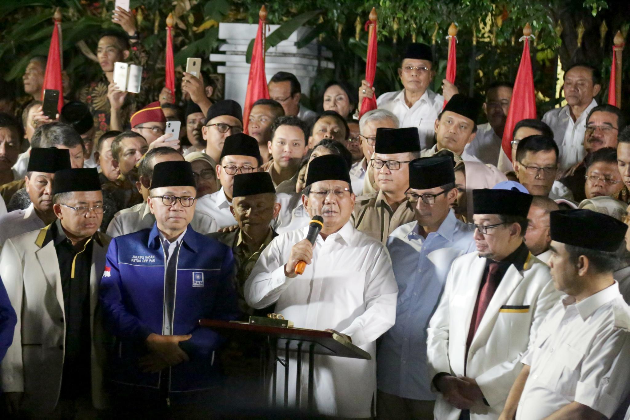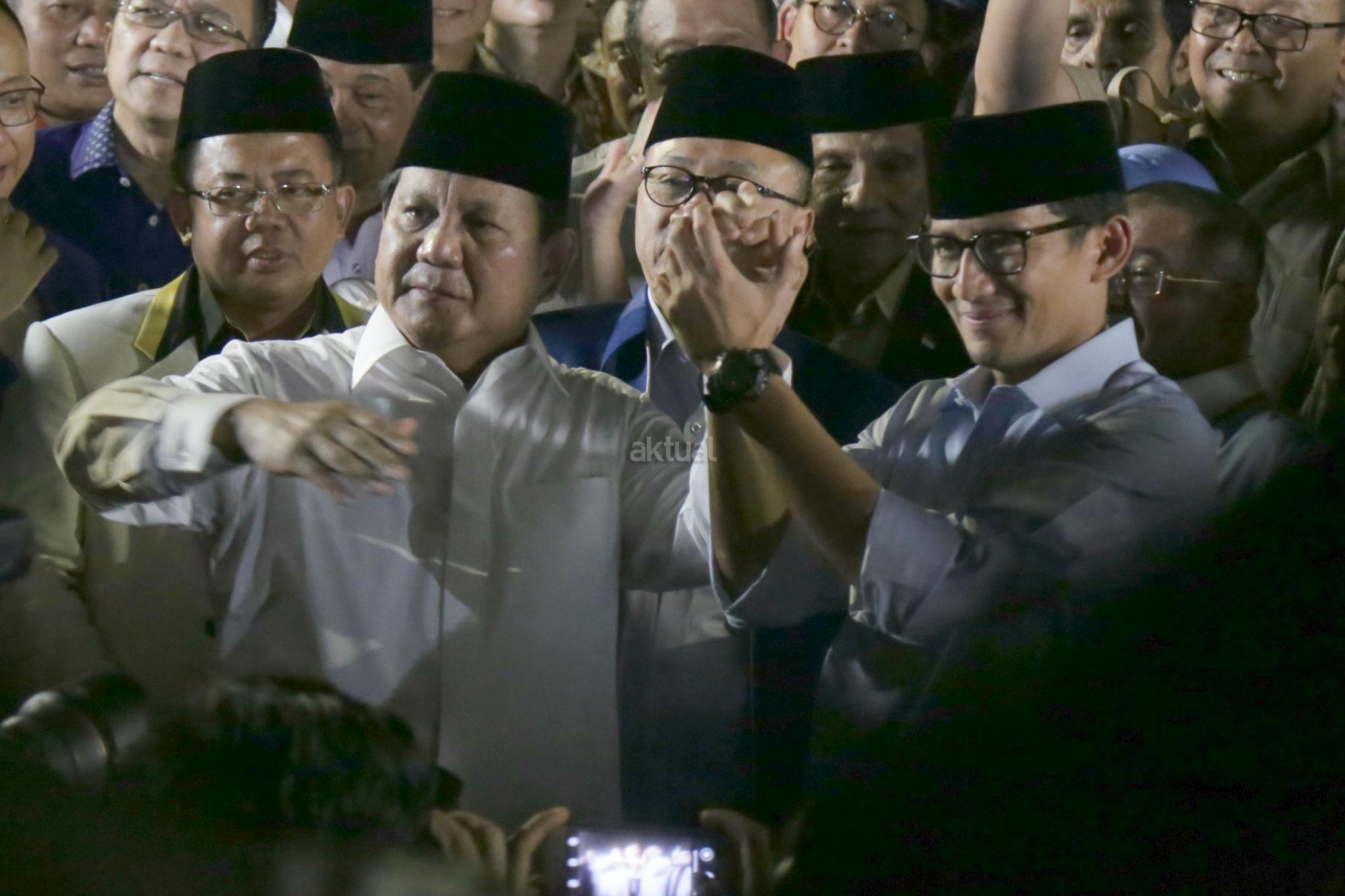 Ketua Umum Partai Gerindra Prabowo Subianto didampingi Wakil Gubernur DKI Jakarta Sandiaga Uno memberikan keterangan pers di kediaman Prabowo, Jalan Kertanegara, Jakarta, Kamis (9/8) malam. Prabowo dan Sandiaga Uno resmi maju mencalonkan diri sebagai pasangan capres dan cawapres pada Pilpres 2019. AKTUAL/Tino Oktaviano