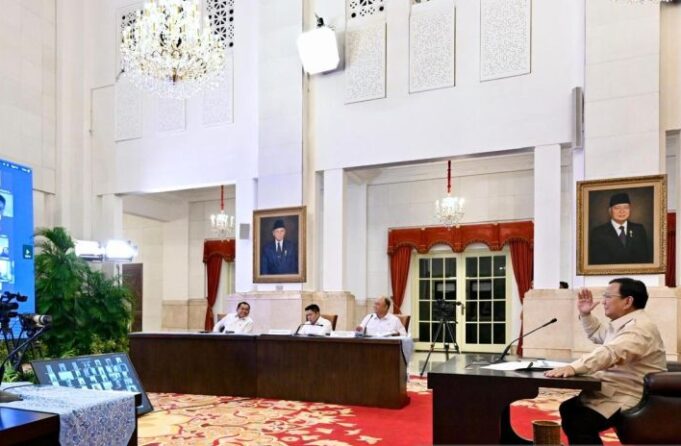 Presiden Prabowo Subianto mengecek kondisi sejumlah sarjana penggerak pembangunan Indonesia (SPPI) melalui sambungan video conference dari ruangan kerjanya di Kompleks Istana Kepresidenan, Jakarta, Selasa (18/2/2025).