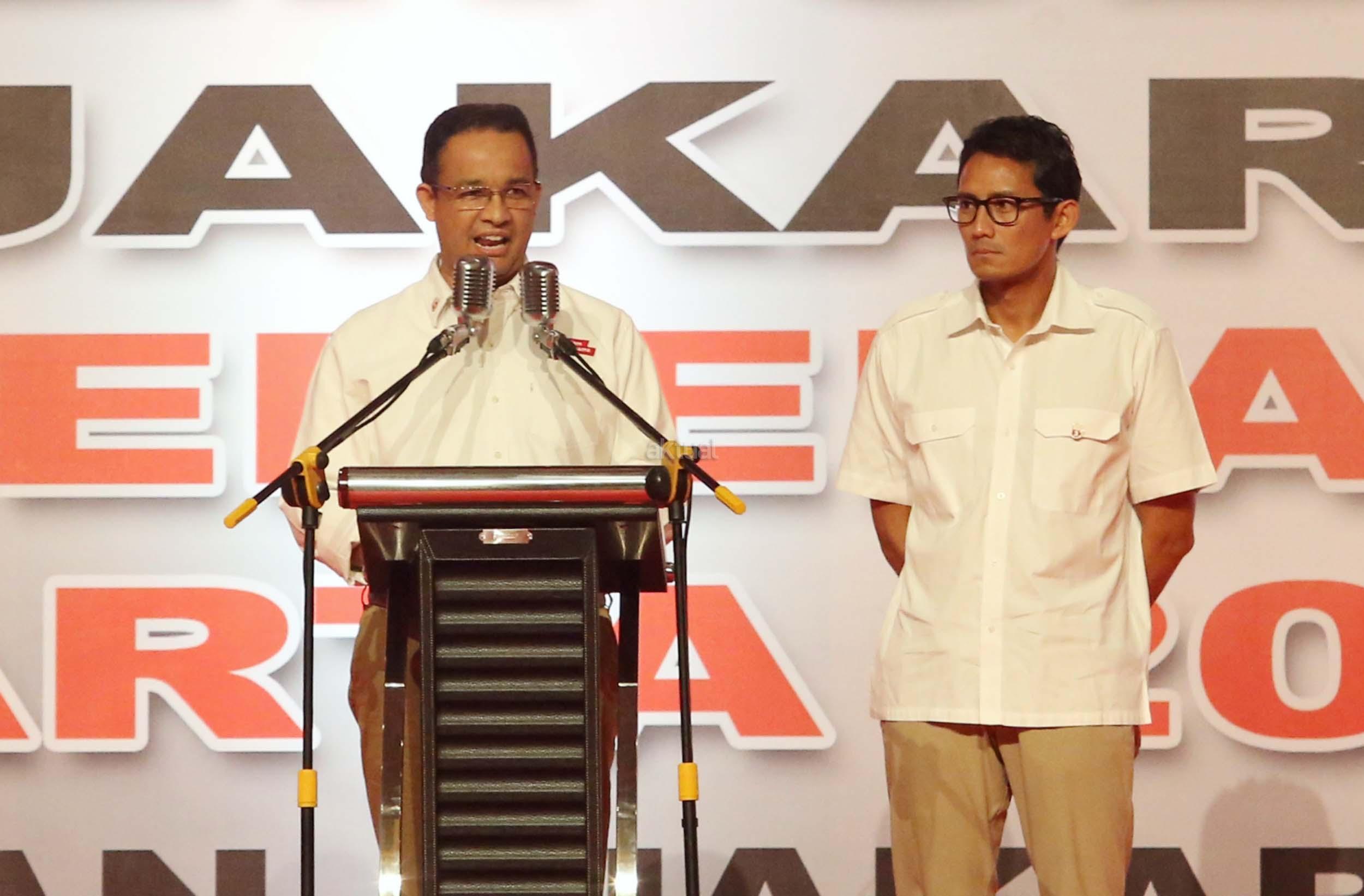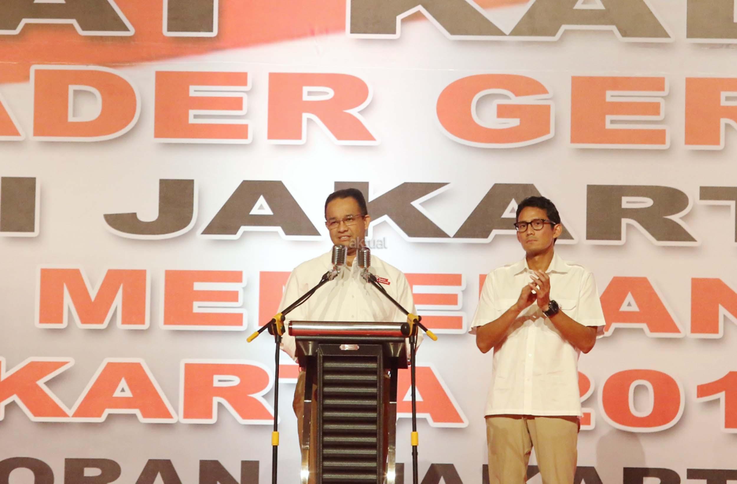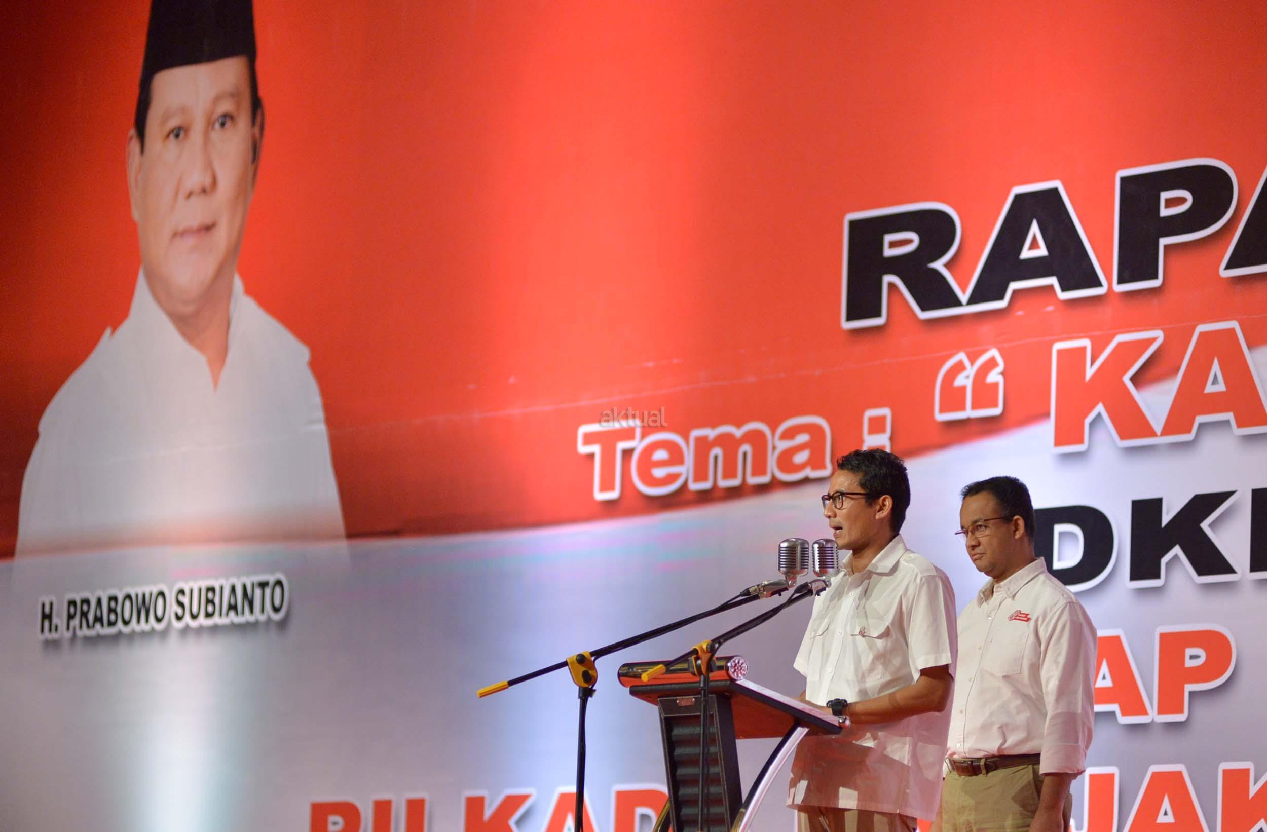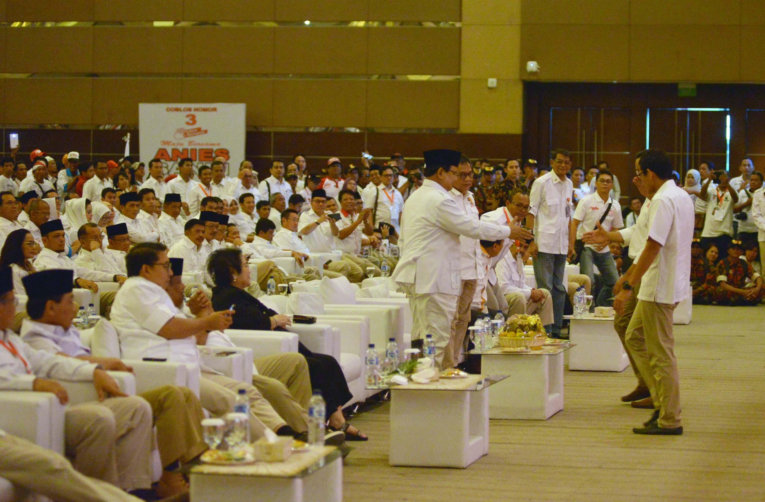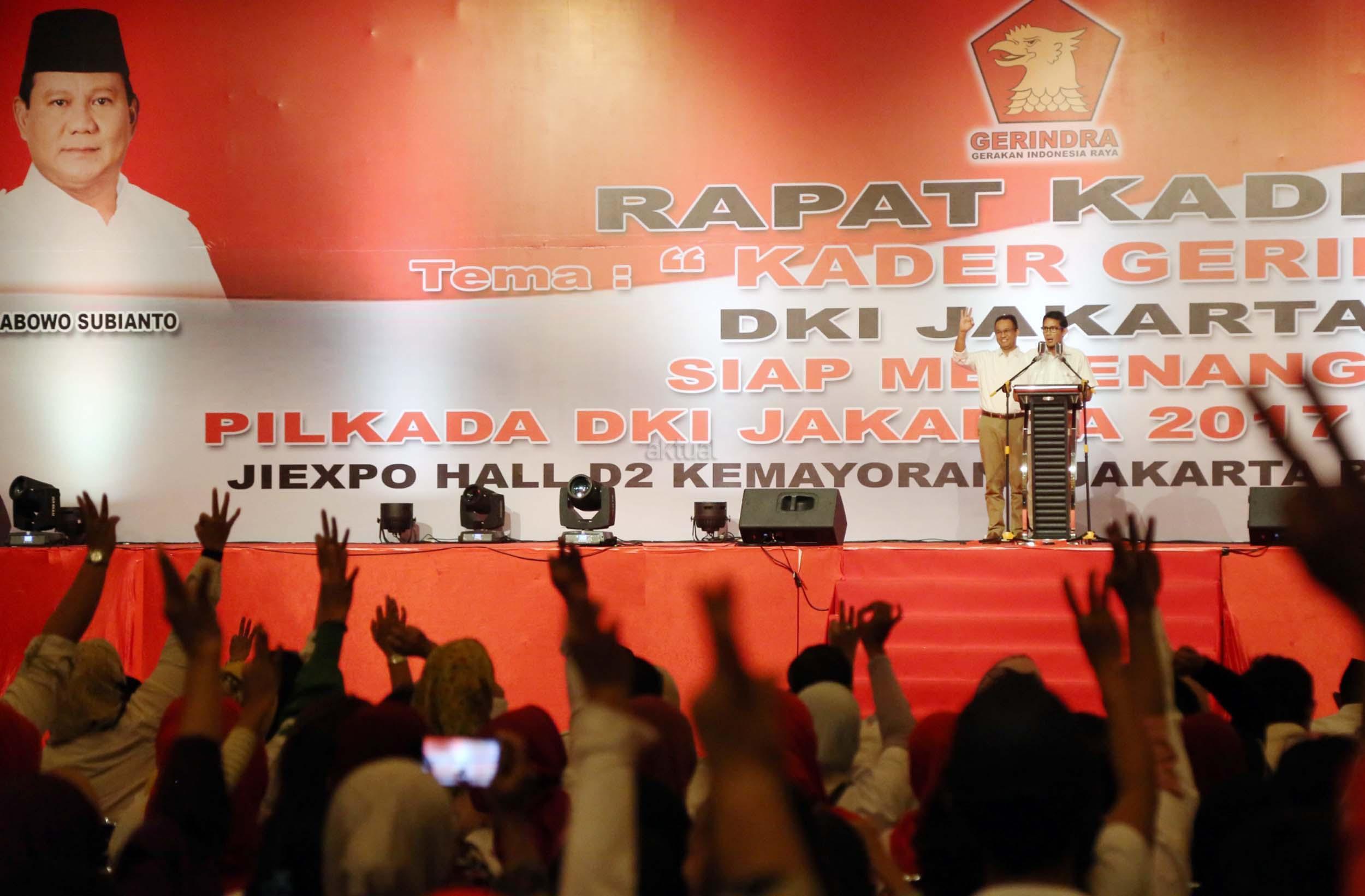 Pasangan cagub DKI nomor urut 3, Anies Baswedan dan Sandiaga Uno, turut hadir di acara rapat akbar pemenangan Anies-Sandi untuk Pilgub DKI di JIExpo Kemayoran, Minggu (8/1/2017).Rapat Akbar DPD Gerindra DKI Jakarta ini mengambil tema besar ‘Kader Gerindra DKI Jakarta Siap Memenangkan Pilkada DKI Jakarta 2017 dan Pilpres 2019. AKTUAL/Munzir
