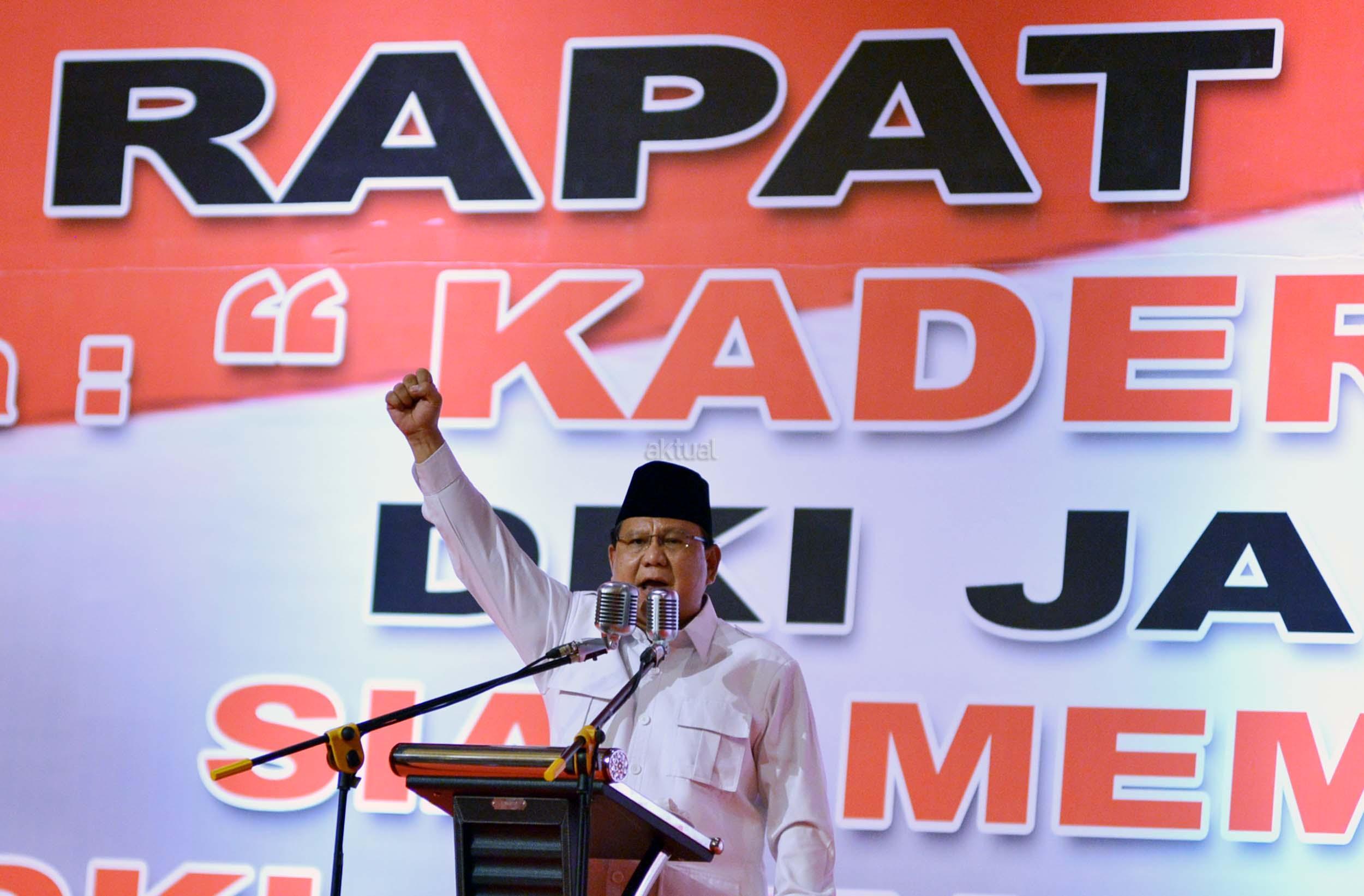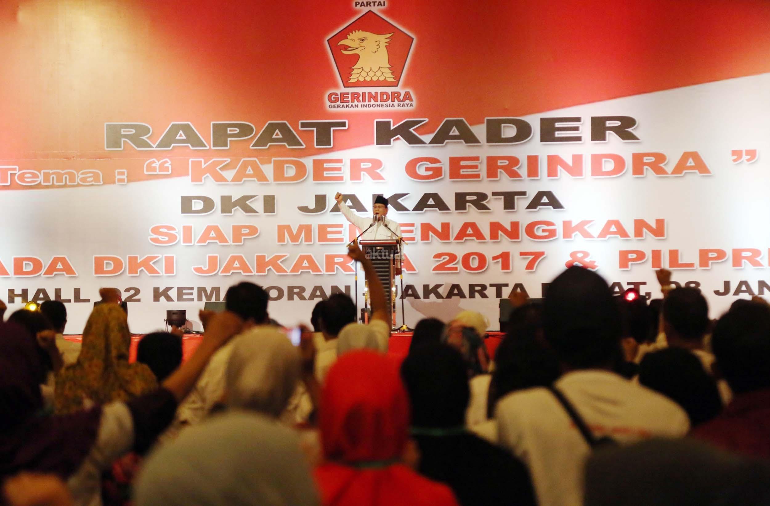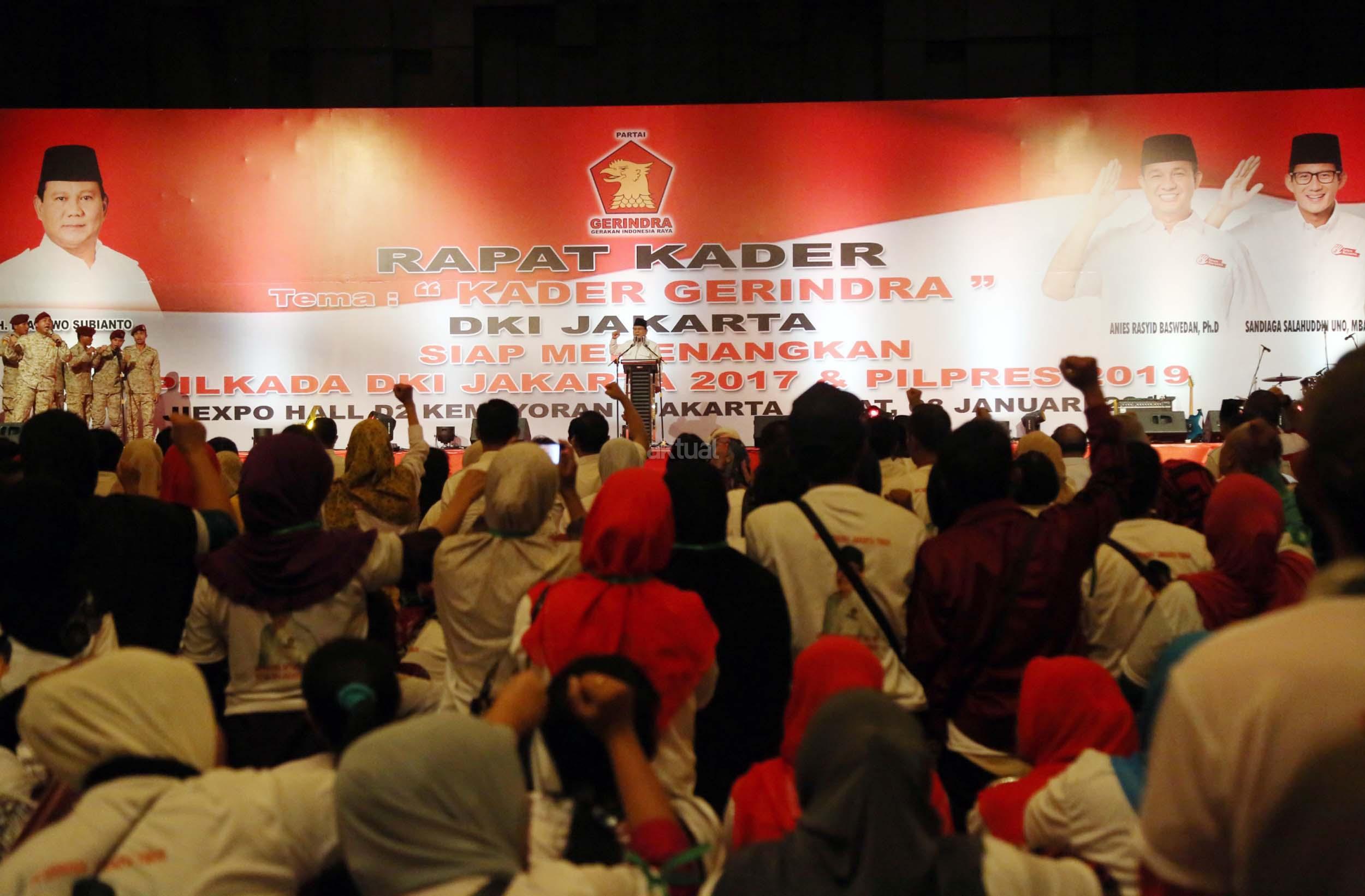 Ketua Umum Partai Gerindra Prabowo Subianto memimpin rapat akbar pemenangan Anies-Sandi untuk Pilgub DKI di JIExpo Kemayoran, Minggu (8/1/2017). Rapat Akbar DPD Gerindra DKI Jakarta ini mengambil tema besar 'Kader Gerindra DKI Jakarta Siap Memenangkan Pilkada DKI Jakarta 2017 dan Pilpres 2019'. AKTUAL/Munzir