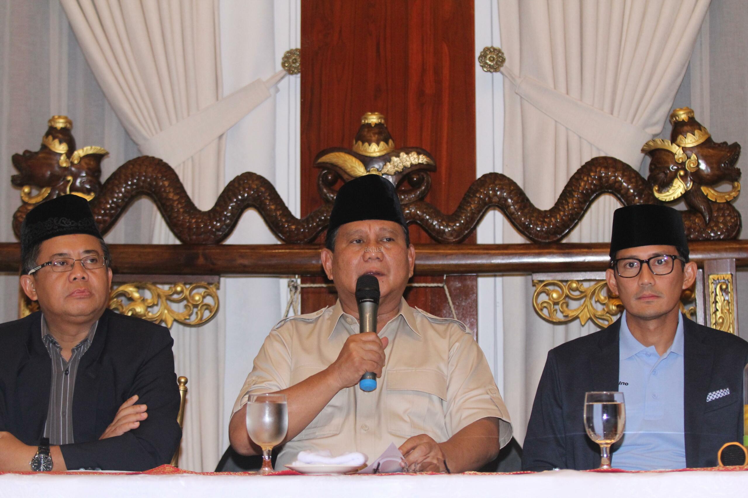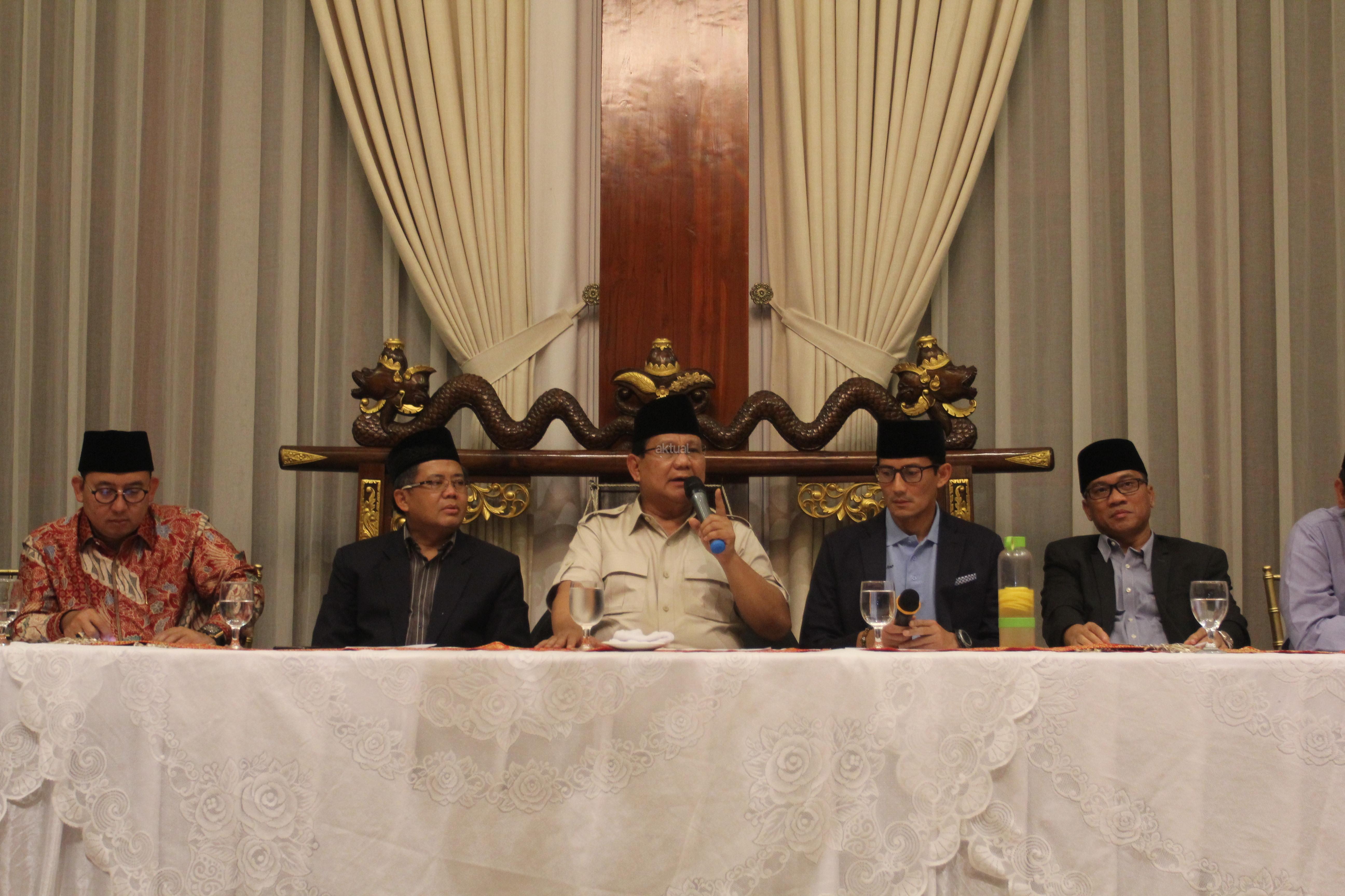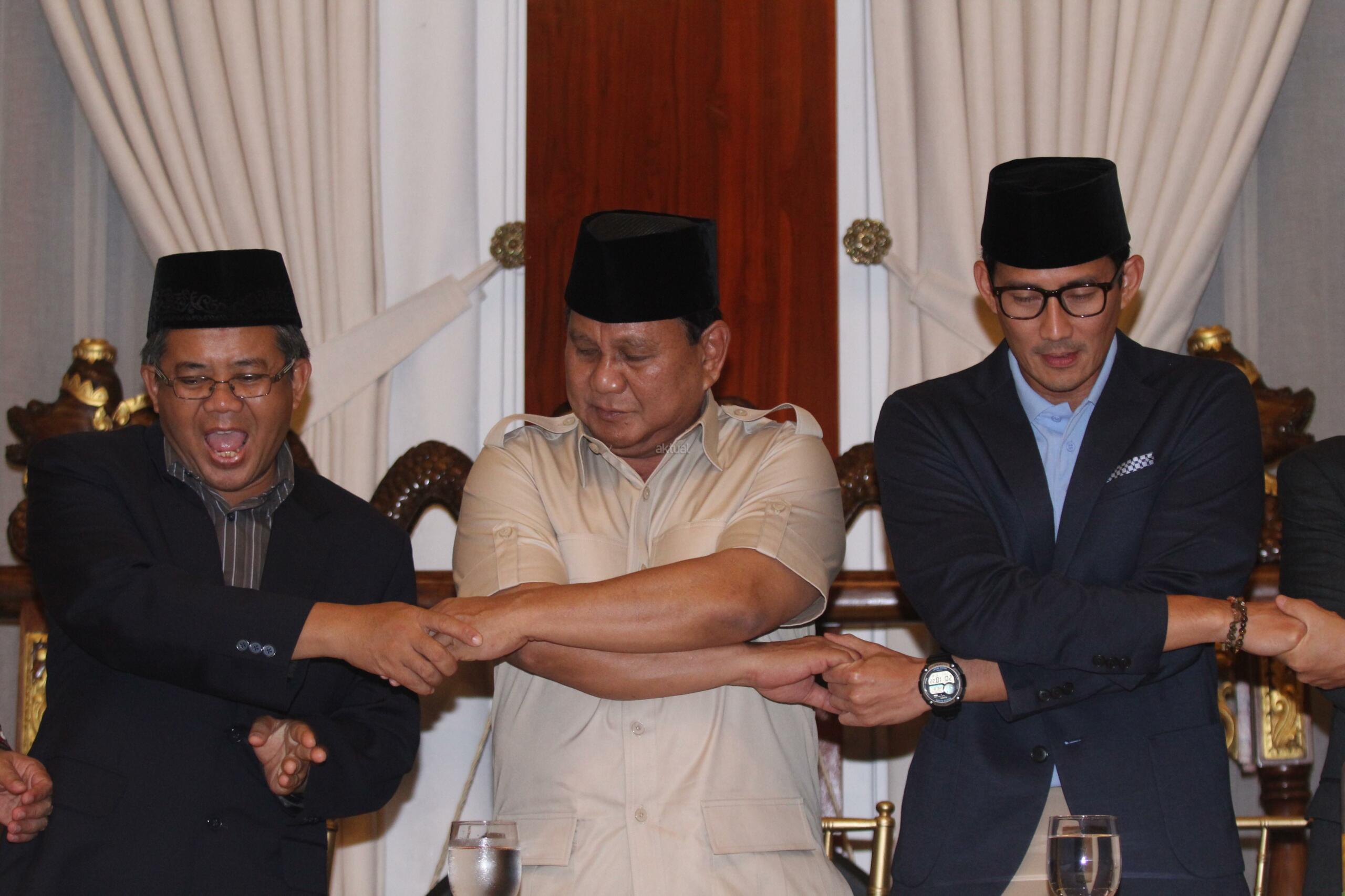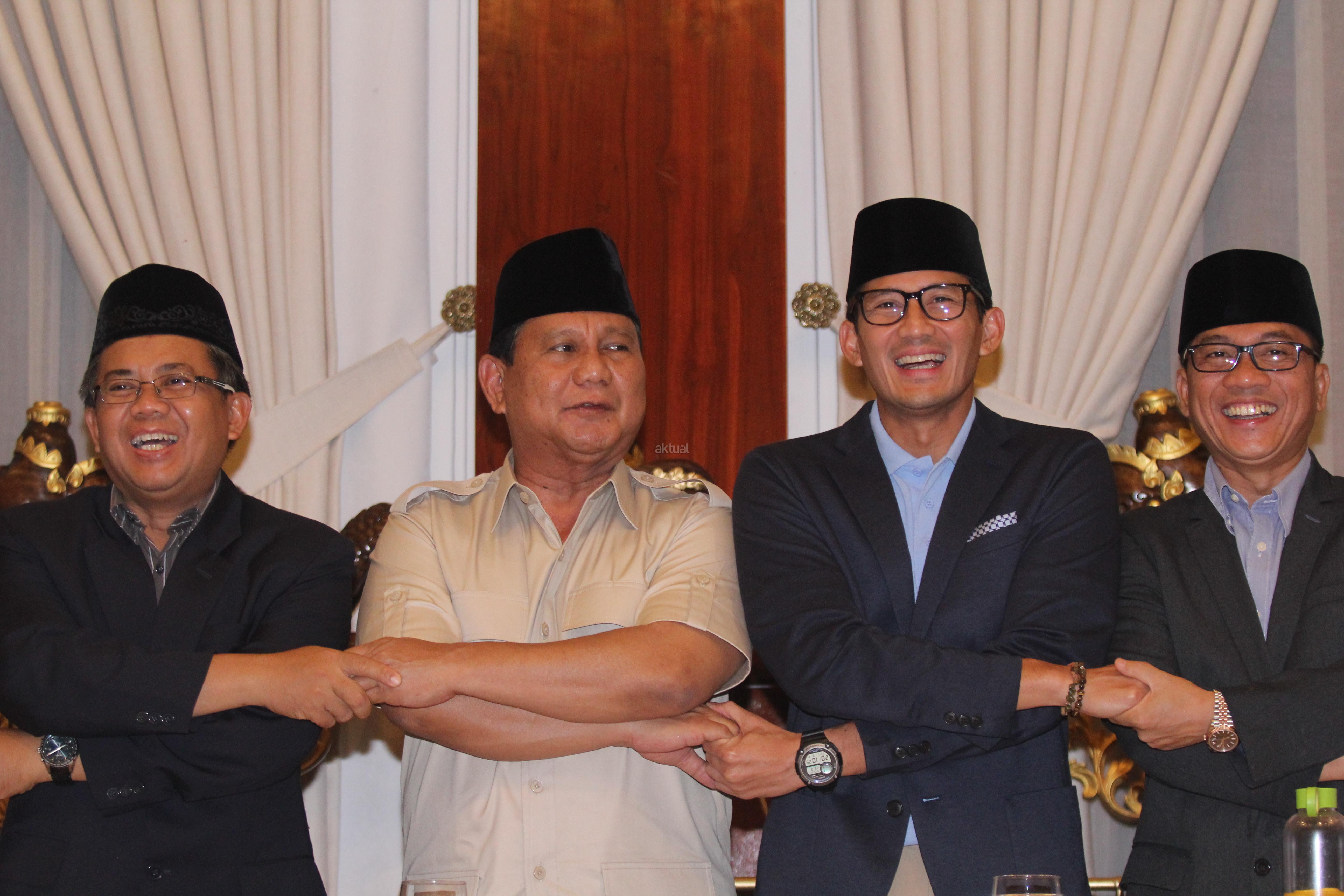 Bakal Calon Presiden Prabowo Subianto (kedua kiri) bersama dengan Bakal Calon Wakil Presiden Sandiaga Uno (kedua kanan), Presiden PKS Sohibul Iman (kiri) dan Ketua DPP PAN Yandri Susanto (kanan) bergandeng tangan usai memberikan keterangan pers mengenai pandangan kondisi perekonomian bangsa di Rumah Kertanegara, Jakarta, Jumat (7/9). Dalam keterangan persnya Prabowo-Sandi beserta koalisi partai pengusung mengkritisi kondisi perekonomian bangsa pasca melemahnya nilai tukar rupiah terhadap dolar. AKTUAL/Tino Oktaviano