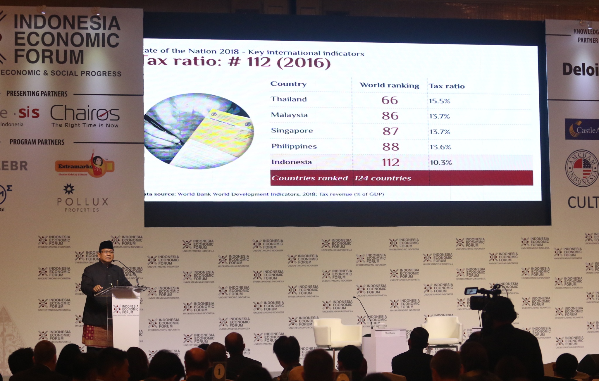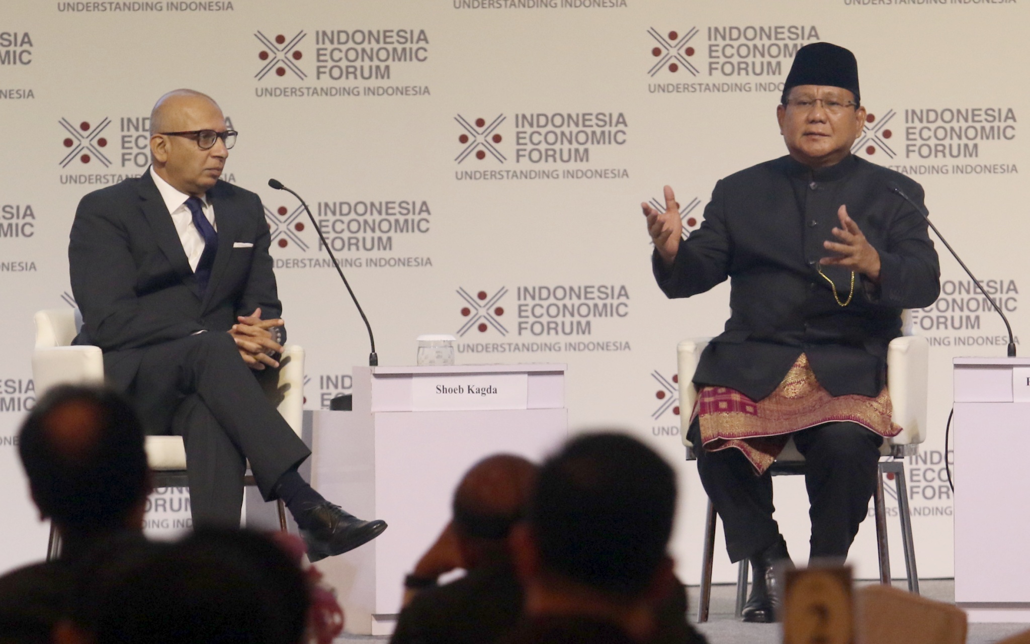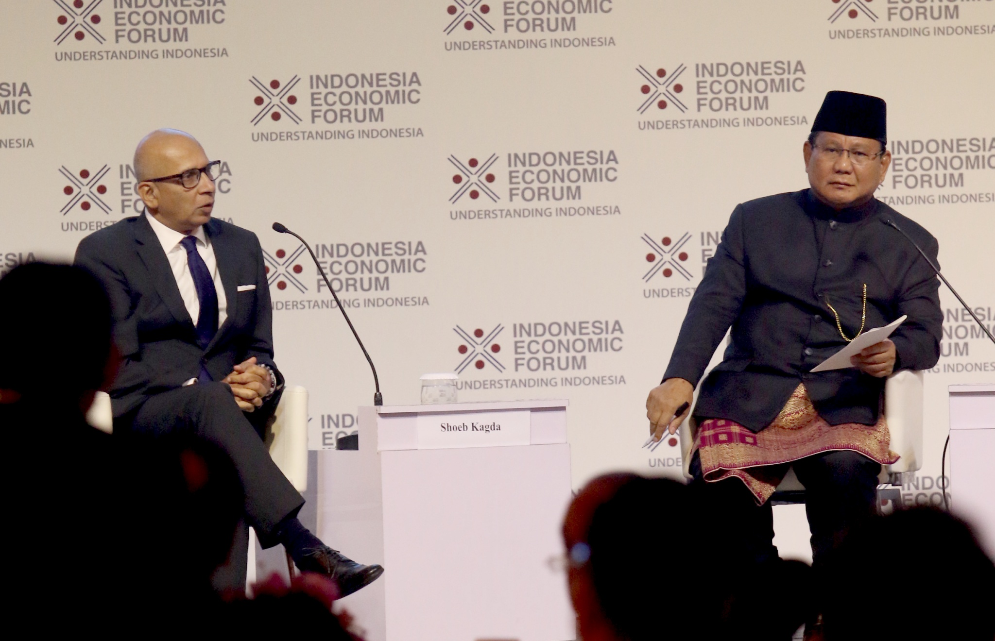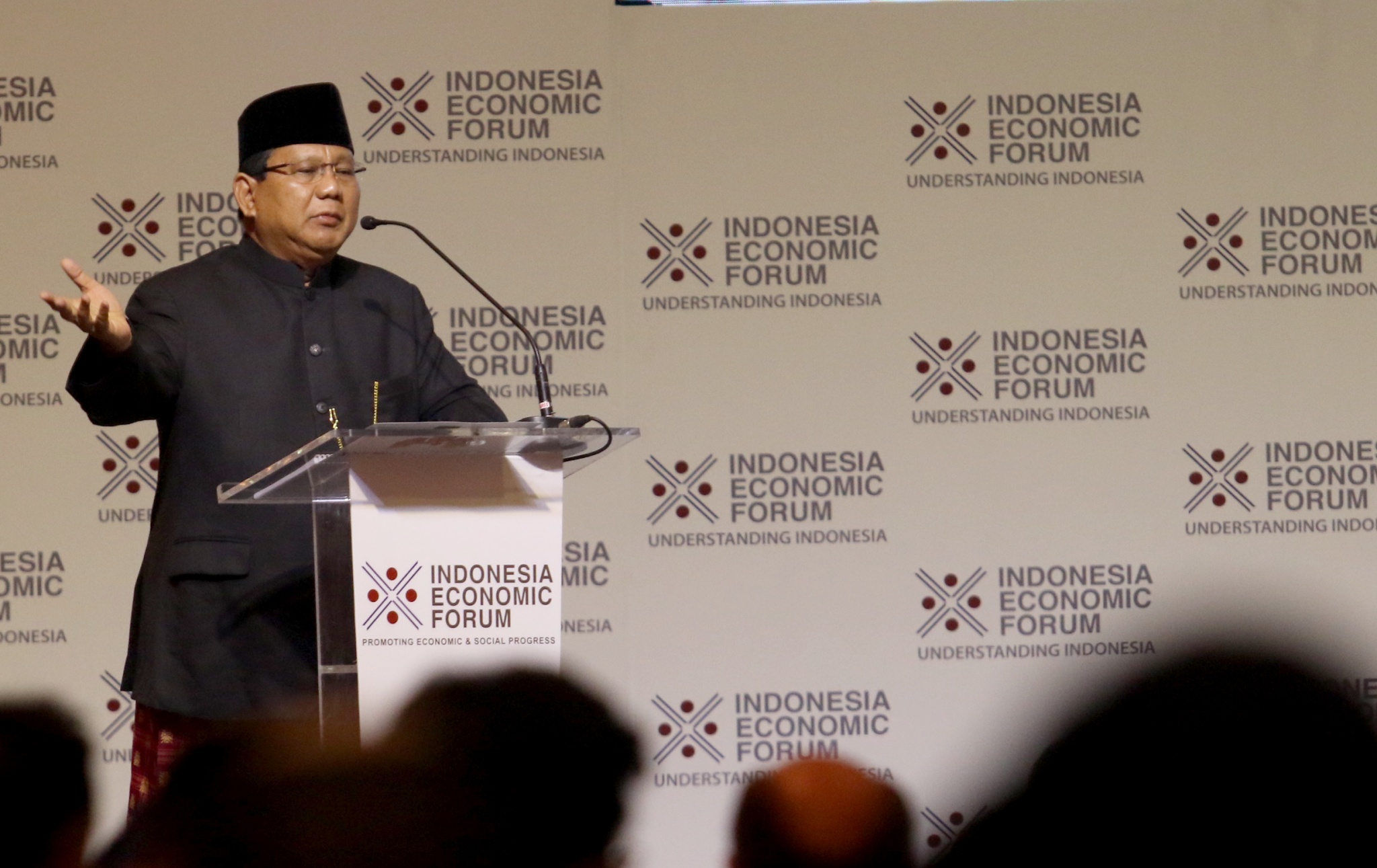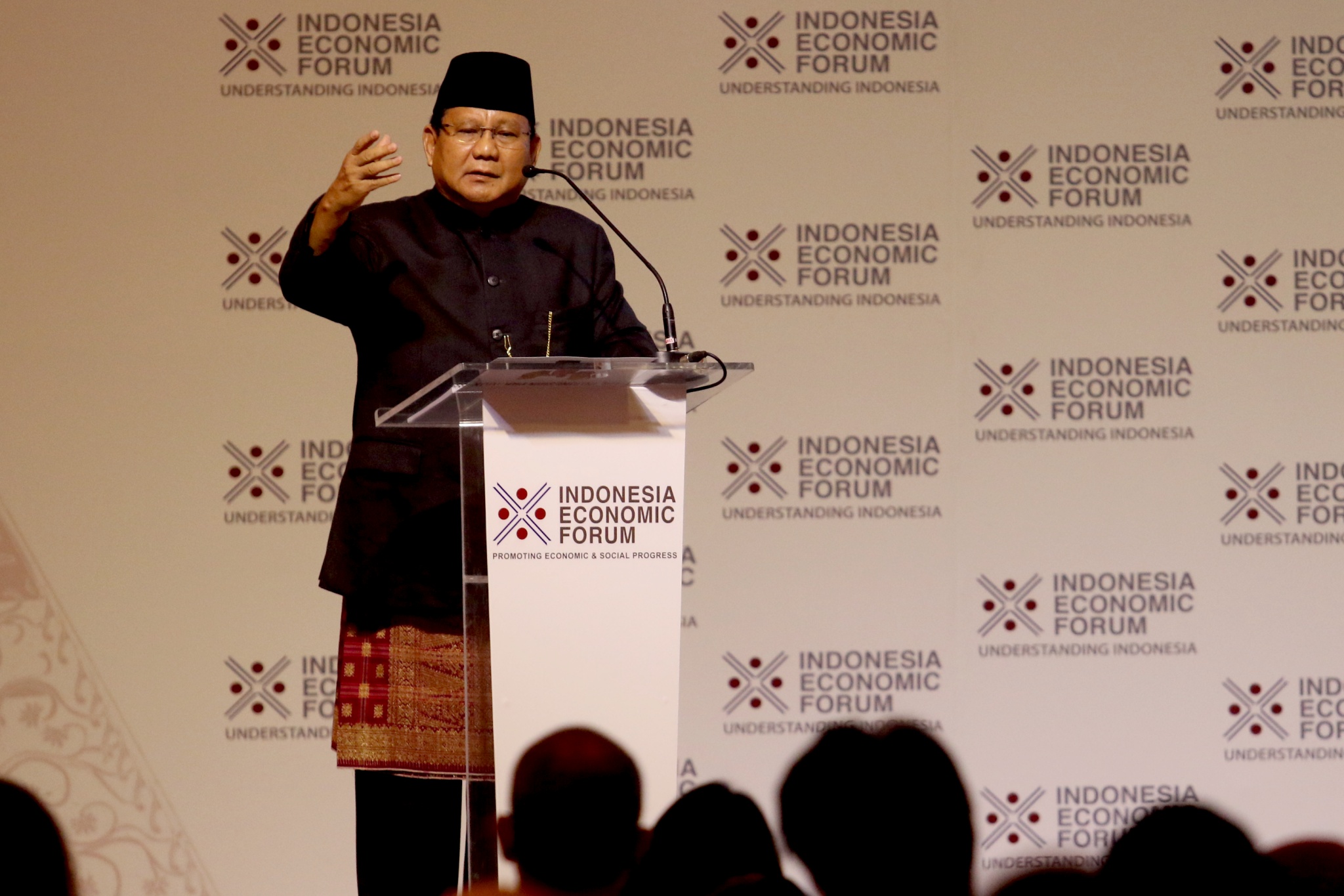 Calon Presiden nomor urut 02 Prabowo Subianto berbicara saat menghadiri Indonesia Economic Forum di Jakarta, Rabu (21/11). Dalam kesempatan tersebut Prabowo menyampaikan Paket Kebijakan Ekonomi XVI yang dikeluarkan pemerintahan Presiden Joko Widodo, memberikan peluang besar kepada pihak asing untuk masuk dan menguasai 28 sektor industri di dalam negeri. Paket kebijakan ekonomi tersebut tidak sesuai dengan UUD 1945, terutama pada Pasal 33 Ayat 1 dan 2 yang berbunyi bahwa bahwa prekonomian disusun sebagai usaha bersama berdasar atas asas kekeluargaan. AKTUAL/Tino Oktaviano