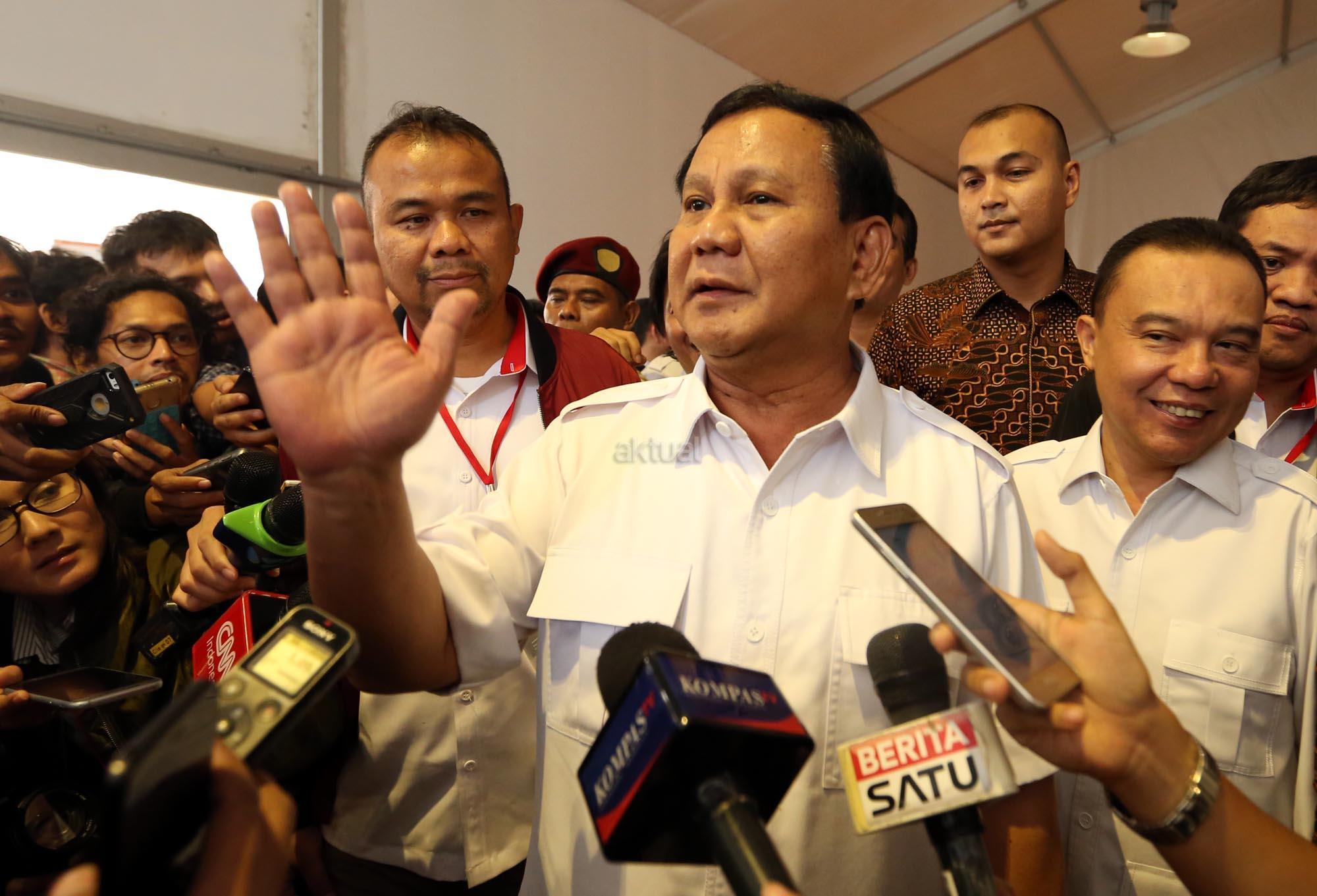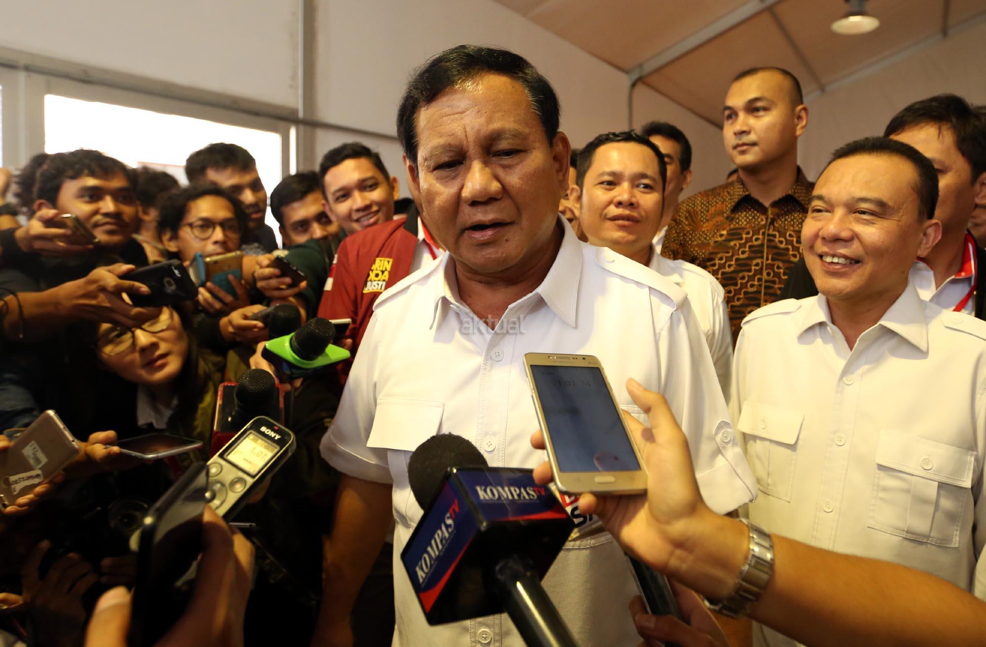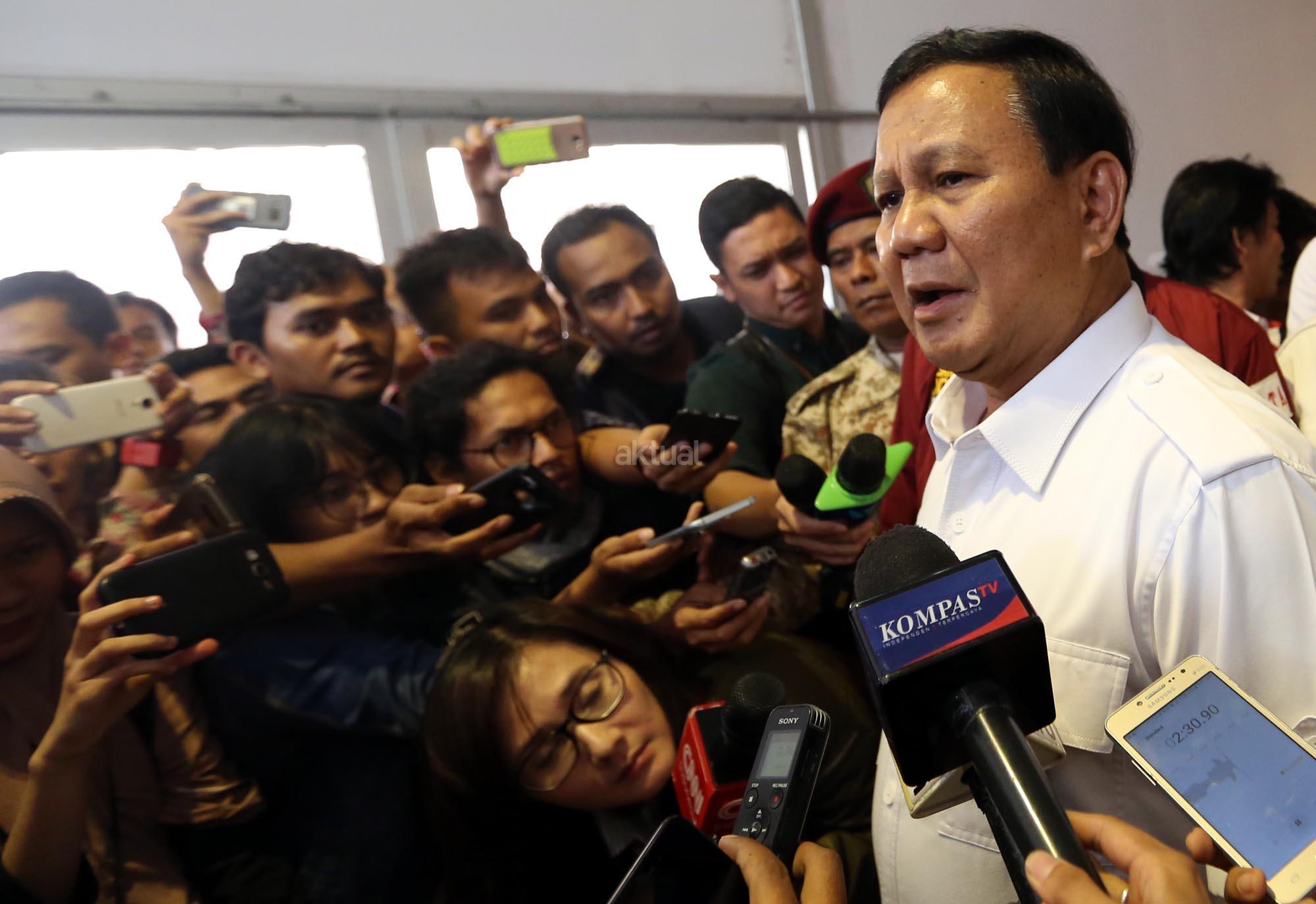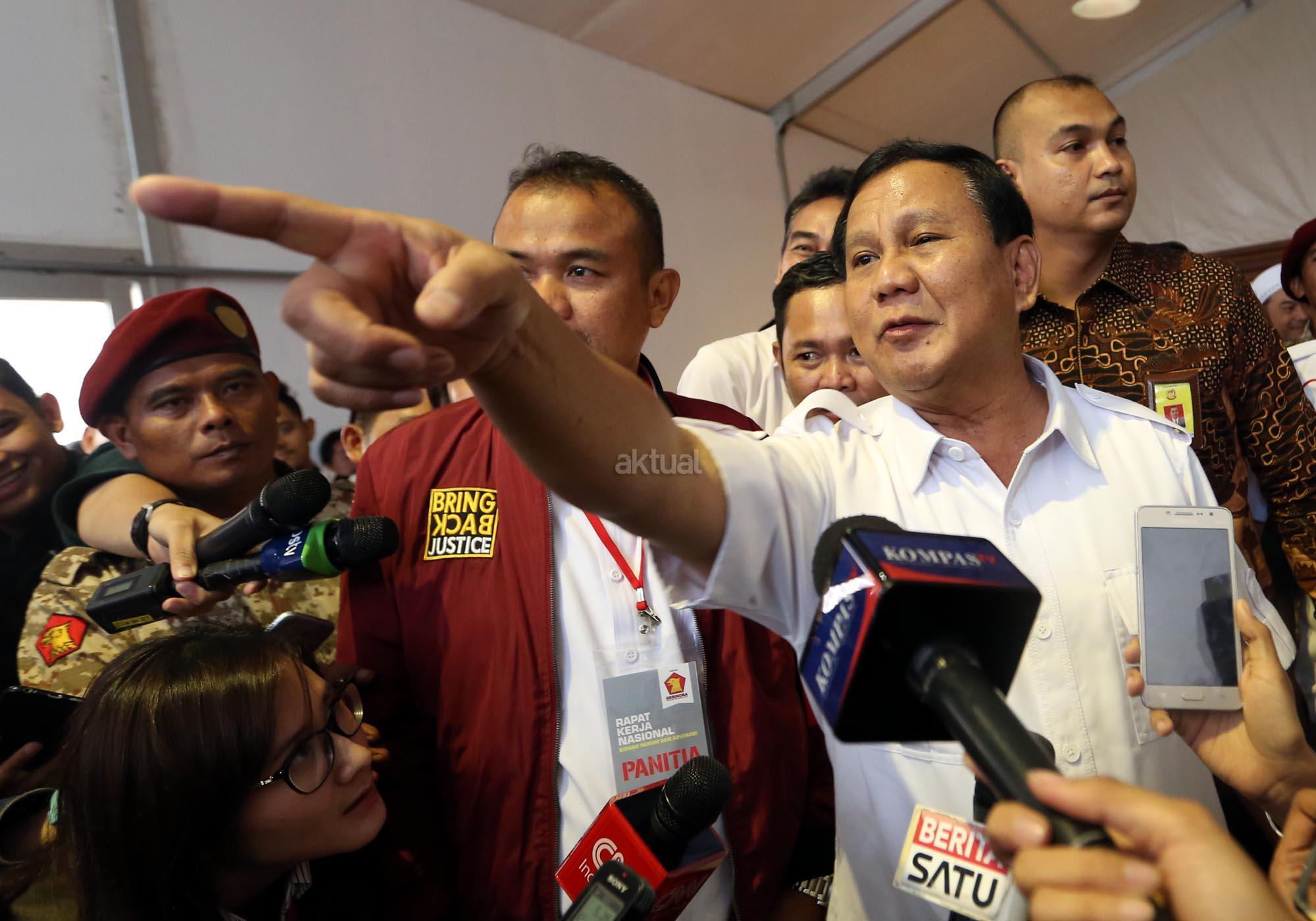 Ketua Umum Partai Gerindra Prabowo Subianto menjawab pertanyaan wartawan saat menghadiri Rapat Kerja Nasional (Rakernas) Partai Gerindra, di Hotel Sultan, Jakarta, Kamis (5/4/18). Prabowo memastikan tidak ada agenda pendeklarasian dirinya untuk maju pada Pilpres 2019 dalam Rapat Koordinasi Nasional (Rakornas) Partai Gerindra. AKTUAL/Tino Oktaviano