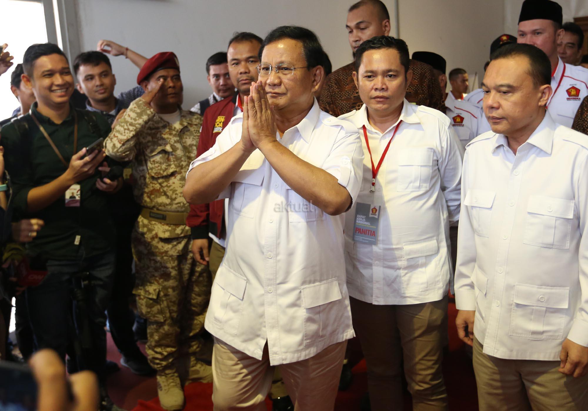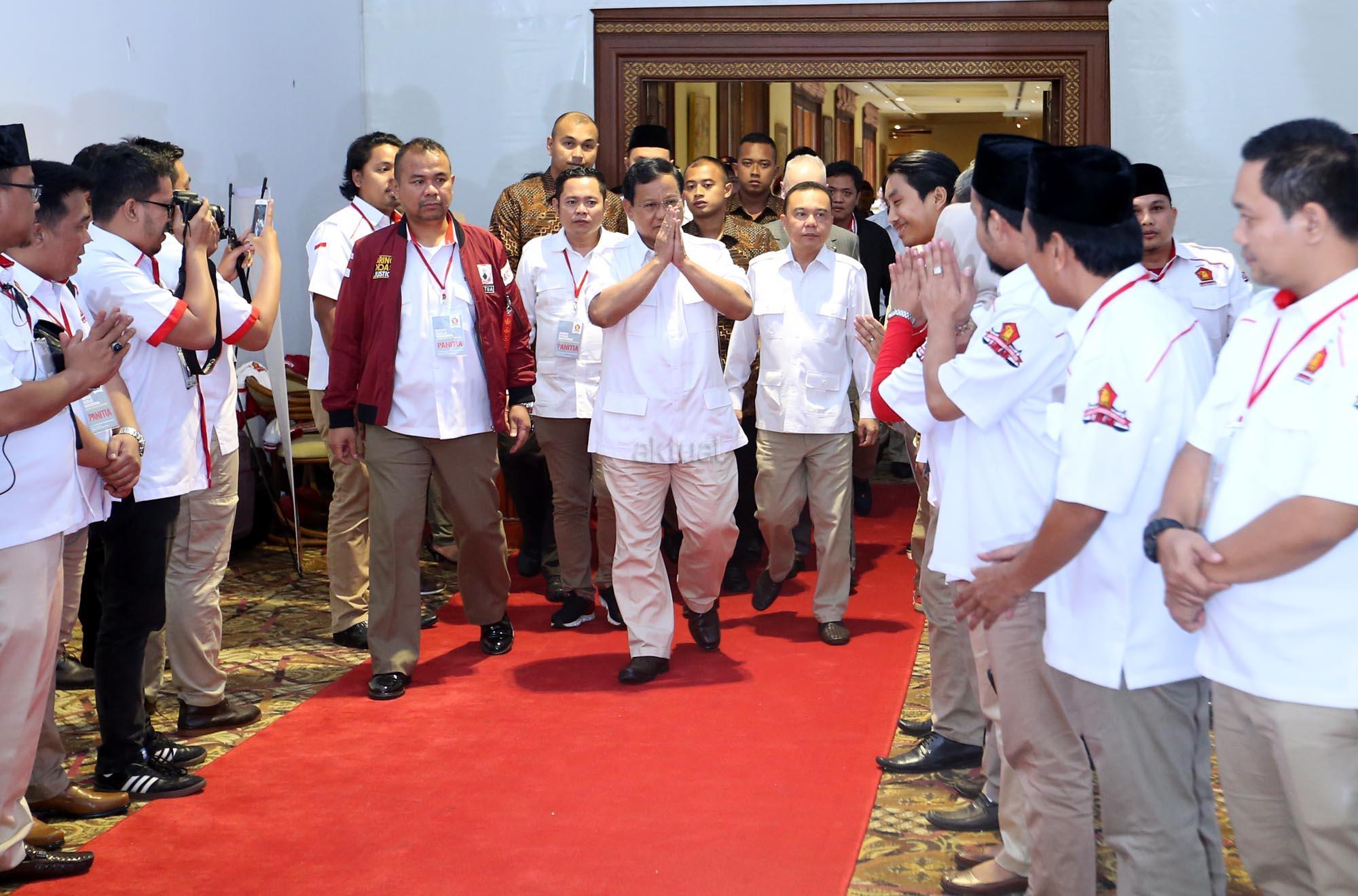Ketua Umum Partai Gerindra Prabowo Subianto menyapa kadernya saat menghadiri Rapat Kerja Nasional (Rakernas) Partai Gerindra, di Hotel Sultan, Jakarta, Kamis (5/4/18). Prabowo memastikan tidak ada agenda pendeklarasian dirinya untuk maju pada Pilpres 2019 dalam Rapat Koordinasi Nasional (Rakornas) Partai Gerindra. AKTUAL/Tino Oktaviano