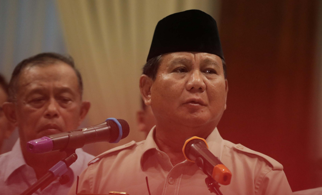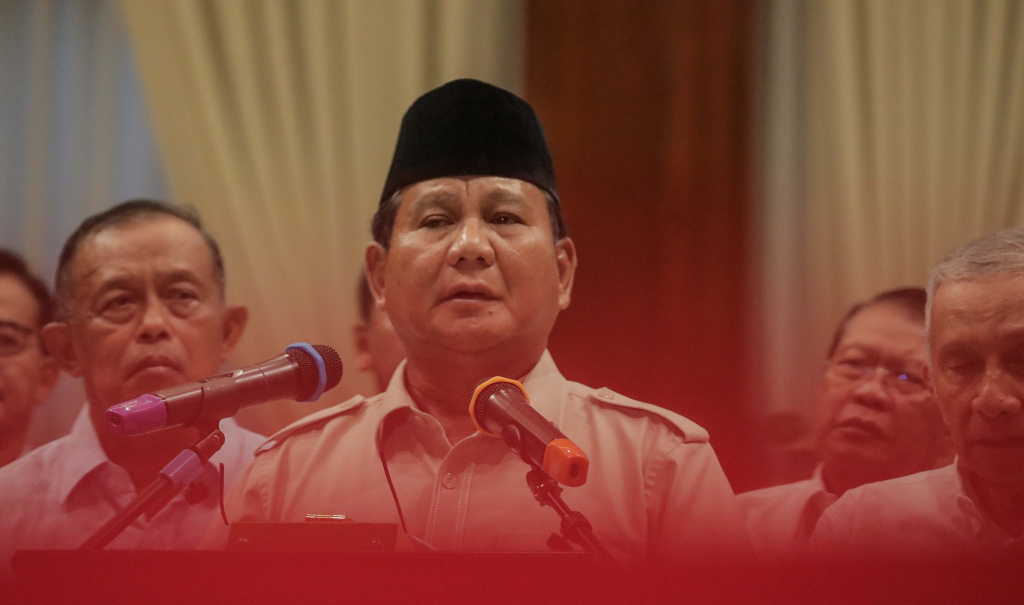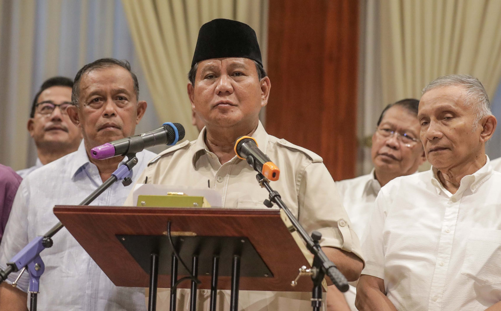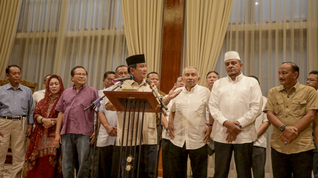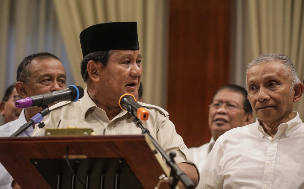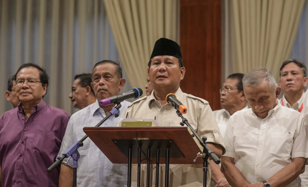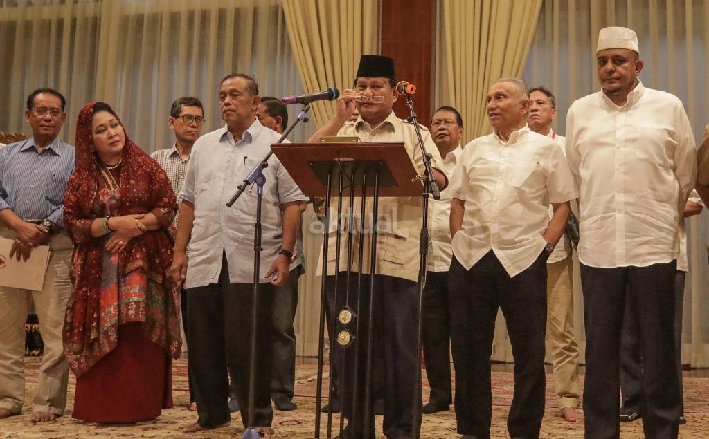 Calon Presiden Prabowo Subianto (tengah) didampingi sejumlah pengurus BPN bersiap memberikan keterangan terhadap wartawan di Rumah Kertanegara, Jakarta Selatan, Rabu (8/5). AKTUAL/Tino Oktaviano