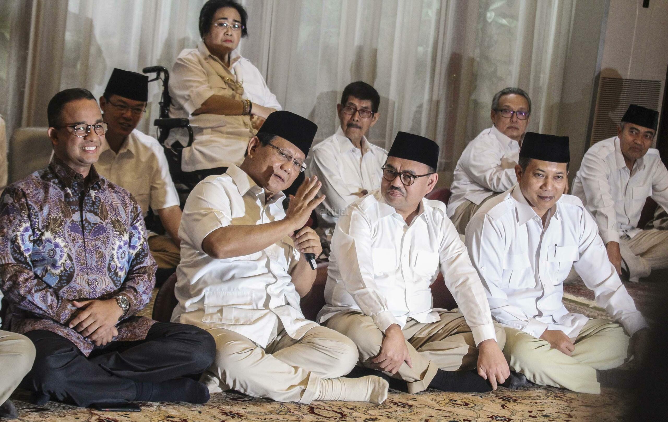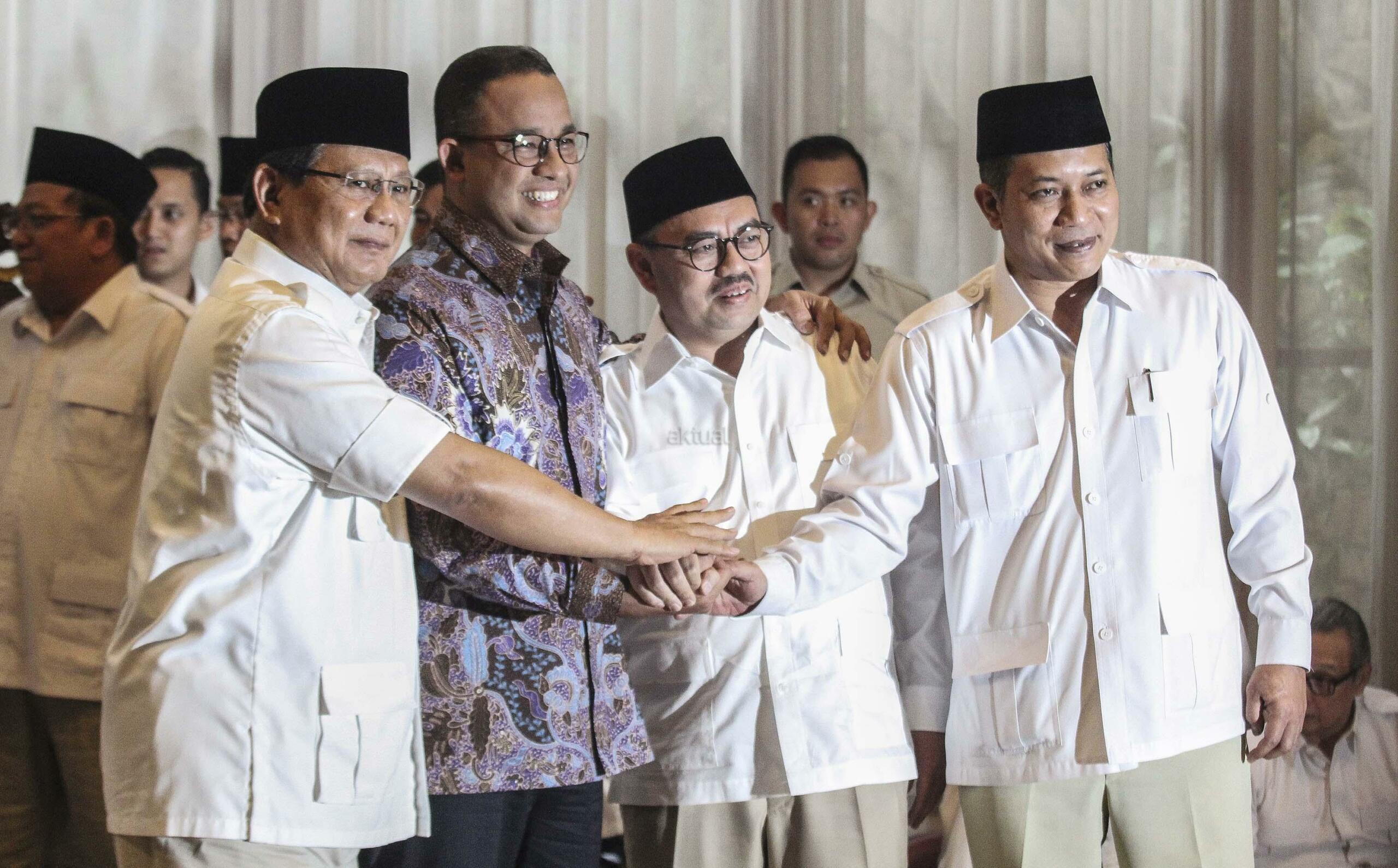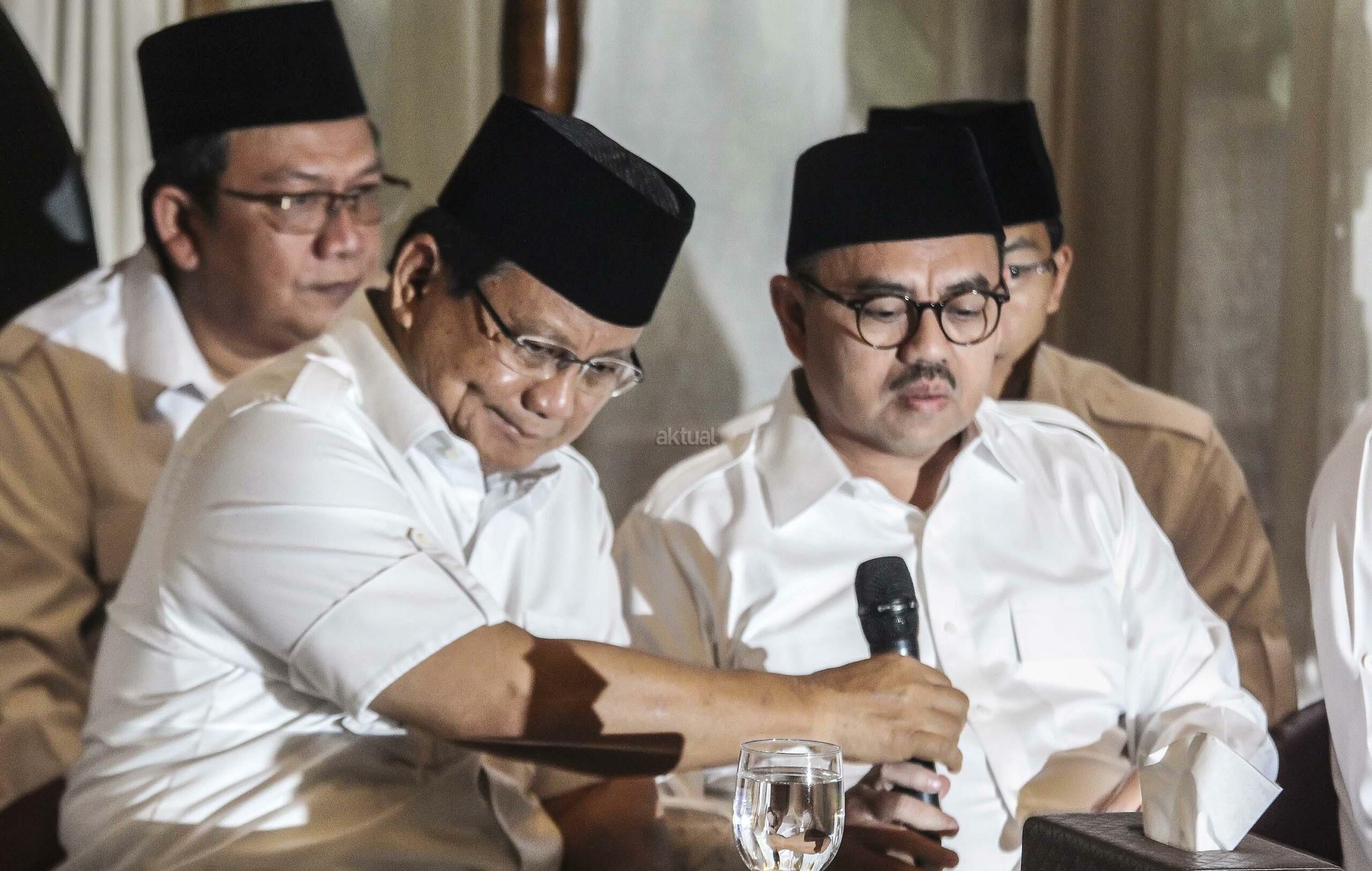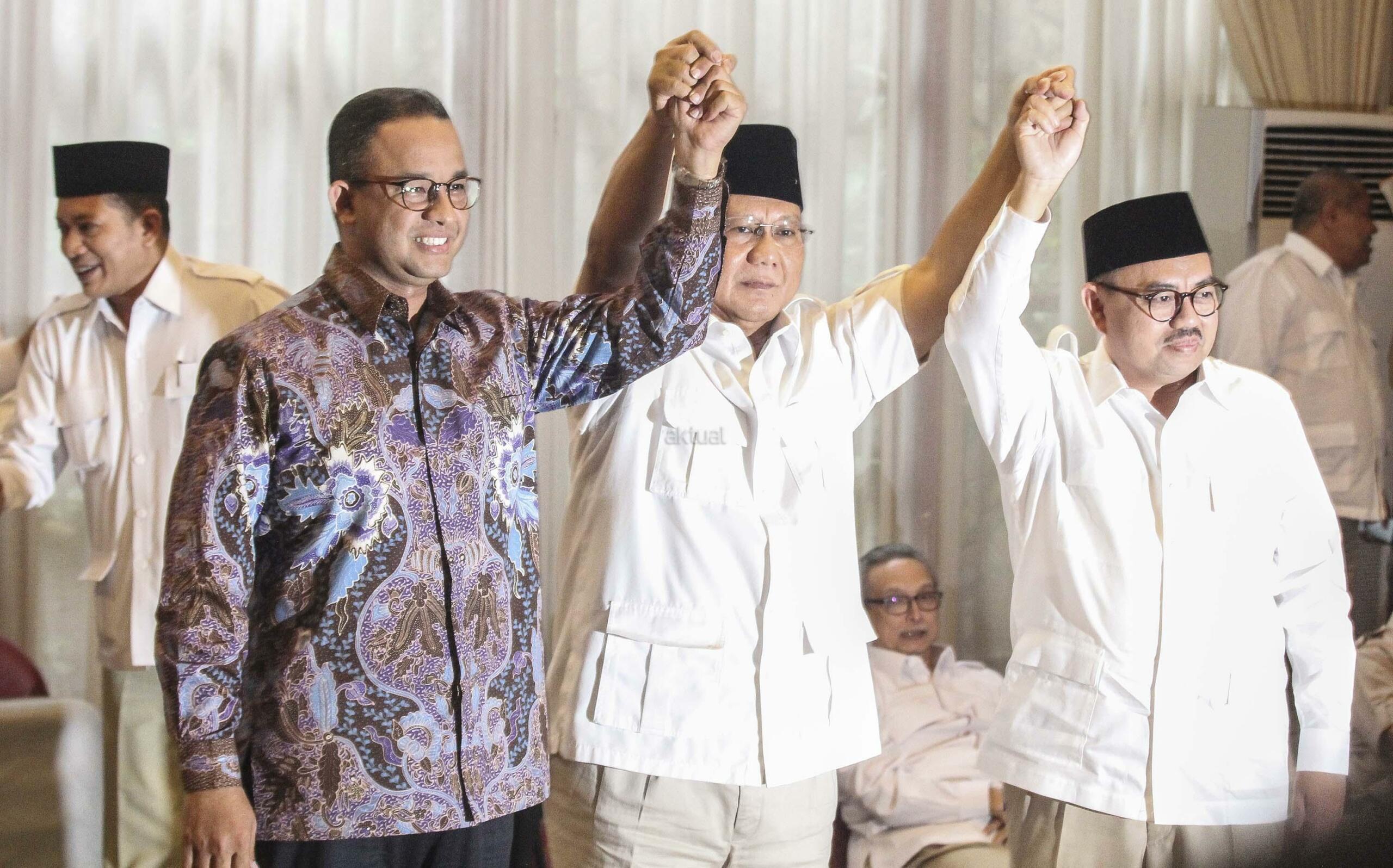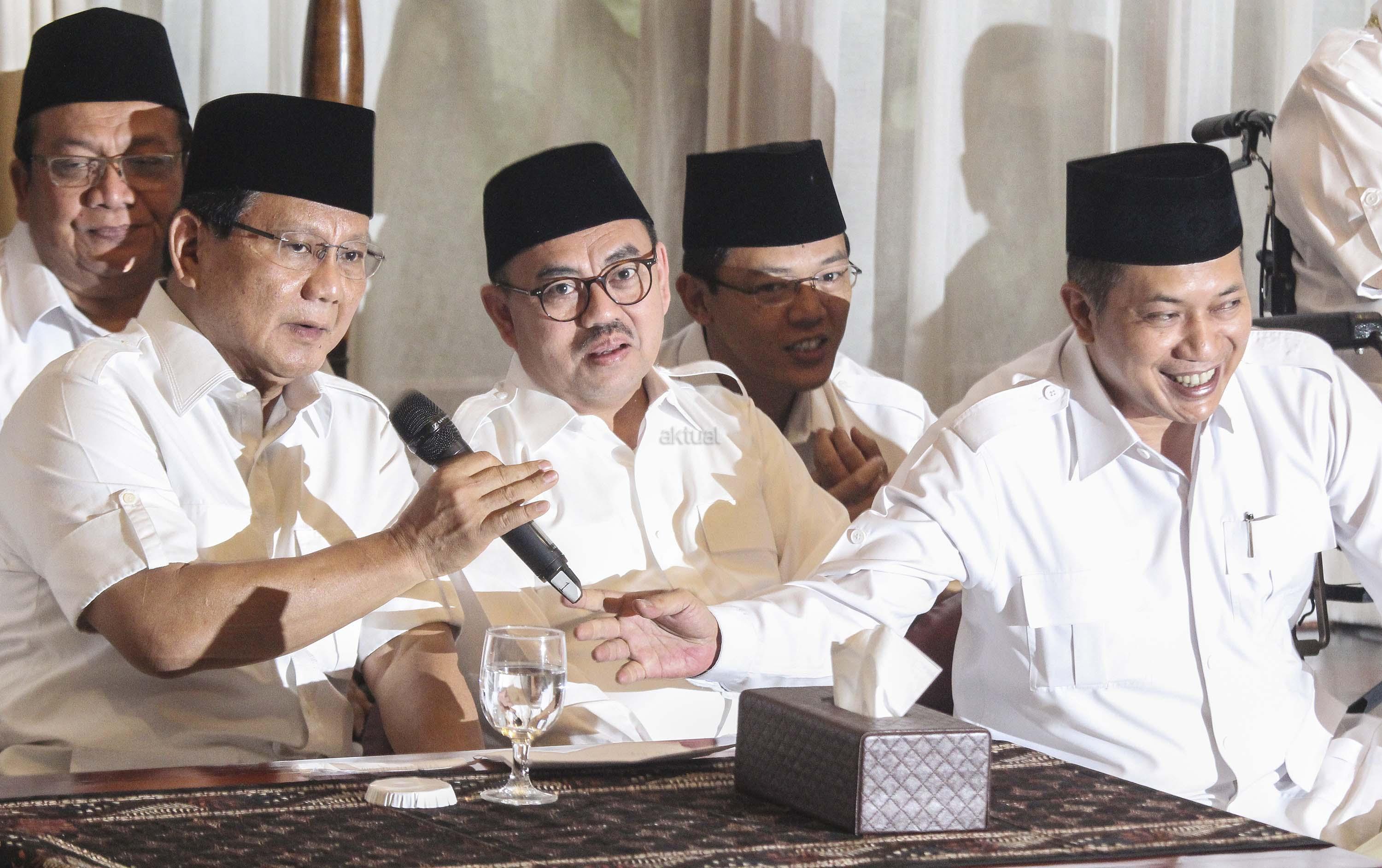 Ketua Umum dan Pembina Partai Gerindra, Prabowo Subianto (tengah) bersama Calon Gubernur Jawa Tengah Sudirman Said (kanan) dan Gubernur DKI Jakarta Anies Baswedan (kiri) saat mengumumkan Calon Gubernur Jawa Tengah di Kertanegara, Jakarta, Rabu (13/12/17). AKTUAL/Tino Oktaviano