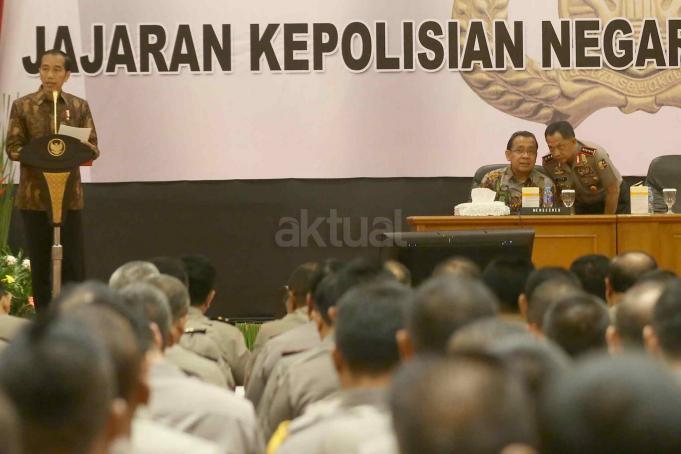 Presiden Joko Widodo memberikan arahan kepada jajaran Polri terkait pengamanan negara di Auditorium PTIK, Jakarta, Selasa (8/11). Presiden Jokowi meminta Polri tidak ragu dalam bertindak untuk penegakan hukum, Presiden juga memberikan apresiasi kepada seluruh anggota Polri atas kewaspadaan, solidtas, sikap profesional yang ditunjukkan dalam mengamankan aksi demo tanggal 4 November 2016. AKTUAL/Tino Oktaviano