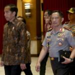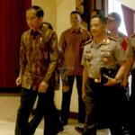 Presiden Joko Widodo (kiri) didampingi Kapolri Jenderal Polisi Tito Karnavian (kanan) memasuki ruangan untuk memberikan arahan kepada jajaran Polri terkait pengamanan negara di Auditorium PTIK, Jakarta, Selasa (8/11). Presiden Jokowi meminta Polri tidak ragu dalam bertindak untuk penegakan hukum, Presiden juga memberikan apresiasi kepada seluruh anggota Polri atas kewaspadaan, solidtas, sikap profesional yang ditunjukkan dalam mengamankan aksi demo tanggal 4 November 2016. AKTUAL/Tino Oktaviano