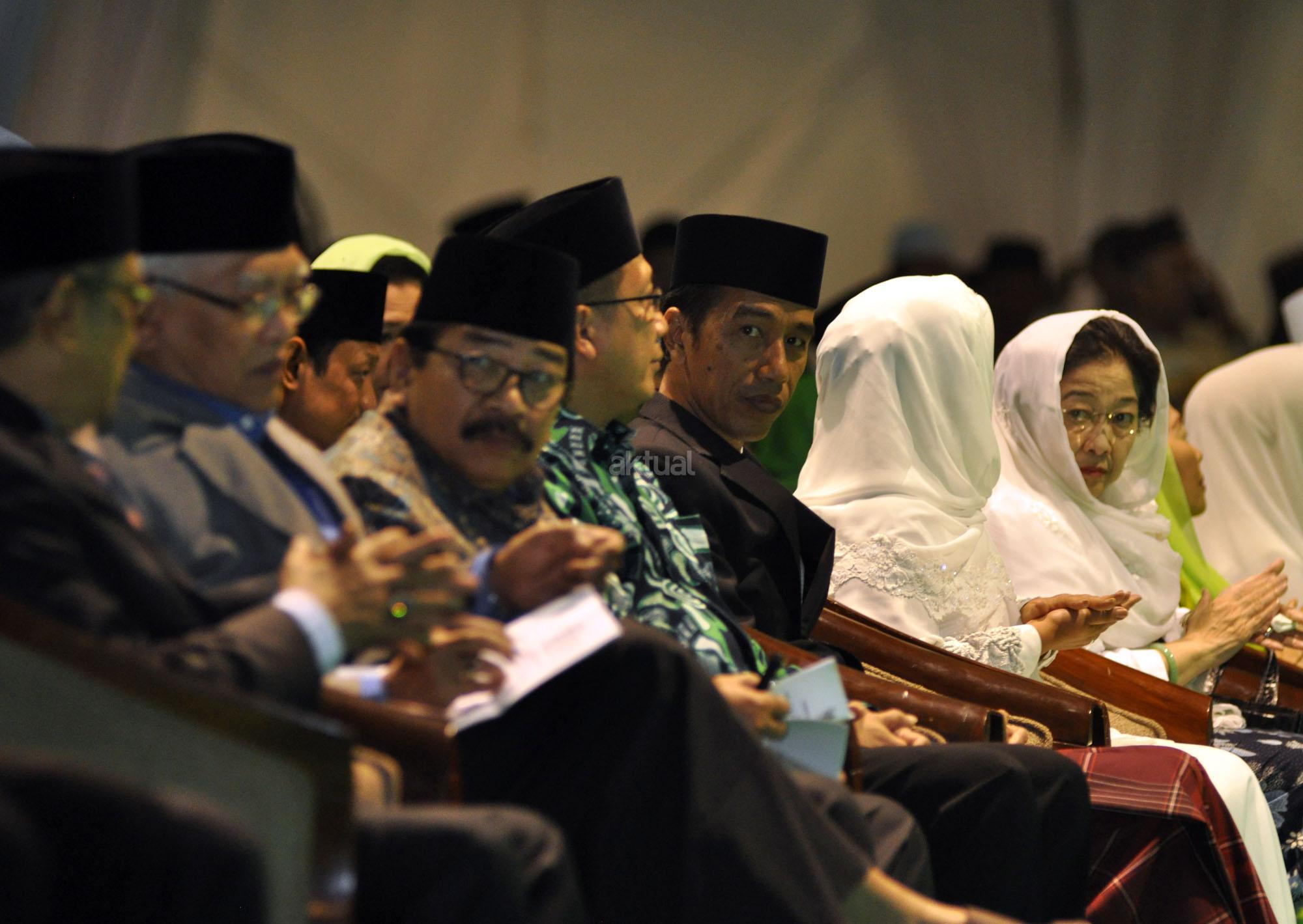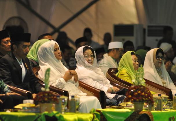 Presiden RI Joko Widodo, ditemani Pejabat Rais Aam KH Mustofa Bisri (Gus Mus), Menteri Agama Lukman Hakim Syaifuddin, Ketua Umum PBNU KH Said Aqil Siroj membuka Muktamar NU ke-33 di Alun-alun Jombang, Jawa Timur, Sabtu (1/8/2015). Pembukaan Muktamar NU ke-33 ini dihadiri Menteri Kabinet Kerja, Pimpinan Parpol, Ketua MPR Zulkifli Hasan dan nampak Ketua Umum PDIP Megawati Sukarno Putri hadir dalam acara tersebut.