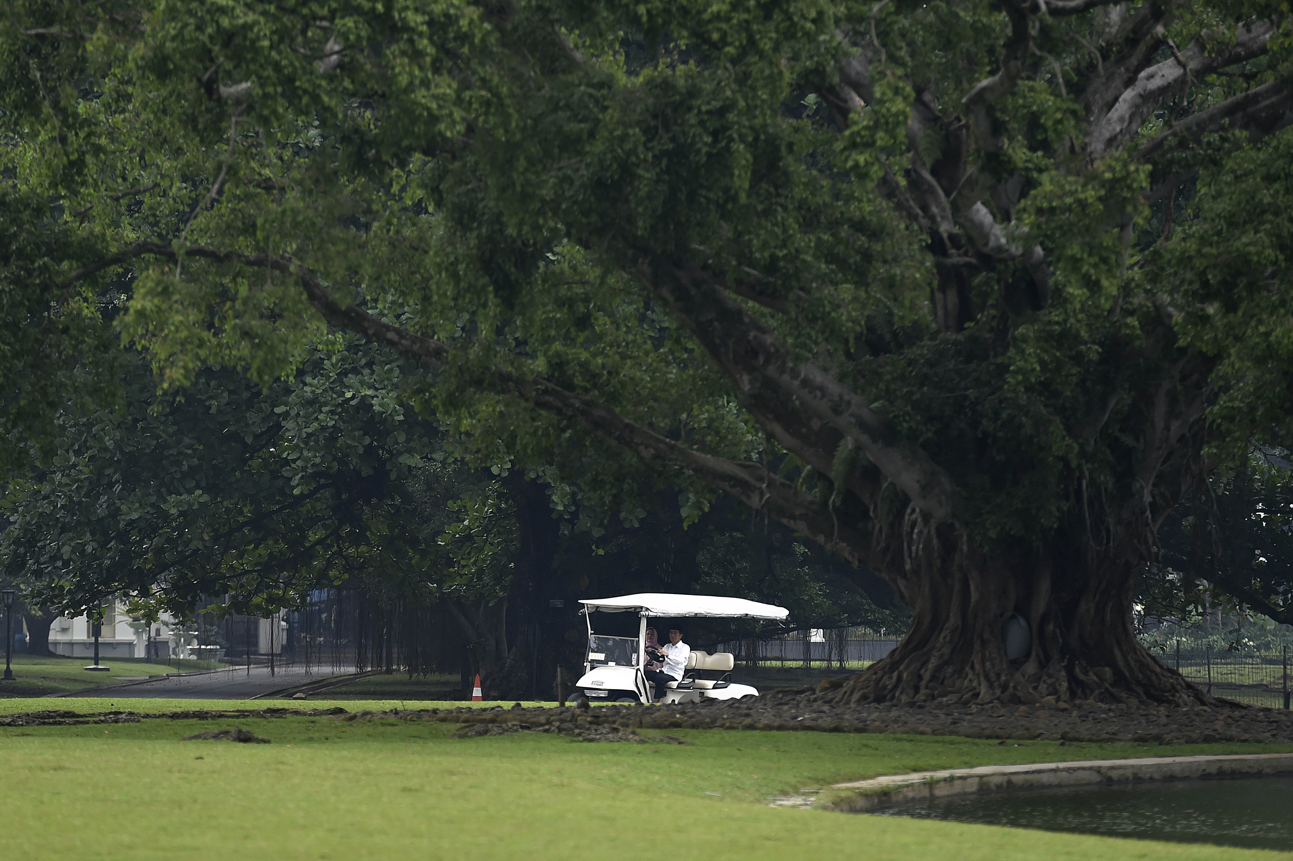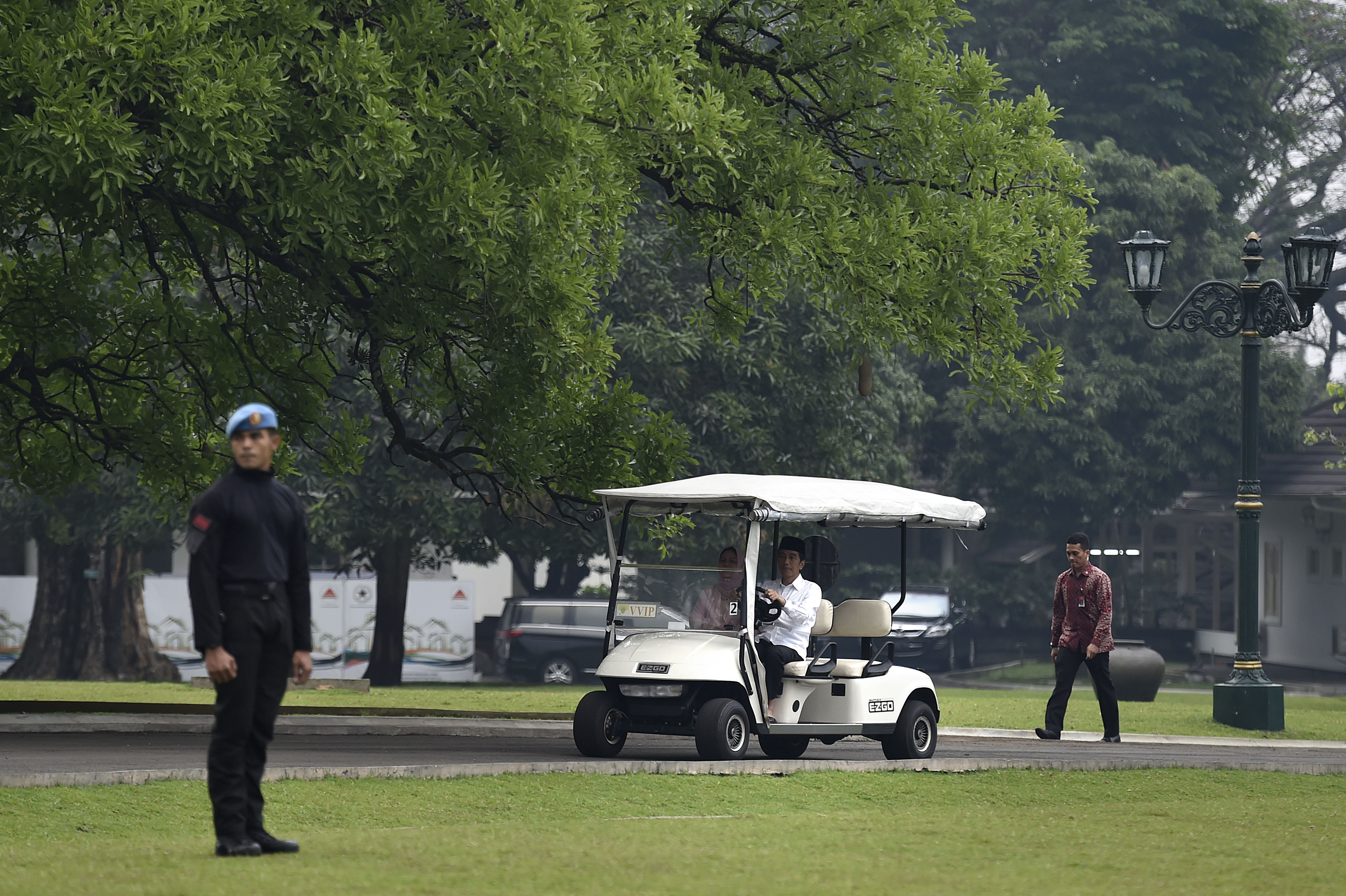 Presiden Joko Widodo didampingi Ibu Negara Iriana Joko Widodo mengendarai mobil golf menuju lokasi buka puasa bersama anak yatim dan penyandang disabilitas di halaman Istana Kepresidenan Bogor, Jawa Barat, Selasa (28/6). Buka puasa tersebut diikuti sebanyak 800 anak yatim dan 200 anak penyandang disabilitas dari Jakarta, Bogor, Depok, Bekasi dan Tangerang. ANTARA FOTO/Puspa Perwitasari/kye/16