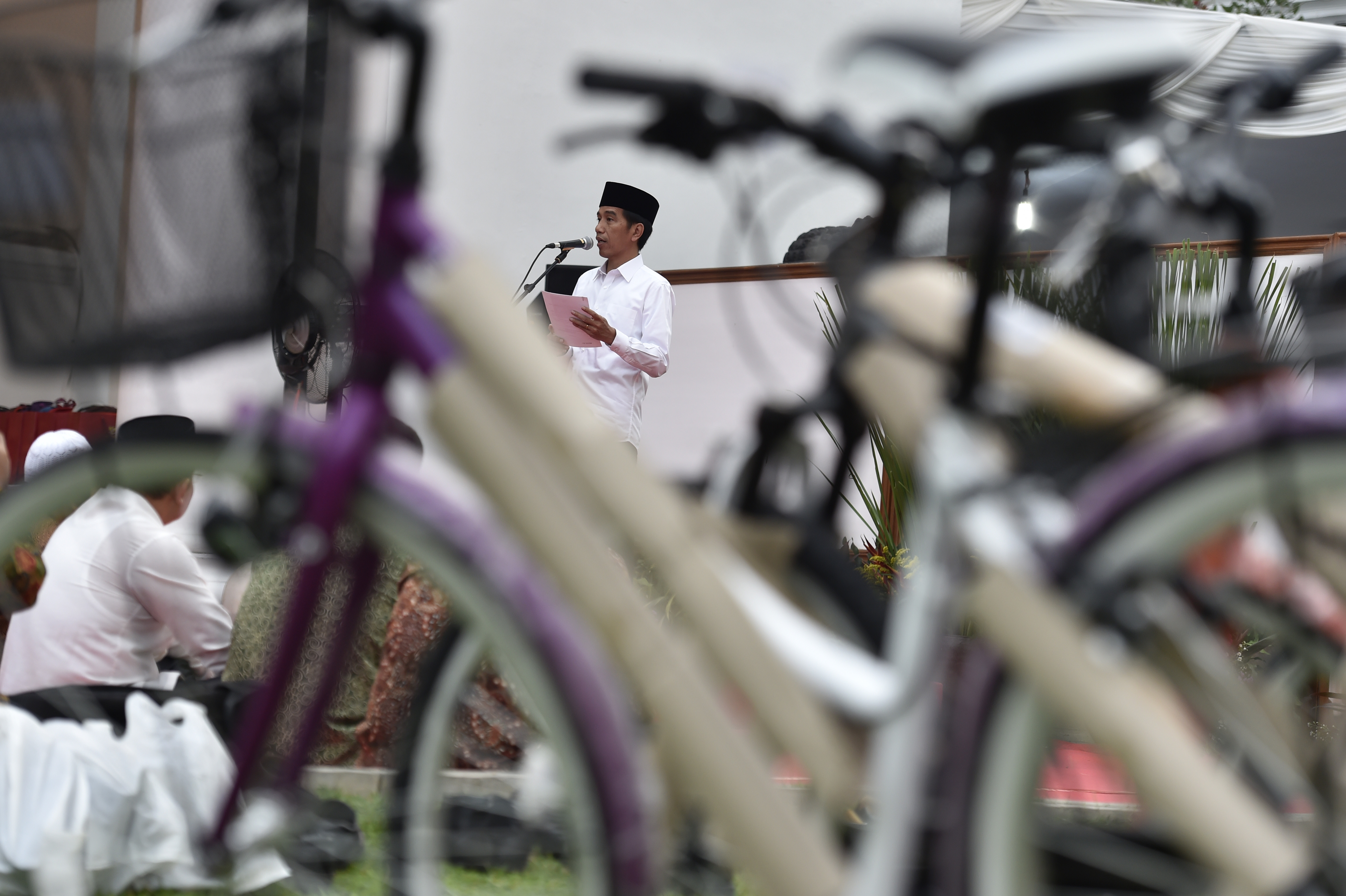 Presiden Joko Widodo membagikan buku tulis disela-sela acara buka puasa bersama anak yatim dan penyandang disabilitas di halaman Istana Kepresidenan Bogor, Jawa Barat, Selasa (28/6). Buka puasa tersebut diikuti sebanyak 800 anak yatim dan 200 anak penyandang disabilitas dari Jakarta, Bogor, Depok, Bekasi dan Tangerang. ANTARA FOTO/Puspa Perwitasari/kye/16