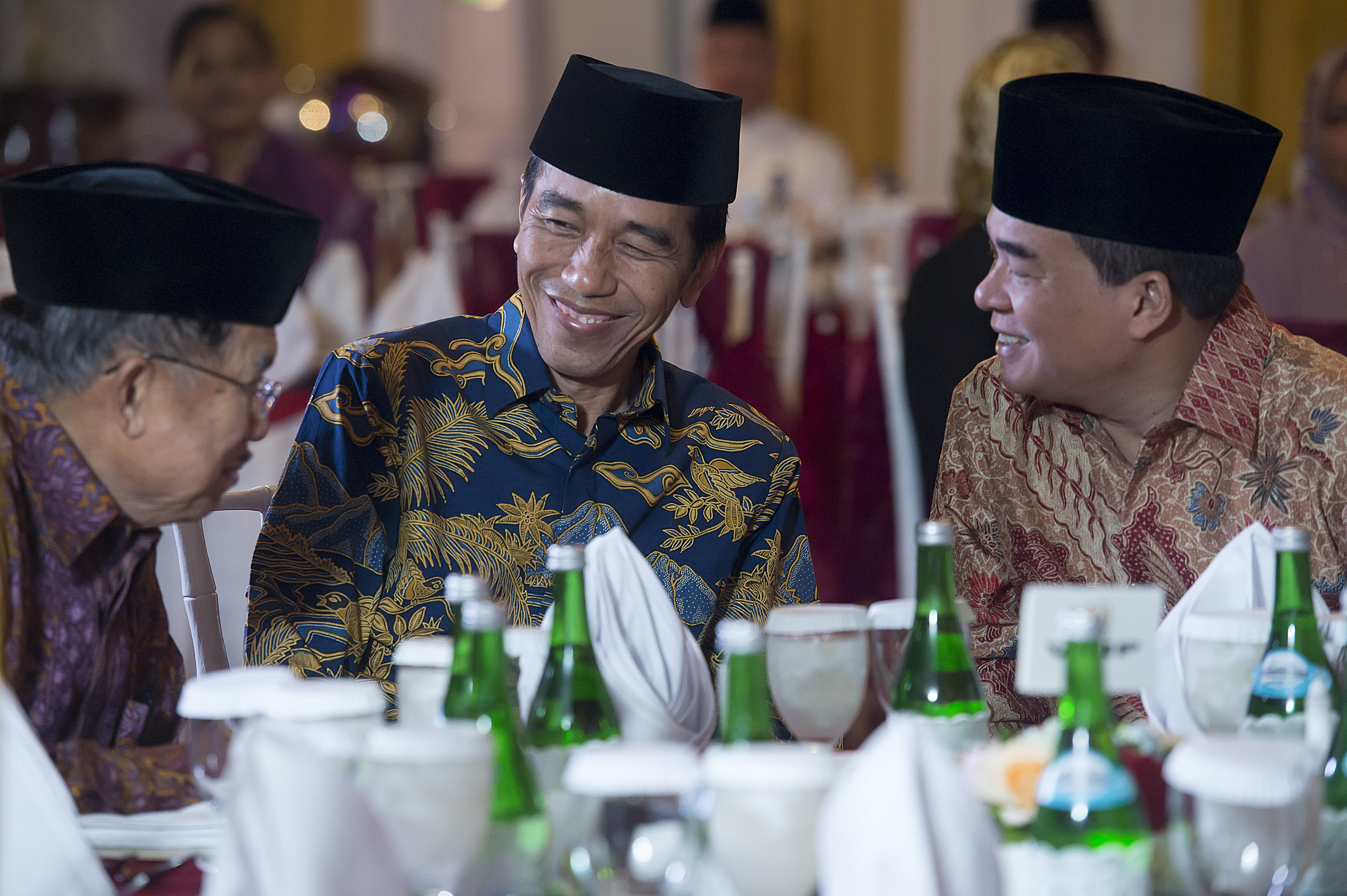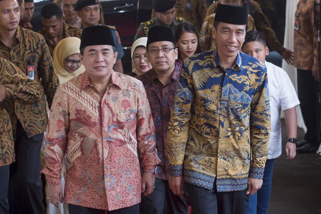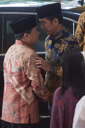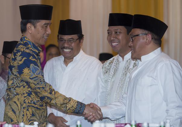 Presiden Joko WIdodo (kiri) berjabat tangan dengan Ketua Dewan Pembina Partai Golkar Aburizal Bakrie (kanan) disaksikan Ketua Umum DPP PPP Romahurmuziy (kedua kanan) dan Jaksa Agung Prasetyo (kedua kiri) setibanya di acara buka puasa bersama di rumah dinas Ketua DPR di Jalan Widya Chandra III, Jakarta Selatan, Senin (20/6). ANTARA FOTO/Widodo S. Jusuf/pd/16.