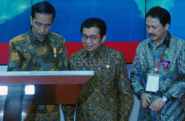Presiden Joko Widodo (kiri) didampingi Dirut Bursa Efek Indonesia (BEI), Tito Sulistio dan Ketua Otoritas Jasa Keuangan (OJK), Muliaman Hadad saat membuka Hari Ulang Tahun (HUT) Pasar Modal Indonesia ke-38, di Gedung Bursa Efek Indonesia (BEI), Jakarta, Senin (10/8/2015). Jokowi mengatakan lambatnya perekonomian bukan hanya terjadi di Indonesia saja. AKTUAL/EKO S HILMAN