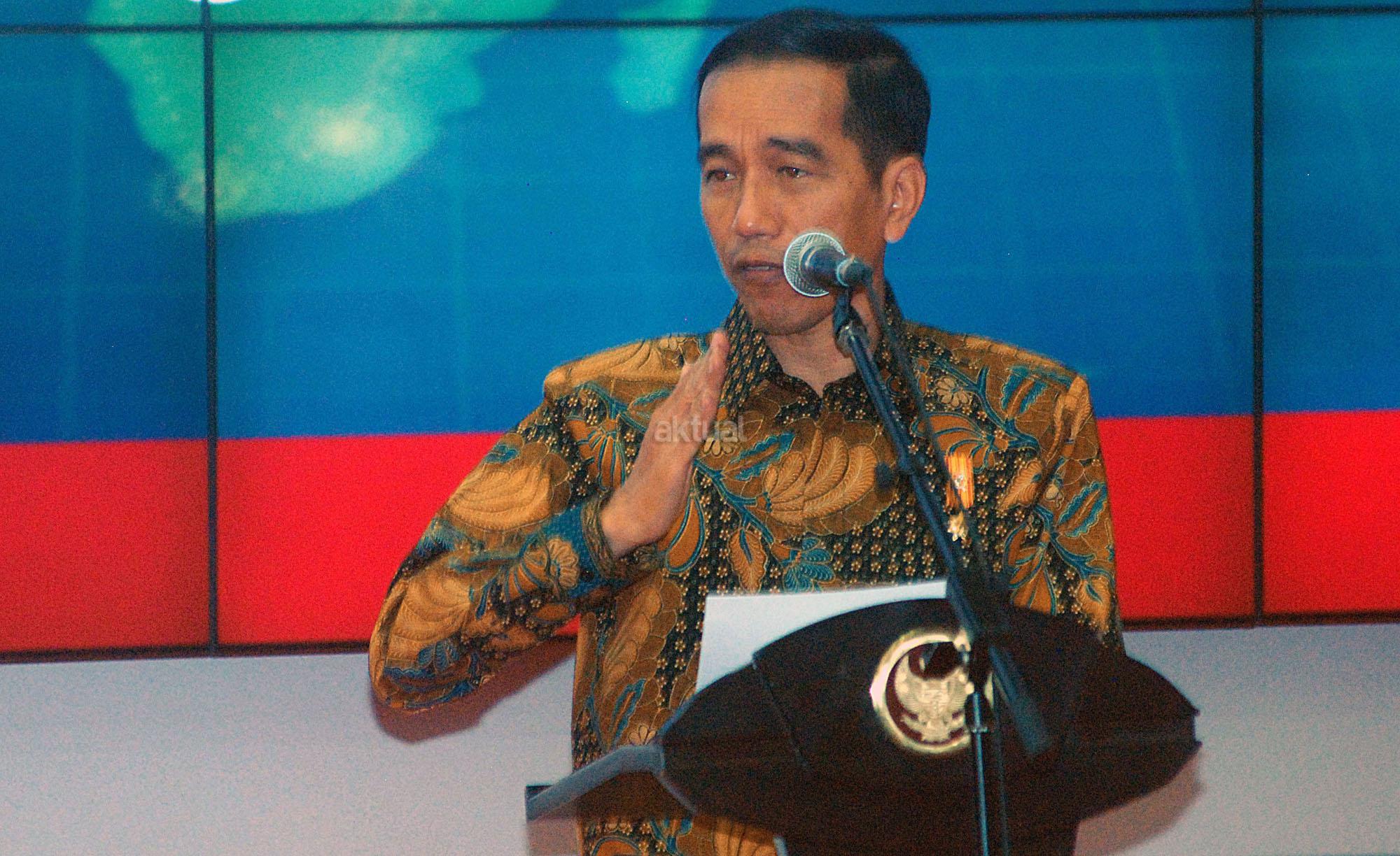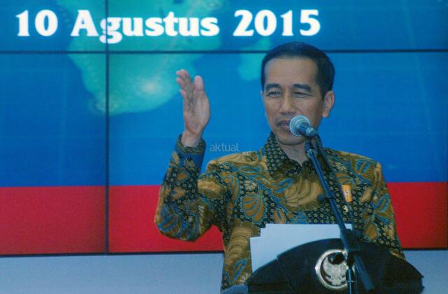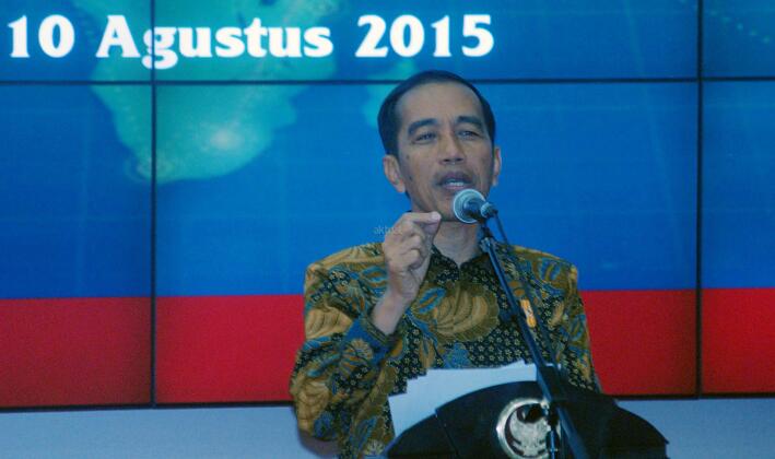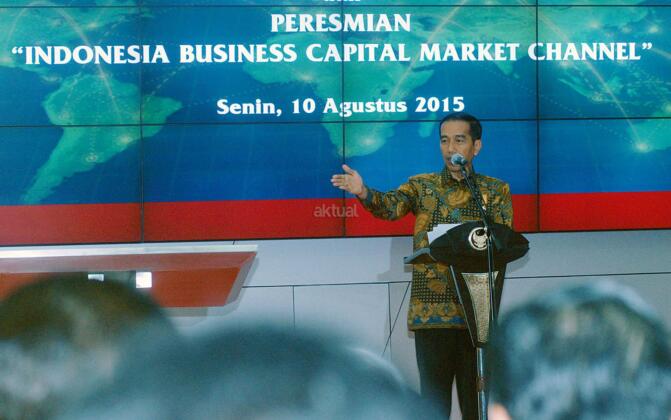 Presiden Joko Widodo (Jokowi) saat berpidato membuka Hari Ulang Tahun (HUT) Pasar Modal Indonesia ke-38, di Gedung Bursa Efek Indonesia (BEI), Jakarta, Senin (10/8/2015). Jokowi mengatakan lambatnya perekonomian bukan hanya terjadi di Indonesia saja. AKTUAL/EKO S HILMAN