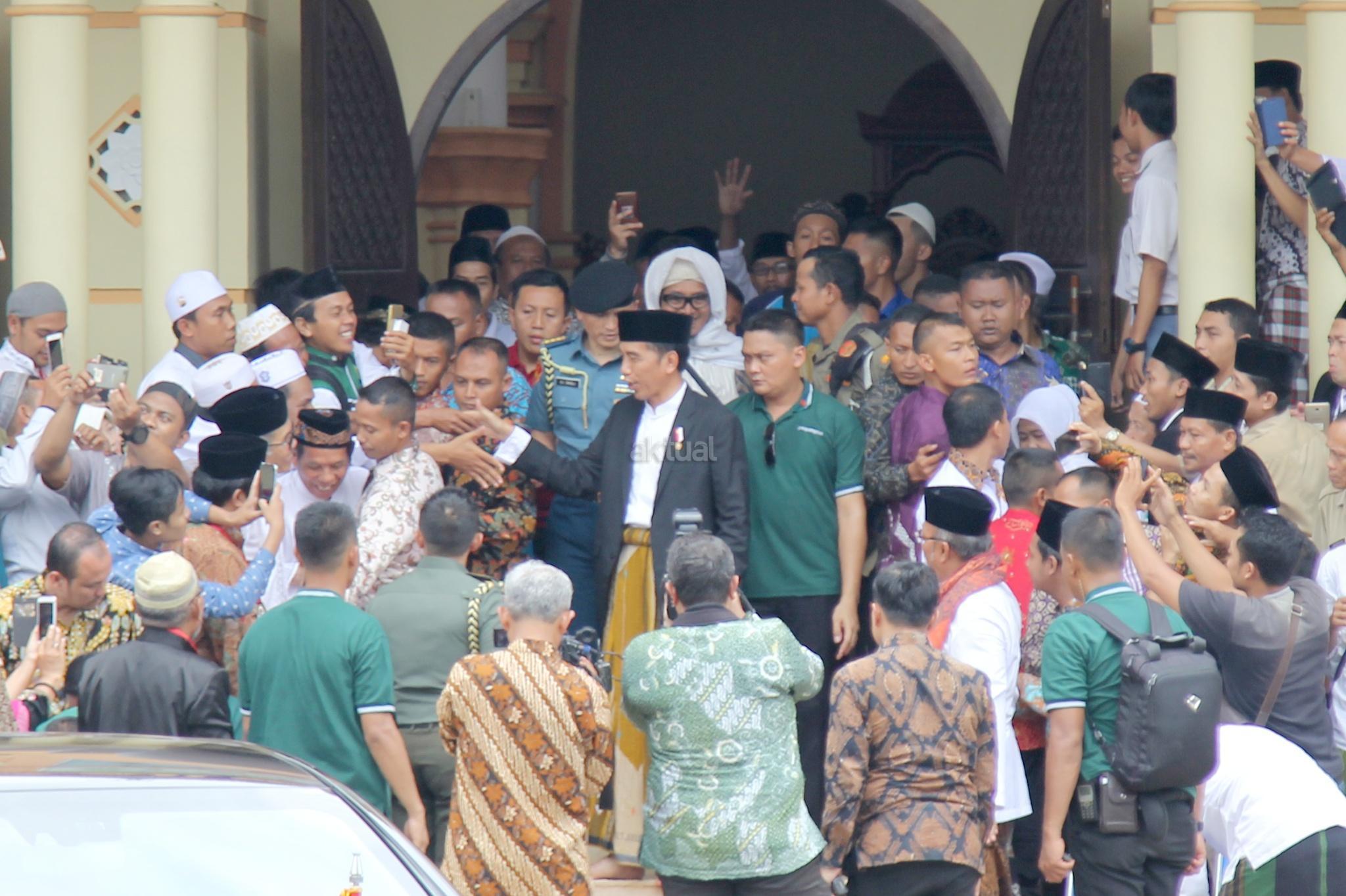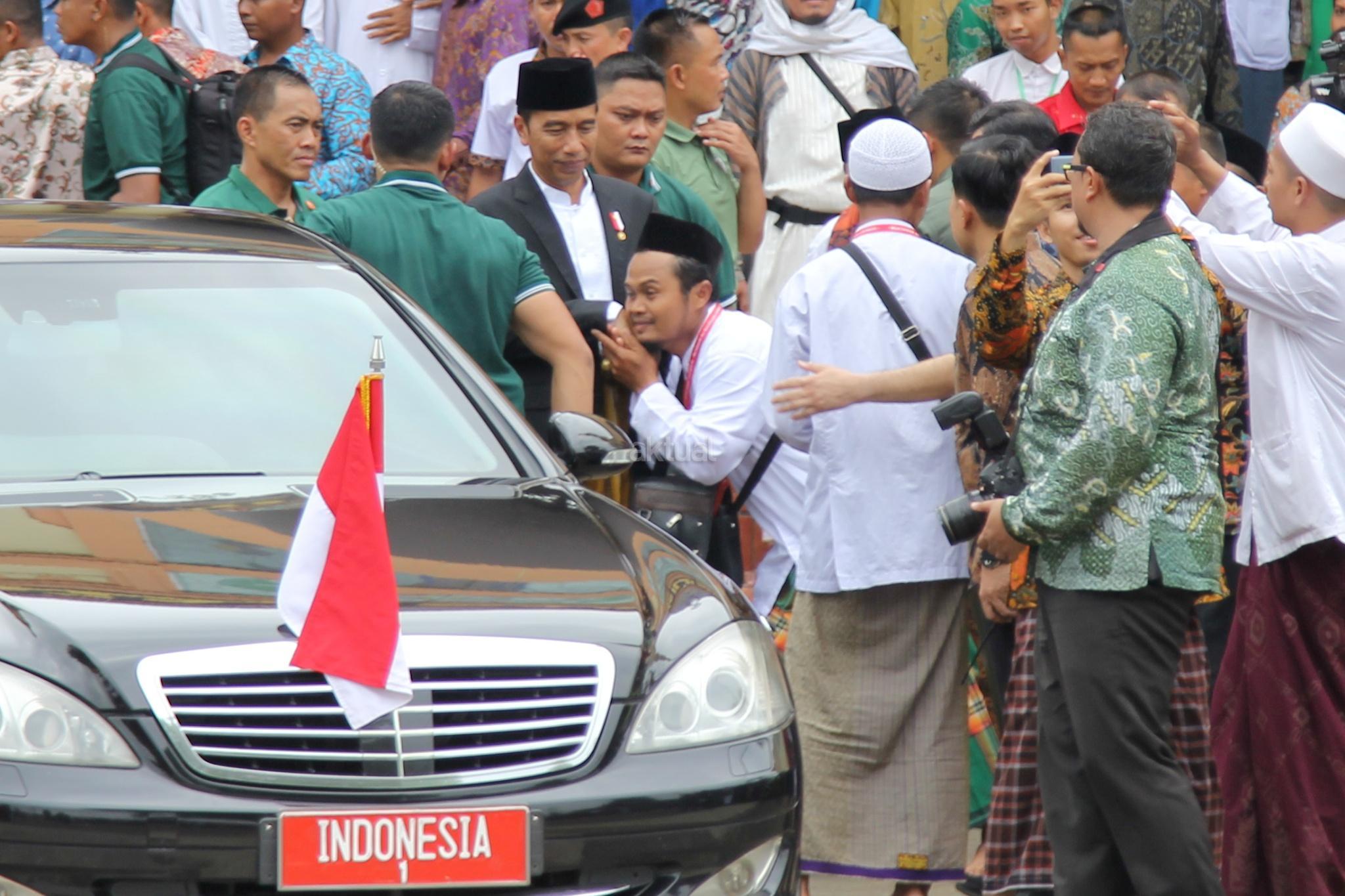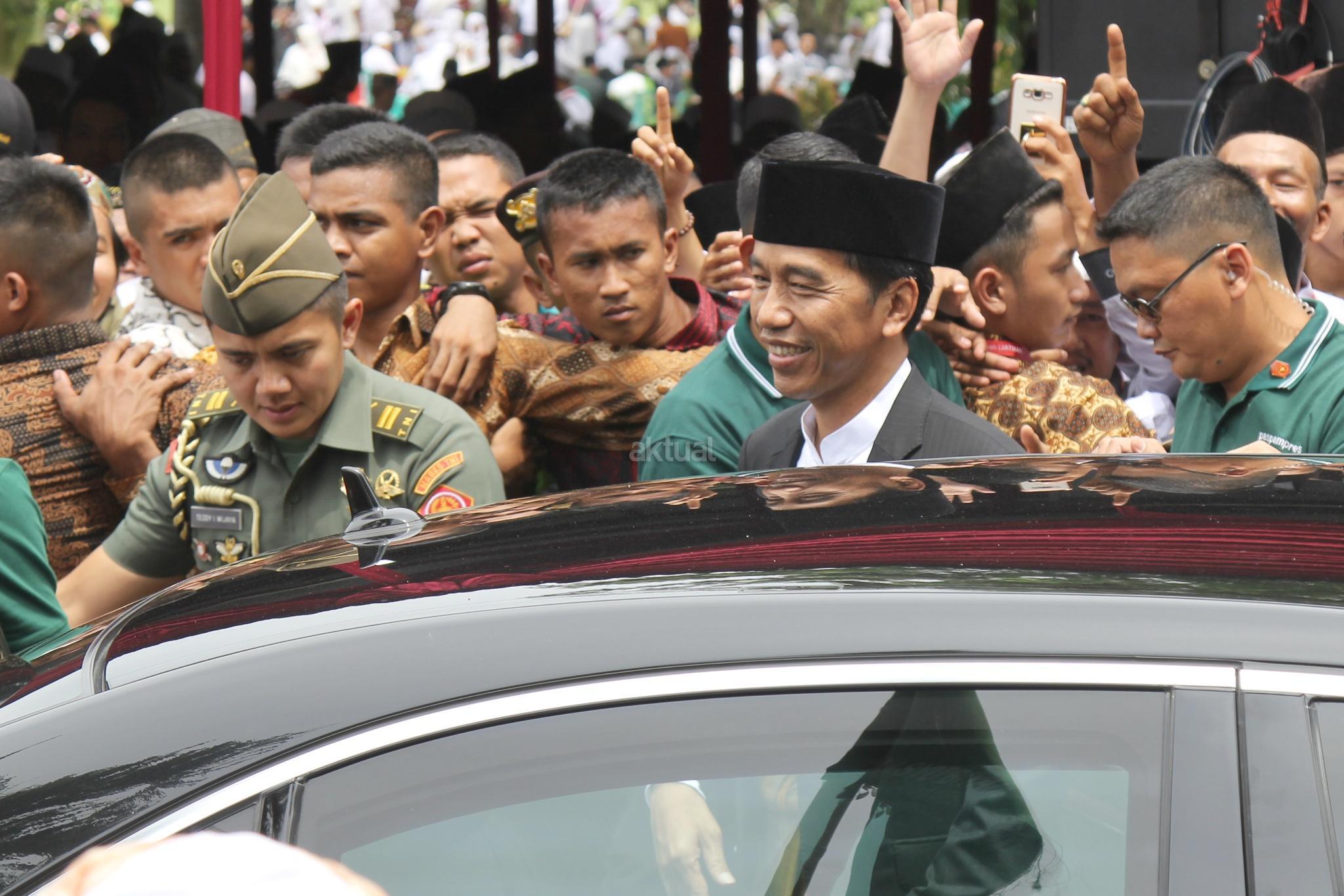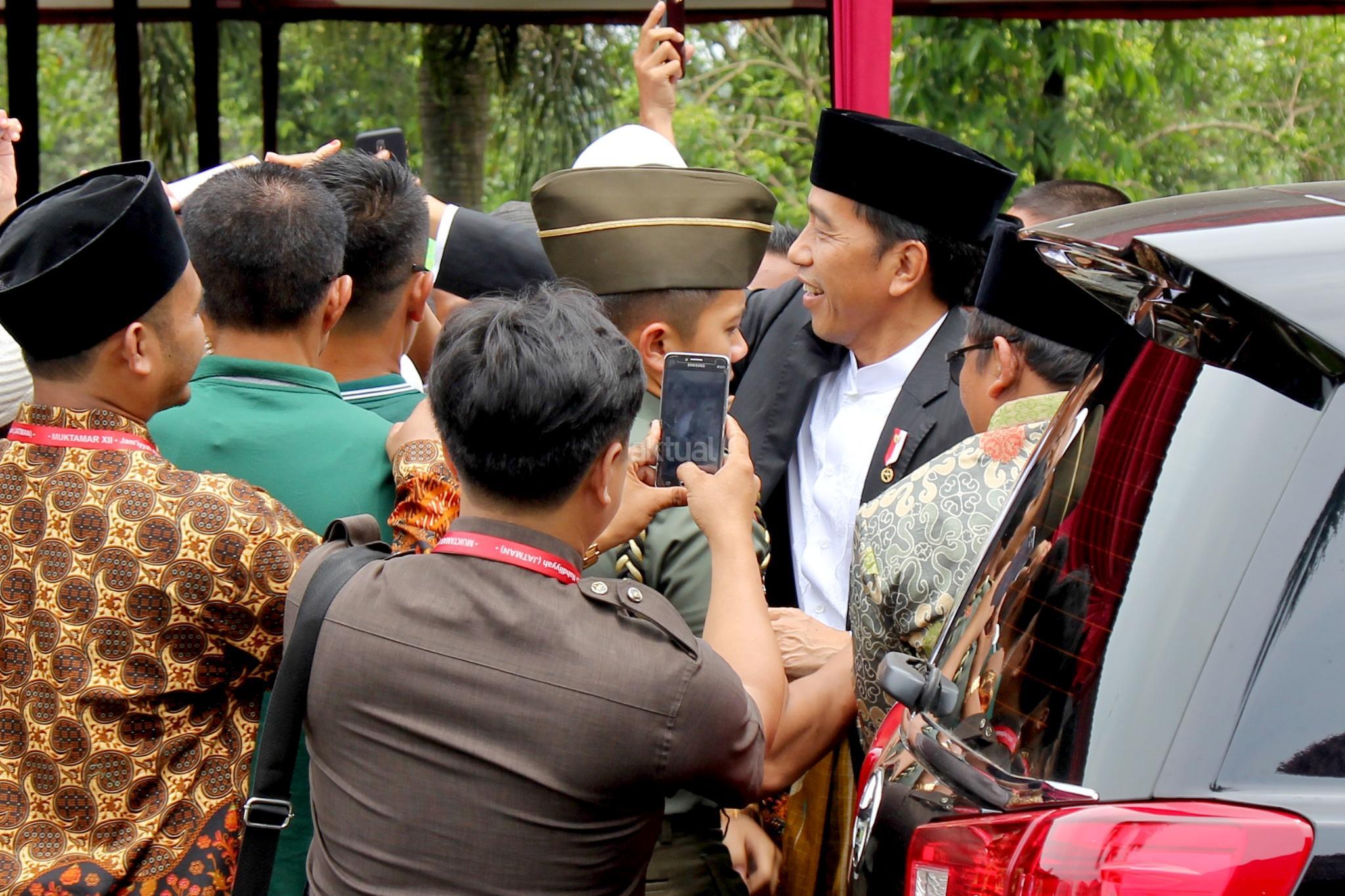 Presiden RI Joko Widodo menyempatkan bersalaman san swafoto dengan warga usai membuka acara Muktamar XII Jam'iyyah Ahlith Thariqah Al Mu'tabarah An Nahdliyyah (Jatman) di Alun alun, Kajen, Kabupaten Pekalongan, Senin (15/1/2018). Selain itu, Presiden juga akan menyerahkan sejumlah bantuan sosial kepada masyarakat sekitar Kabupaten Pekalongan, di antaranya Kartu Indonesia Pintar (KIP) dan Program Keluarga Harapan. AKTUAL/Tino Oktaviano
