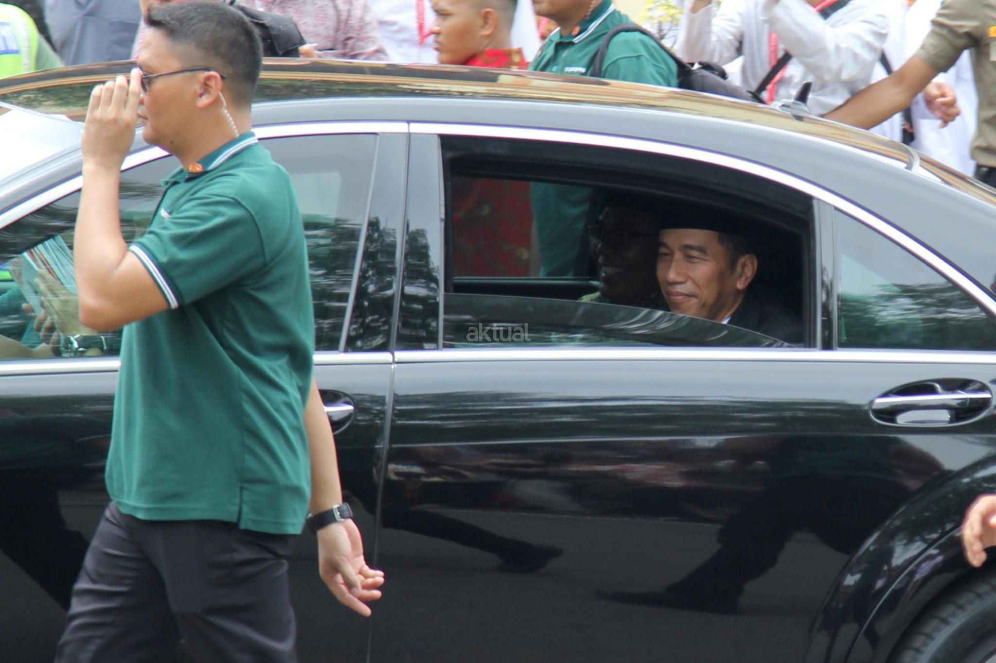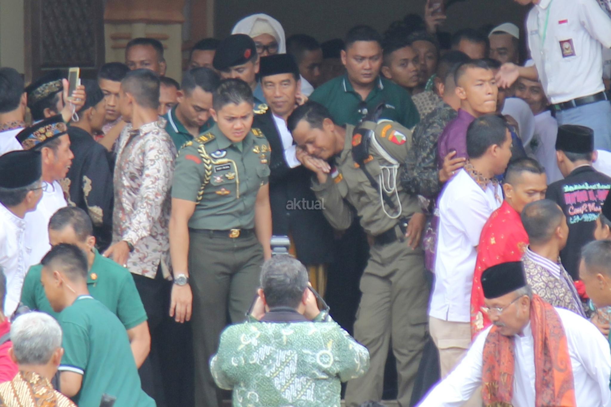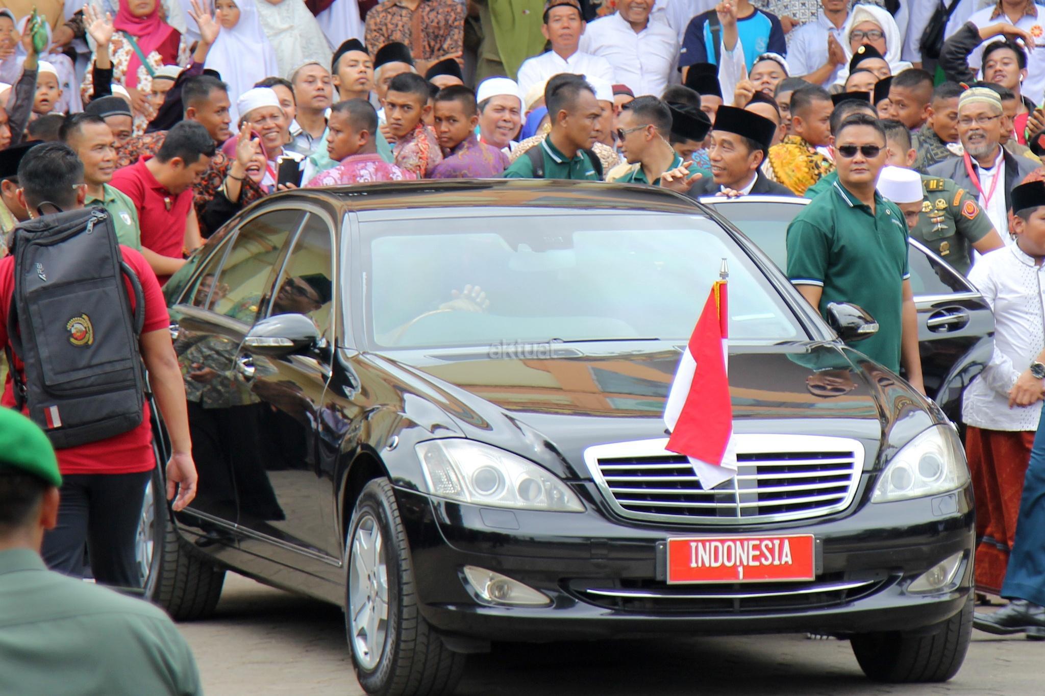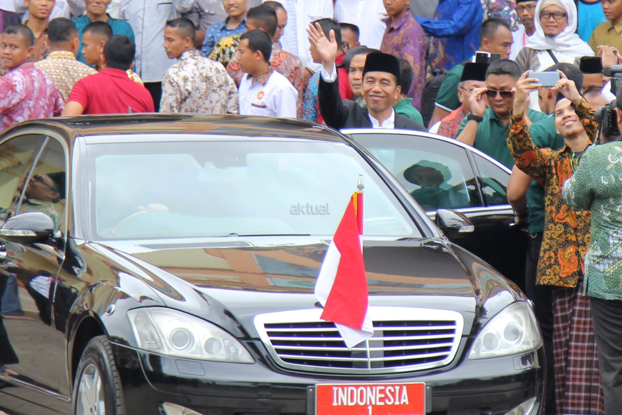 Presiden RI Joko Widodo menyempatkan bersalaman san swafoto dengan warga usai membuka acara Muktamar XII Jam'iyyah Ahlith Thariqah Al Mu'tabarah An Nahdliyyah (Jatman) di Alun alun, Kajen, Kabupaten Pekalongan, Senin (15/1/2018). Selain itu, Presiden juga akan menyerahkan sejumlah bantuan sosial kepada masyarakat sekitar Kabupaten Pekalongan, di antaranya Kartu Indonesia Pintar (KIP) dan Program Keluarga Harapan. AKTUAL/Tino Oktaviano