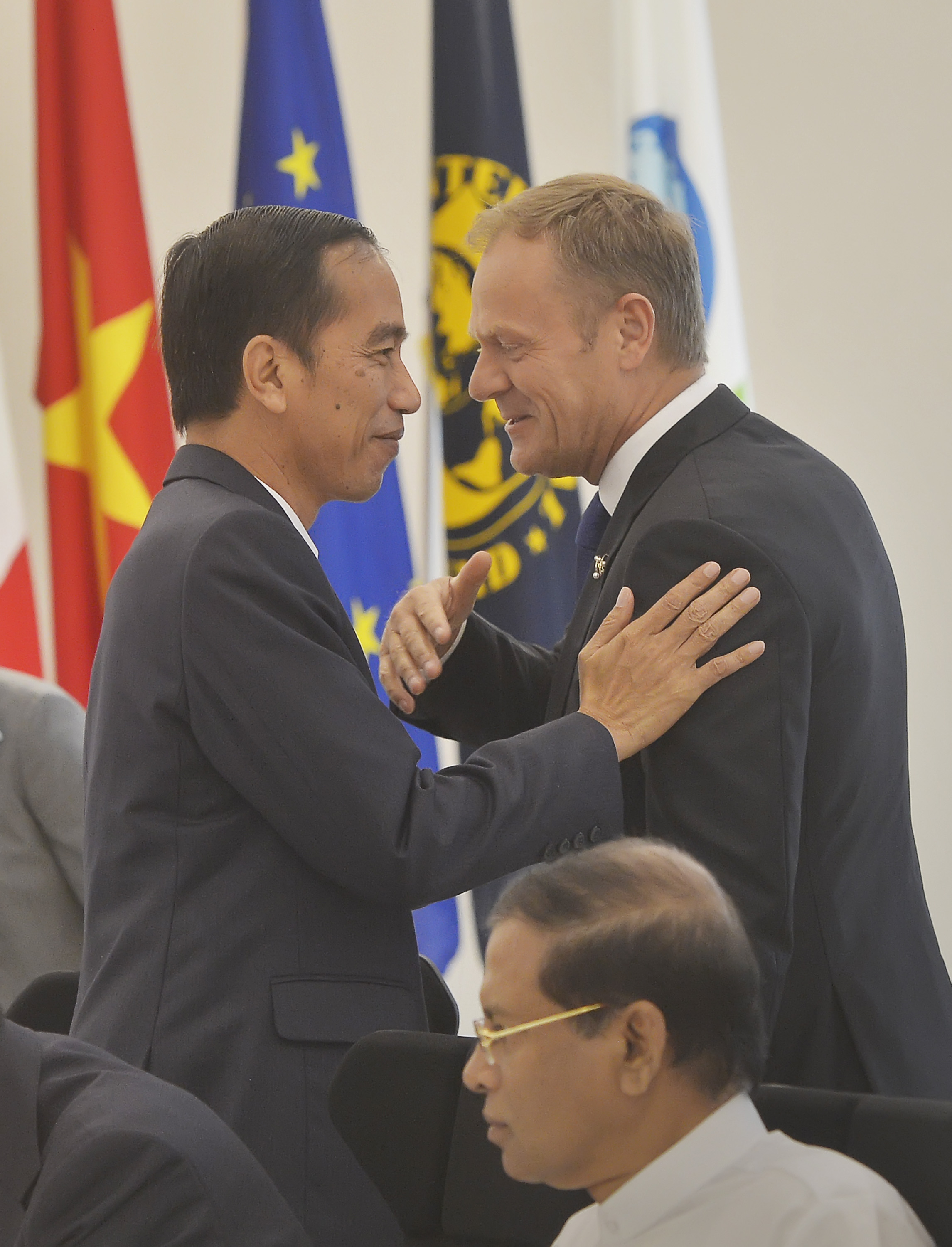 Presiden Joko Widodo (kiri) berdiskusi dengan Presiden Uni Eropa Donald Tusk (kanan) saat pertemuan KTT G-7 Outreach Sesi I di Ise-Shima, Jepang, Jumat (27/5). Pertemuan antara Indonesia dan kelompok negara maju G-7 tersebut membahas topik Stabilitas dan Kesejahteraan di Asia. ANTARA FOTO/Yudhi Mahatma/Spt/16