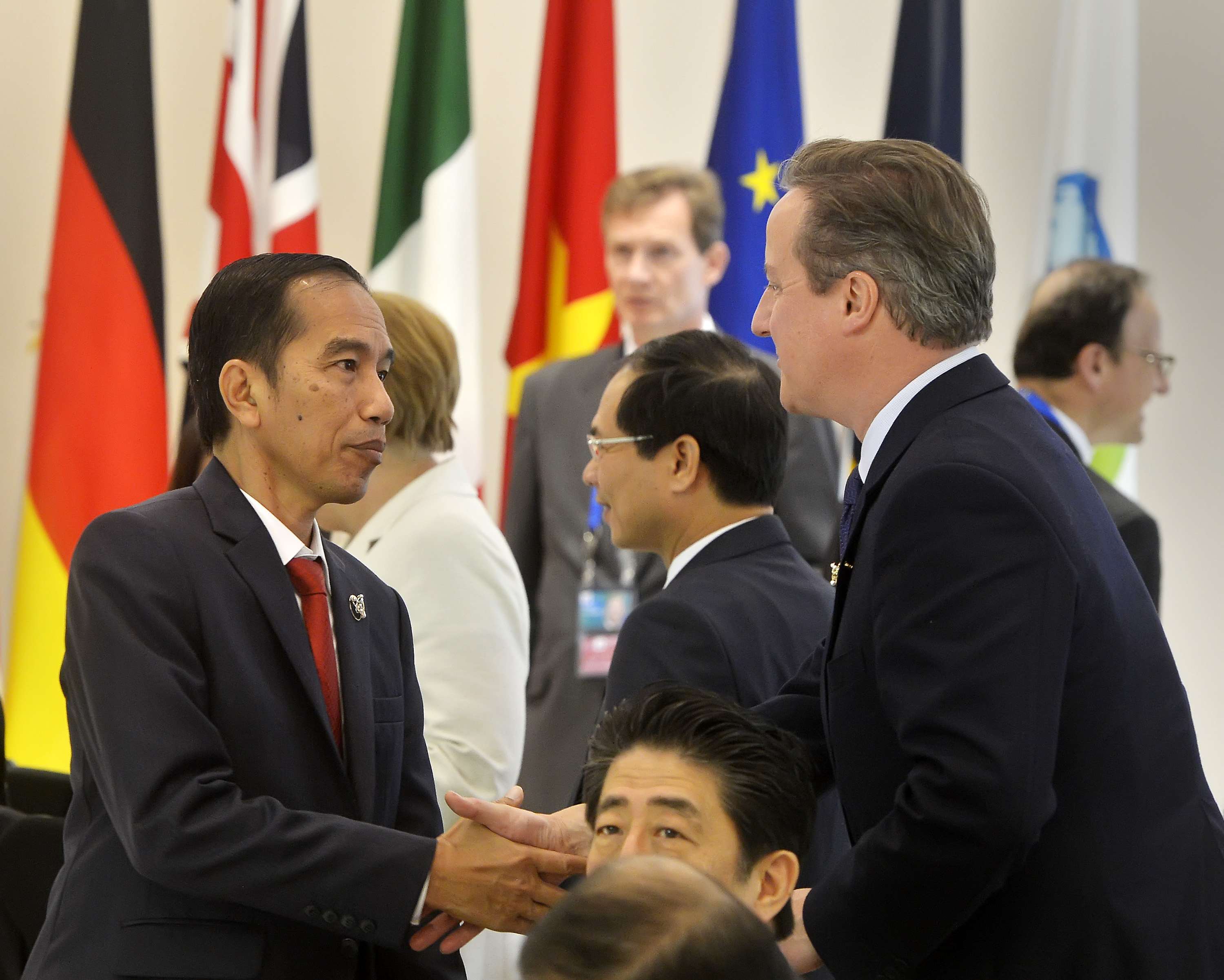 Presiden Joko Widodo (kiri) berdiskusi dengan Perdana Menteri Inggris David Cameron (kanan) saat pertemuan KTT G-7 Outreach Sesi I di Ise-Shima, Jepang, Jumat (27/5). Pertemuan antara Indonesia dan kelompok negara maju G-7 tersebut membahas topik Stabilitas dan Kesejahteraan di Asia. ANTARA FOTO/Yudhi Mahatma/Spt/16