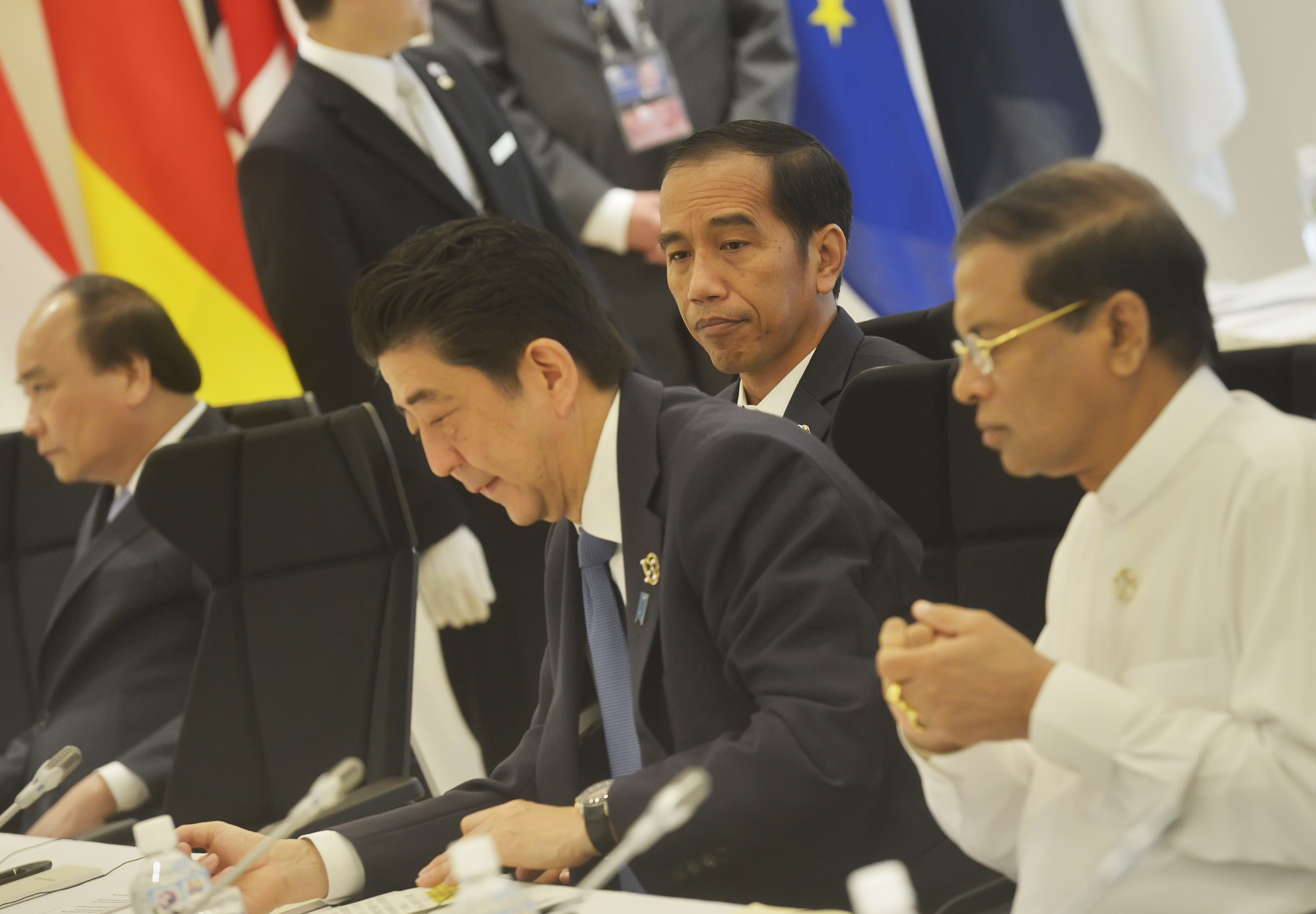 Presiden Joko Widodo (kedua kiri) berdiskusi dengan Perdana Menteri Jepang Shinzo Abe (kedua kanan) saat pertemuan KTT G-7 Outreach Sesi I di Ise-Shima, Jepang, Jumat (27/5). Pertemuan antara Indonesia dan kelompok negara maju G-7 tersebut membahas topik Stabilitas dan Kesejahteraan di Asia. ANTARA FOTO/Yudhi Mahatma/Spt/16