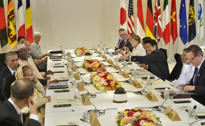 Presiden Joko Widodo (keempat kanan) bersama sejumlah pemimpin negara G-7 mengikuti pertemuan KTT G-7 Outreach Sesi I di Ise-Shima, Jepang, Jumat (27/5). Pertemuan antara Indonesia dan kelompok negara maju G-7 tersebut membahas topik Stabilitas dan Kesejahteraan di Asia. ANTARA FOTO/Yudhi Mahatma/pd/16