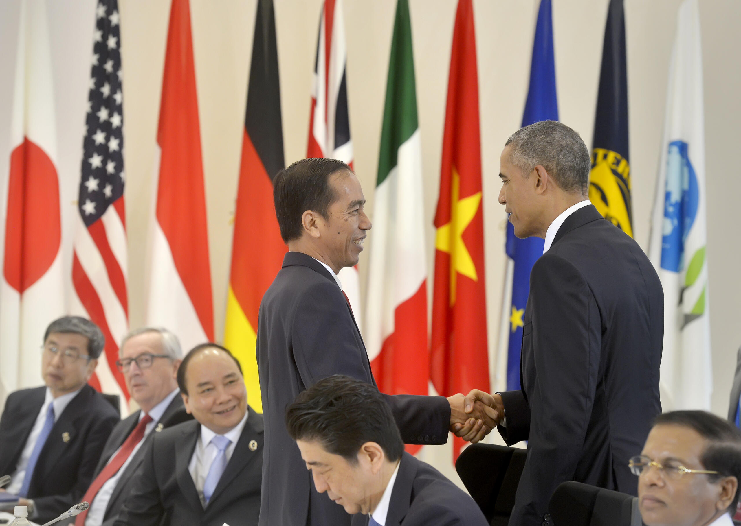 Presiden Joko Widodo (kiri) berjabat tangan dengan Presiden Amerika Barack Obama (kanan) saat pertemuan KTT G-7 Outreach Sesi I di Nagoya, Jepang, Jumat (27/5). Pertemuan antara Indonesia dan kelompok negara maju G-7 tersebut membahas topik Stabilitas dan Kesejahteraan di Asia. ANTARA FOTO/Yudhi Mahatma/Spt/16