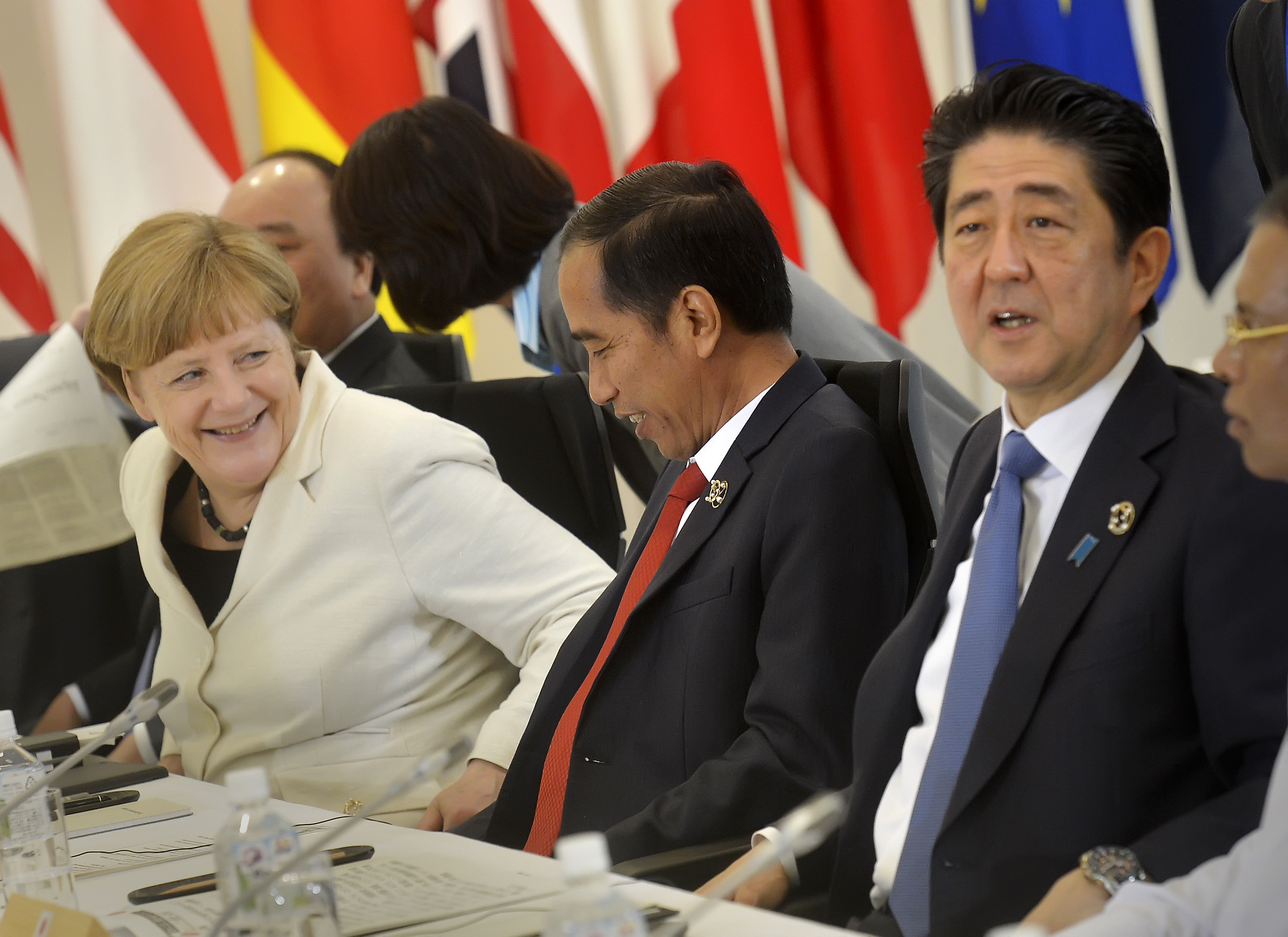 Presiden Joko Widodo (tengah) berdiskusi dengan Kanselir Jerman Angela Merkel (kiri) serta Perdana Menteri Jepang Shinzo Abe (kanan) saat pertemuan KTT G-7 Outreach Sesi I di Ise-Shima, Jepang, Jumat (27/5). Pertemuan antara Indonesia dan kelompok negara maju G-7 tersebut membahas topik Stabilitas dan Kesejahteraan di Asia. ANTARA FOTO/Yudhi Mahatma/pd/16