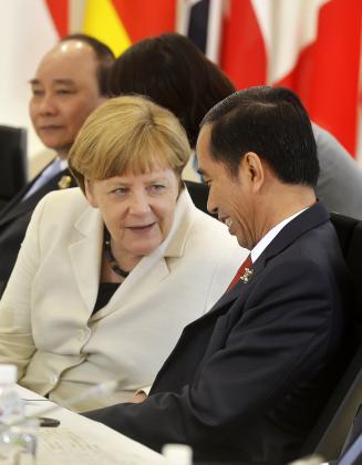 Presiden Joko Widodo (kanan) berdiskusi dengan Kanselir Jerman Andrea Merkel (kiri) saat pertemuan KTT G-7 Outreach Sesi I di Ise-Shima, Jepang, Jumat (27/5). Pertemuan antara Indonesia dan kelompok negara maju G-7 tersebut membahas topik Stabilitas dan Kesejahteraan di Asia. ANTARA FOTO/Yudhi Mahatma/pd/16