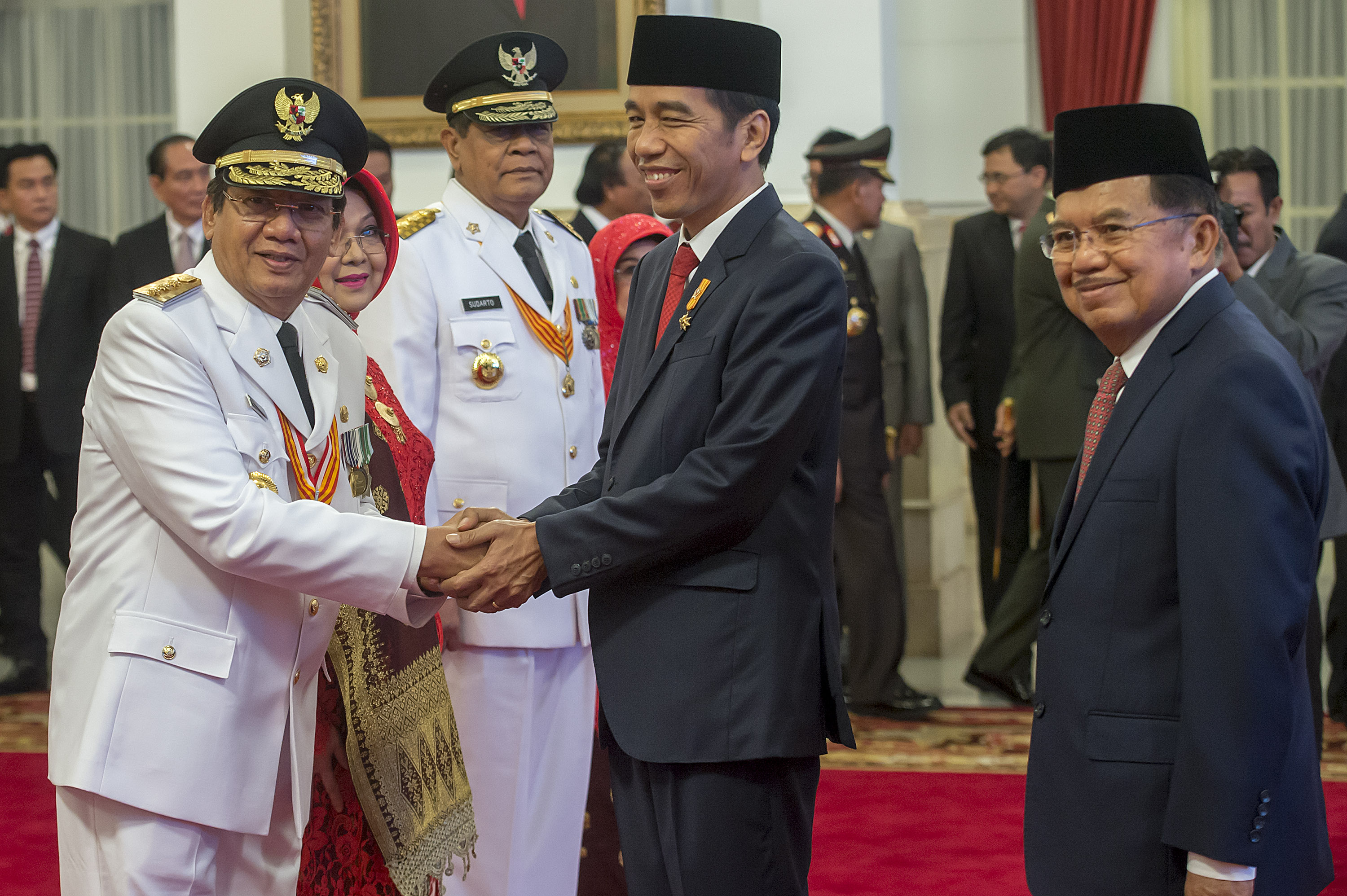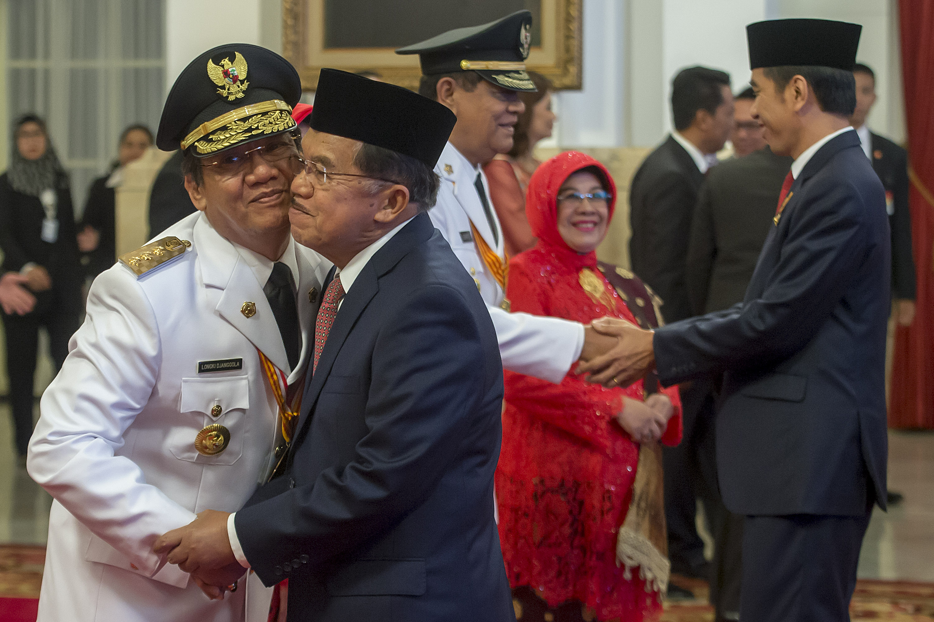 Presiden Joko Widodo (kedua kanan) dan Wapres Jusuf Kalla (kanan) memberikan ucapan selamat kepada Gubernur Sulawesi Tengah Longki Djanggola (kiri) dan Wakil Gubernur Sulawesi Tengah Sudarto (ketiga kanan) usai pelantikan di Istana Negara, Jakarta, Kamis (16/6). Presiden Joko Widodo melantik Longki Djanggola sebagai Gubernur Sulawesi Tengah dan Sudarto sebagai Wakil Gubernur Sulawesi Tengah untuk periode 2016 - 2021. ANTARA FOTO/Widodo S. Jusuf/aww/16.