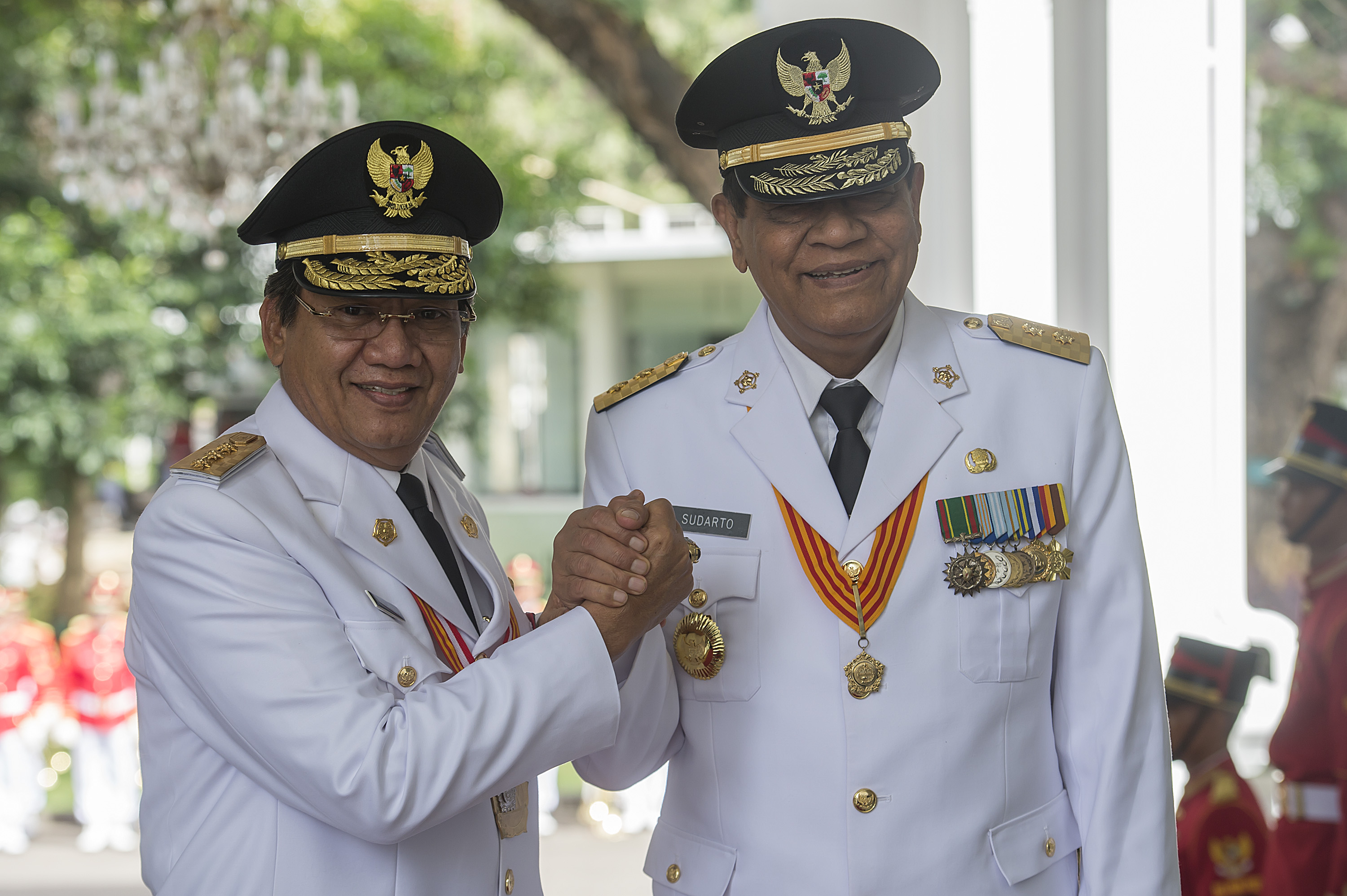 Gubernur Sulawesi Tengah terpilih Longki Djanggola (kiri) berjabat tangan dengan Wakil Gubernur Sulawesi Tengah terpilih Sudarto (kanan) sebelum menerima petikan Keppres di Istana Merdeka, Jakarta, Kamis (16/6). Presiden Joko Widodo melantik Longki Djanggola sebagai Gubernur Sulawesi Tengah dan Sudarto sebagai Wakil Gubernur Sulawesi Tengah untuk periode 2016-2021. ANTARA FOTO/Widodo S. Jusuf/aww/16.