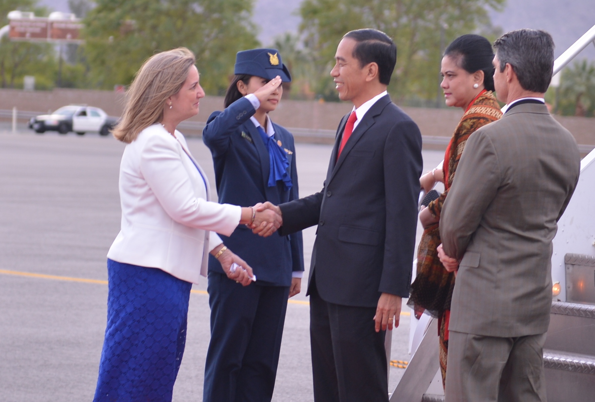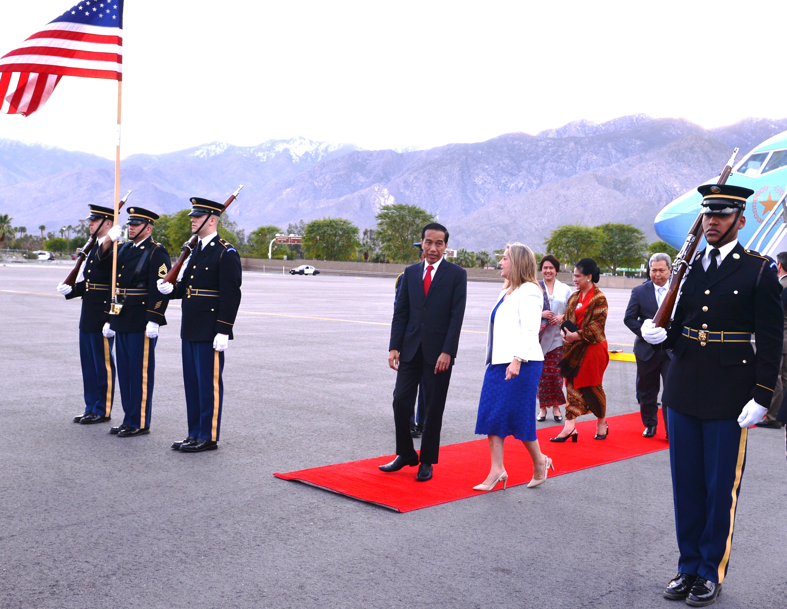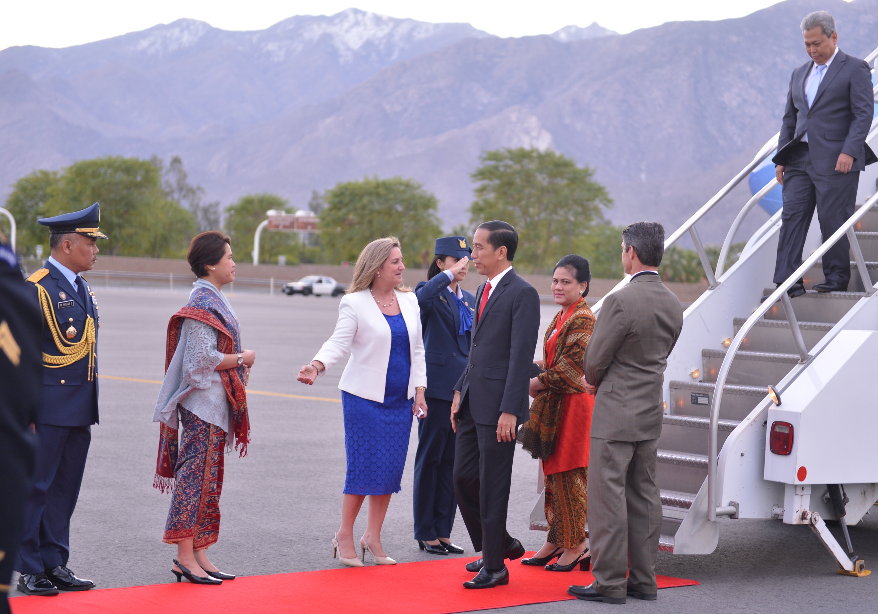Presiden Joko Widodo dan rombongan tiba di Bandar Udara Internasional Palm Springs, California, Amerika Serikat Minggu (14/02). Presiden tiba di Amerika Serikat untuk waktu menghadiri acara Konferensi Tingkat Tinggi ASEAN-AS (ASEAN-US Summit).