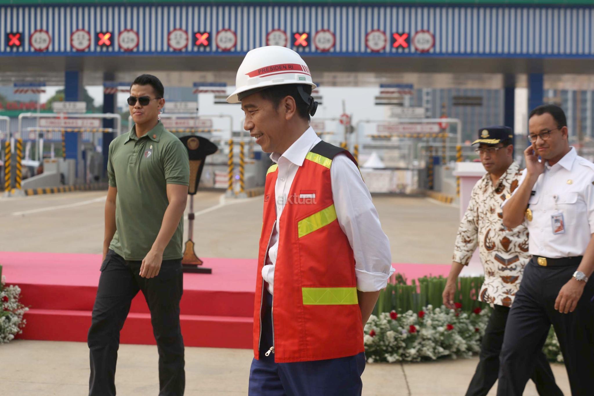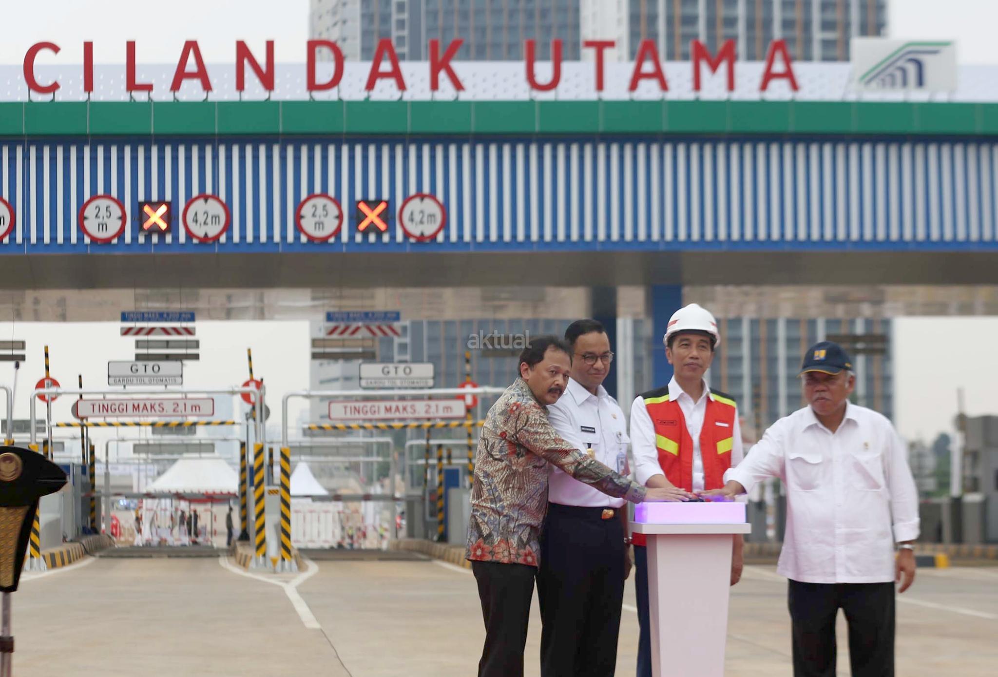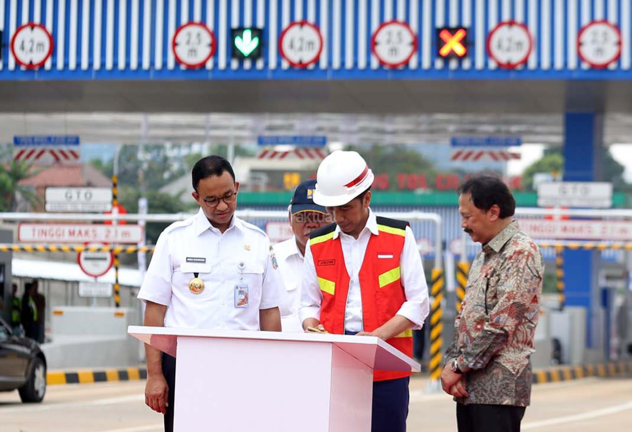Presiden Joko Widodo, Menteri PUPR Basuki Hadimuljono, Gubernur DKI Jakarta Anies Baswe dan dan Direktur Utama PT Citra Marga Nusaphala Persada Tbk (CMNP), Tito Sulistio di sela-sela pengoperasian jalan Tol Depok-Antasari Seksi I di Jakarta, Kamis (27/9). Pengoperasian Tol Depok Antasari (Desari) Seksi I ruas Antasari-Brigif sepanjang 5,8 km tersebut untuk meningkatkan konektivitas antara Jakarta dengan kota-kota penyangga seperti Depok, Bogor dan Kabupaten Bogor. AKTUAL/Eko S Hilman