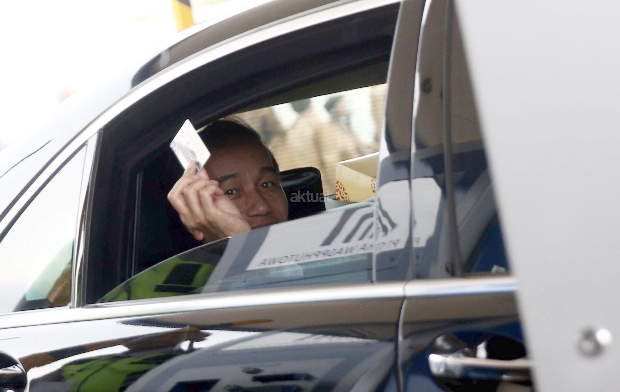 Presiden Joko Widodo memperlihatkan kartu e-tol di sela-sela pengoperasian jalan Tol Depok-Antasari Seksi I di Jakarta, Kamis (27/9). Pengoperasian Tol Depok Antasari (Desari) Seksi I ruas Antasari-Brigif sepanjang 5,8 km tersebut untuk meningkatkan konektivitas antara Jakarta dengan kota-kota penyangga seperti Depok, Bogor dan Kabupaten Bogor. AKTUAL/Eko S Hilman
