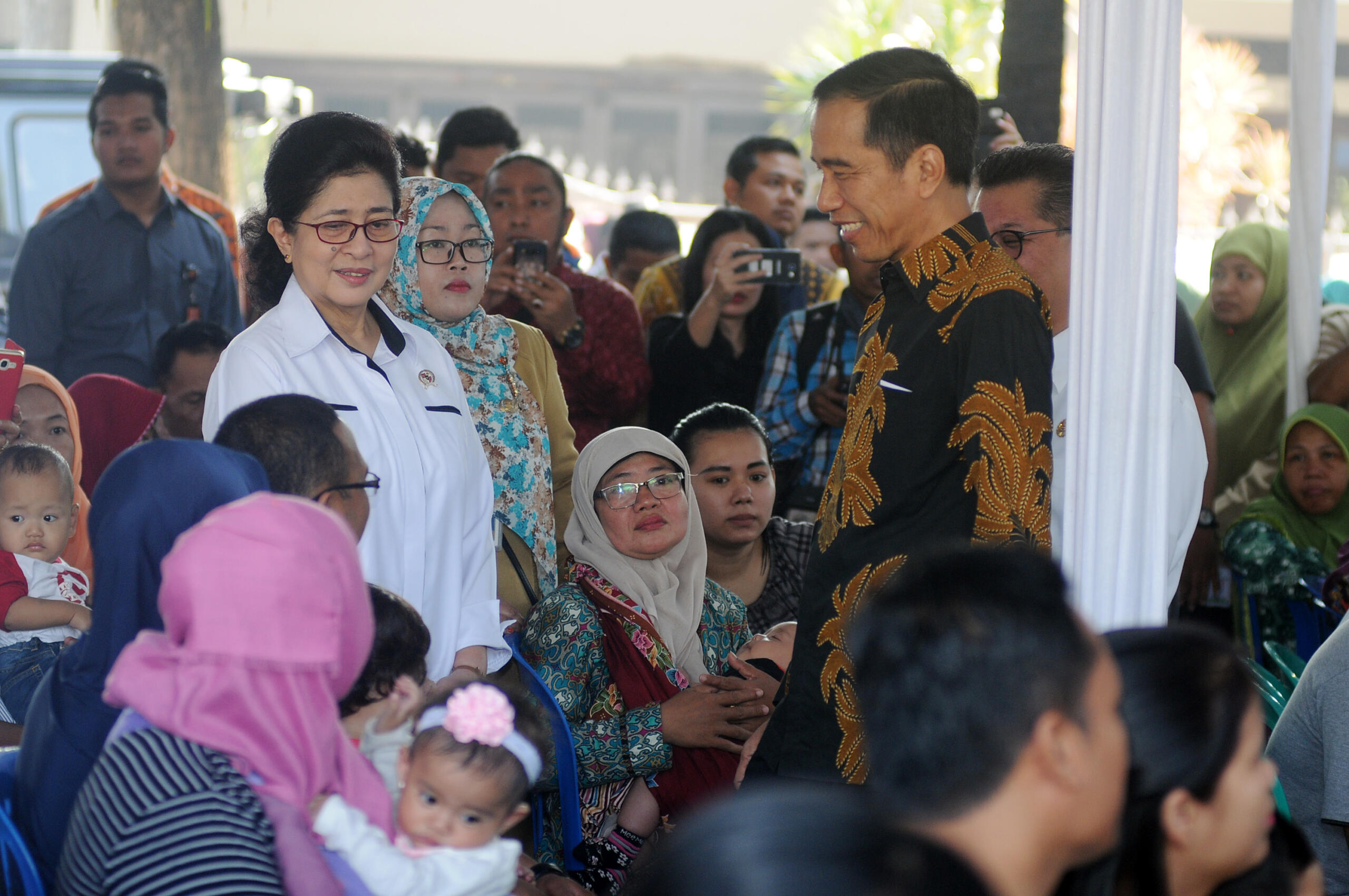 Presiden Joko Widodo (kanan) didampingi Menteri Kesehatan Nila F Moeloek (kiri) berbincang dengan orangtua korban vaksin palsu saat meninjau pelaksanaan vaksinasi ulang di Puskesmas Kecamatan Ciracas, Jakarta Timur, Senin (18/7). Pelaksanaan vaksinasi ulang yang digelar Kementerian Kesehatan dan diikuti puluhan anak-anak dan balita itu sebagai imbas dari beredarnya vaksin palsu di sejumlah rumah sakit, klinik, dan praktek bidan di Bekasi dan Jakarta Timur. ANTARA FOTO/Indrianto Eko Suwarso/pd/16