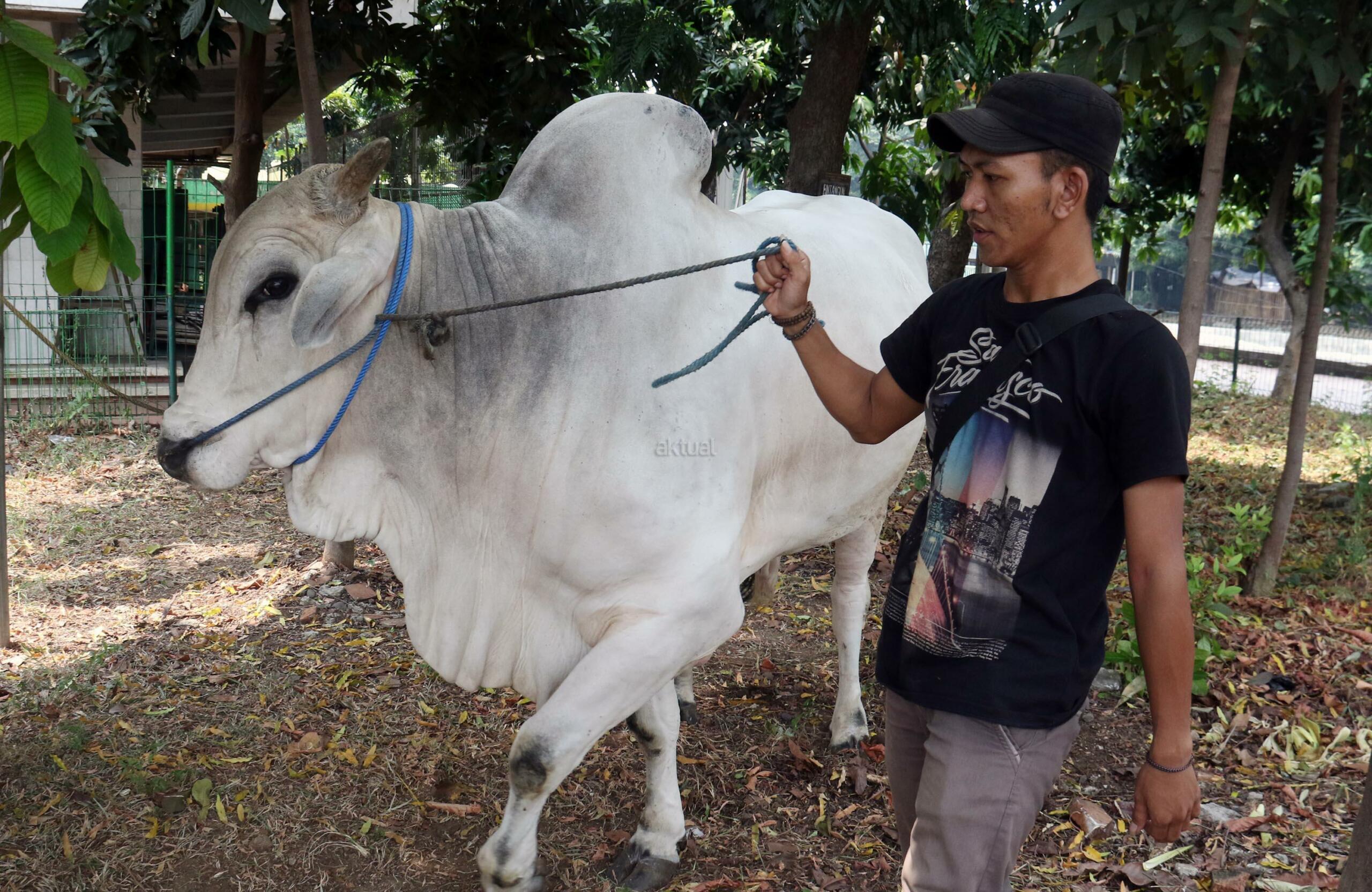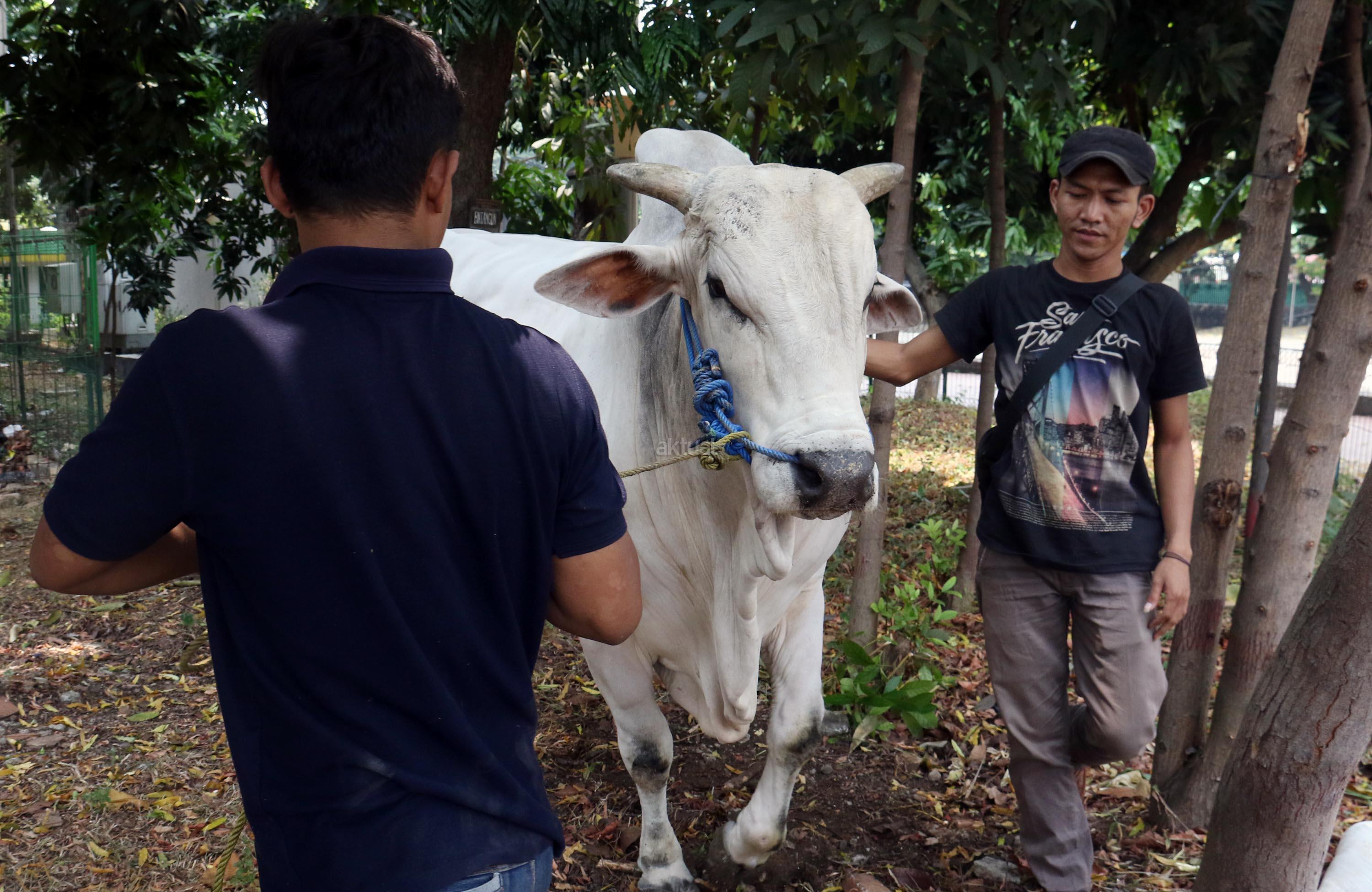 Penjaga sapi milik Presiden Jokowi membawa di pelataran Masjid Istiqal, Jakarta, Kamis (31/8/2017). Dua sapi tersebut diketahui merupakan jenis sapi Ongole dan memiliki bobot yang berbeda. Sapi milik presiden memiliki berat 1,5 ton, sedangkan sapi milik JK mempunyai berat 1,3 ton dan Sapi itu akan dikurbankan saat Idul Adha 1438 Hijriah, 1 September besok. AKTUAL/Munzir