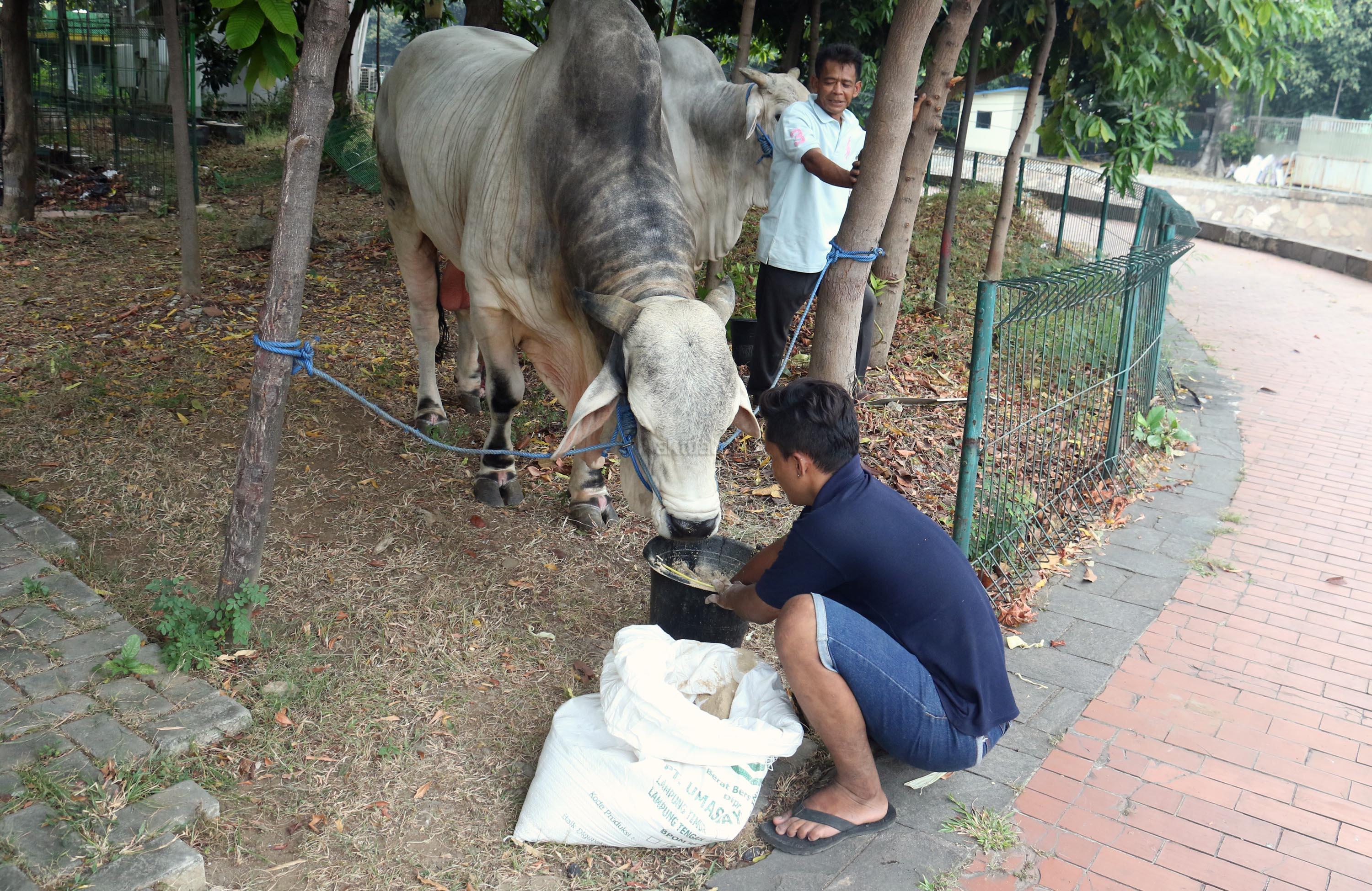 Penjaga sapi memberikan pakan kepada sapi milik Presiden Jokowi di pelataran Masjid Istiqal, Jakarta, Kamis (31/8/2017). Dua sapi tersebut diketahui merupakan jenis sapi Ongole dan memiliki bobot yang berbeda. Sapi milik presiden memiliki berat 1,5 ton, sedangkan sapi milik JK mempunyai berat 1,3 ton dan Sapi itu akan dikurbankan saat Idul Adha 1438 Hijriah, 1 September besok. AKTUAL/Munzir