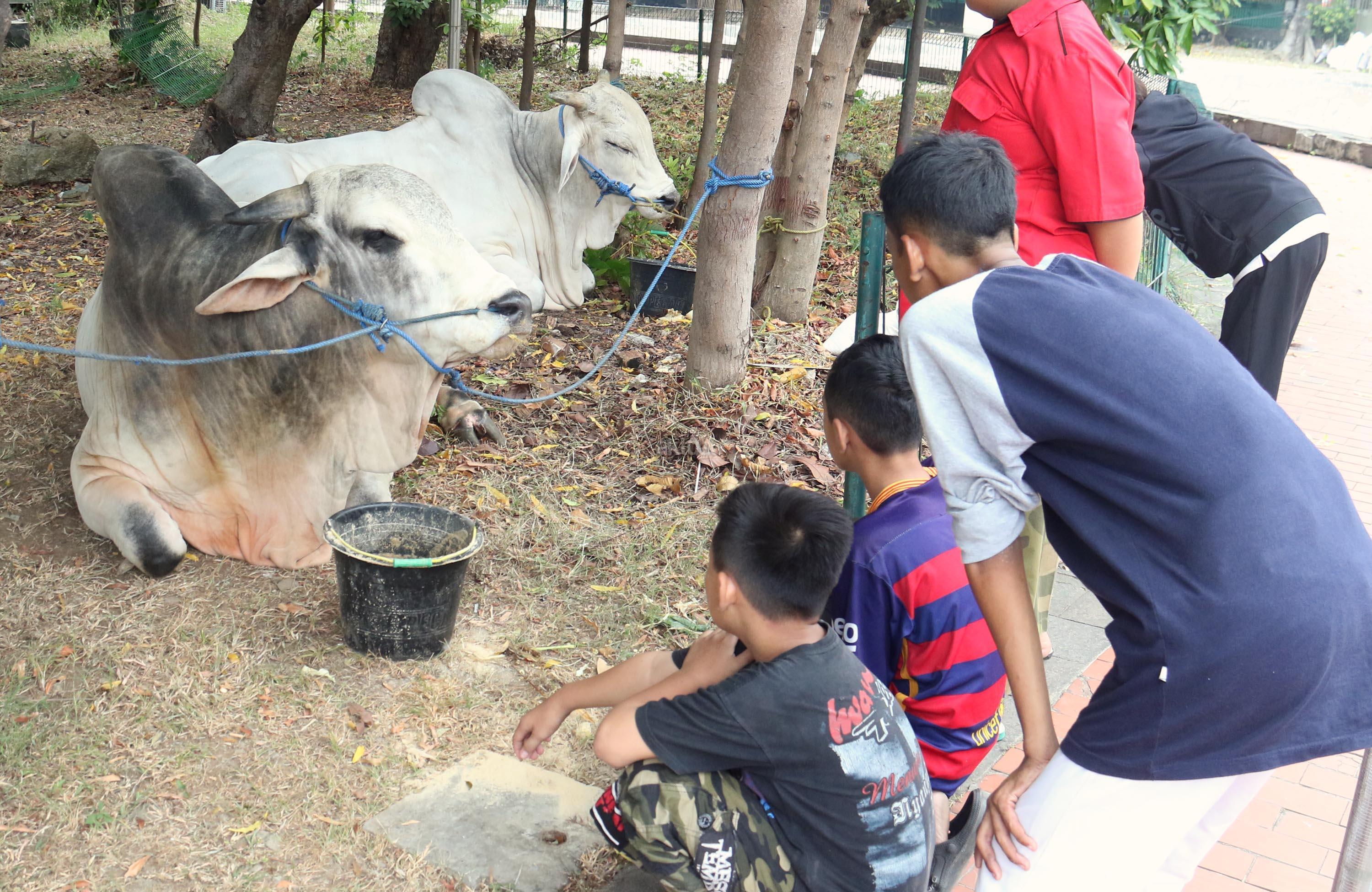 Pengunjung melihat sapi milik Presiden Jokowi (kiri) dan sapi milik Wakil Presiden Jusf Kalla (kanan) di pelataran Masjid Istiqal, Jakarta, Kamis (31/8/2017). Dua sapi tersebut diketahui merupakan jenis sapi Ongole dan memiliki bobot yang berbeda. Sapi milik presiden memiliki berat 1,5 ton, sedangkan sapi milik JK mempunyai berat 1,3 ton dan Sapi itu akan dikurbankan saat Idul Adha 1438 Hijriah, 1 September besok. AKTUAL/Munzir