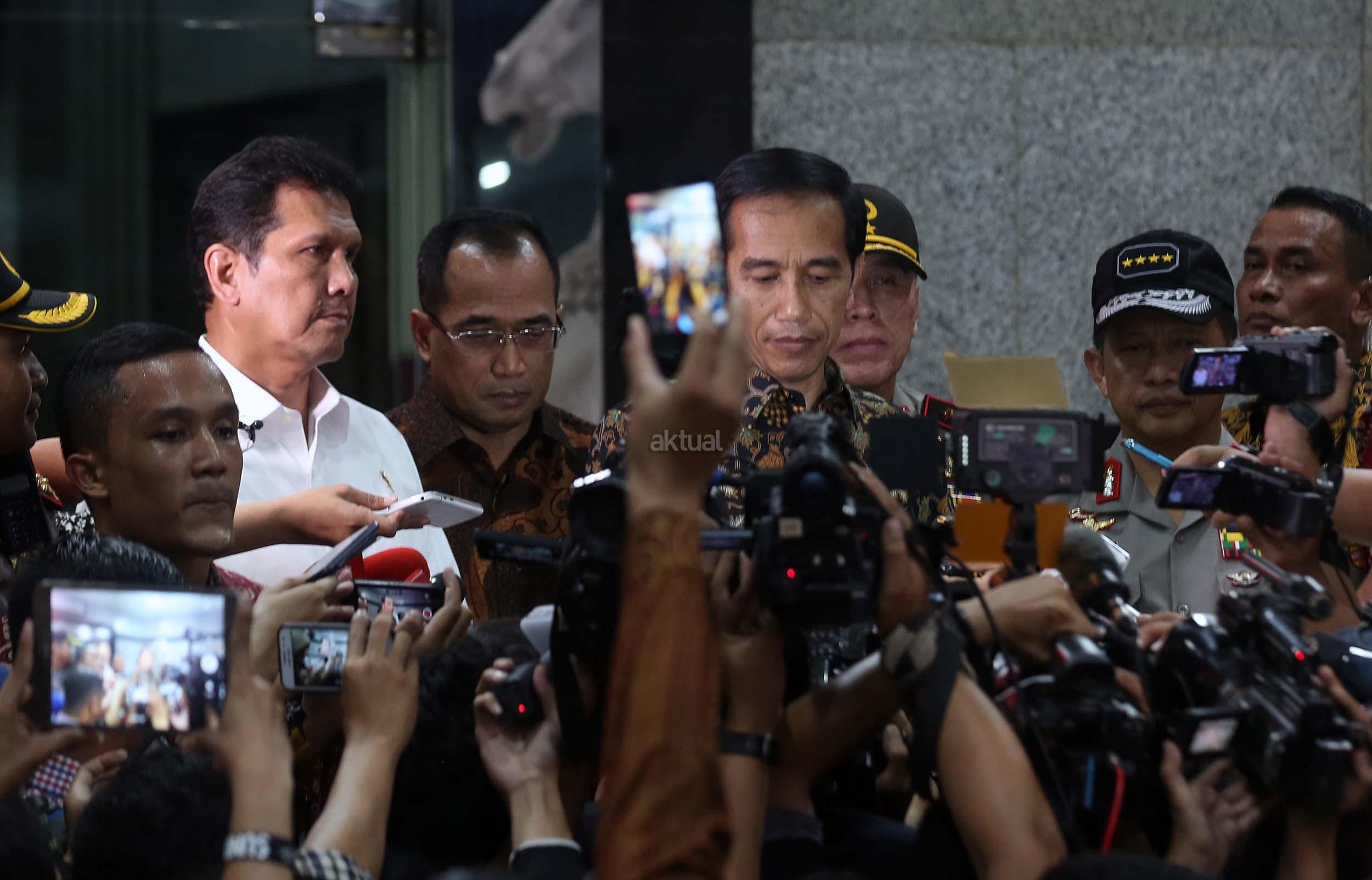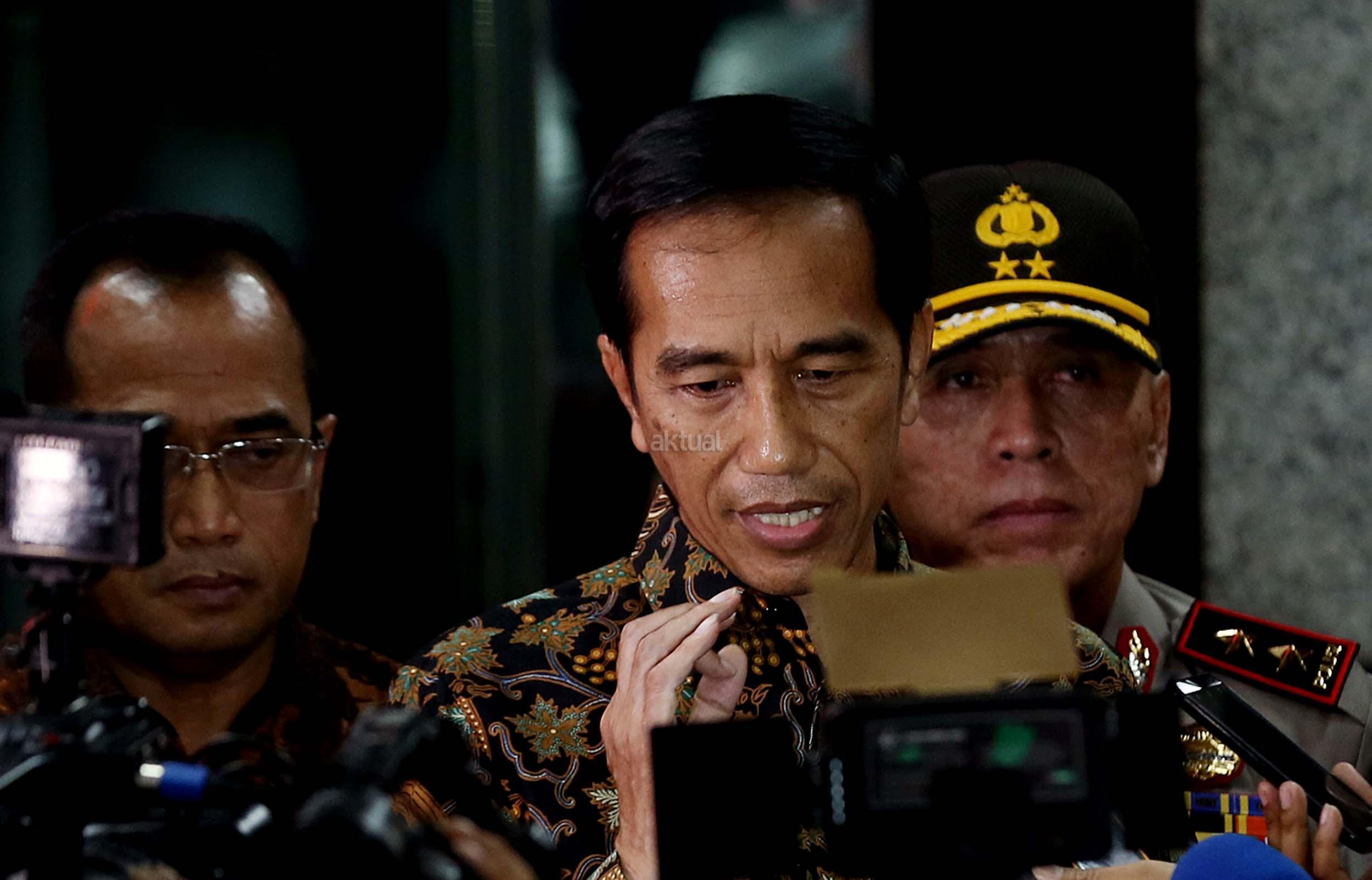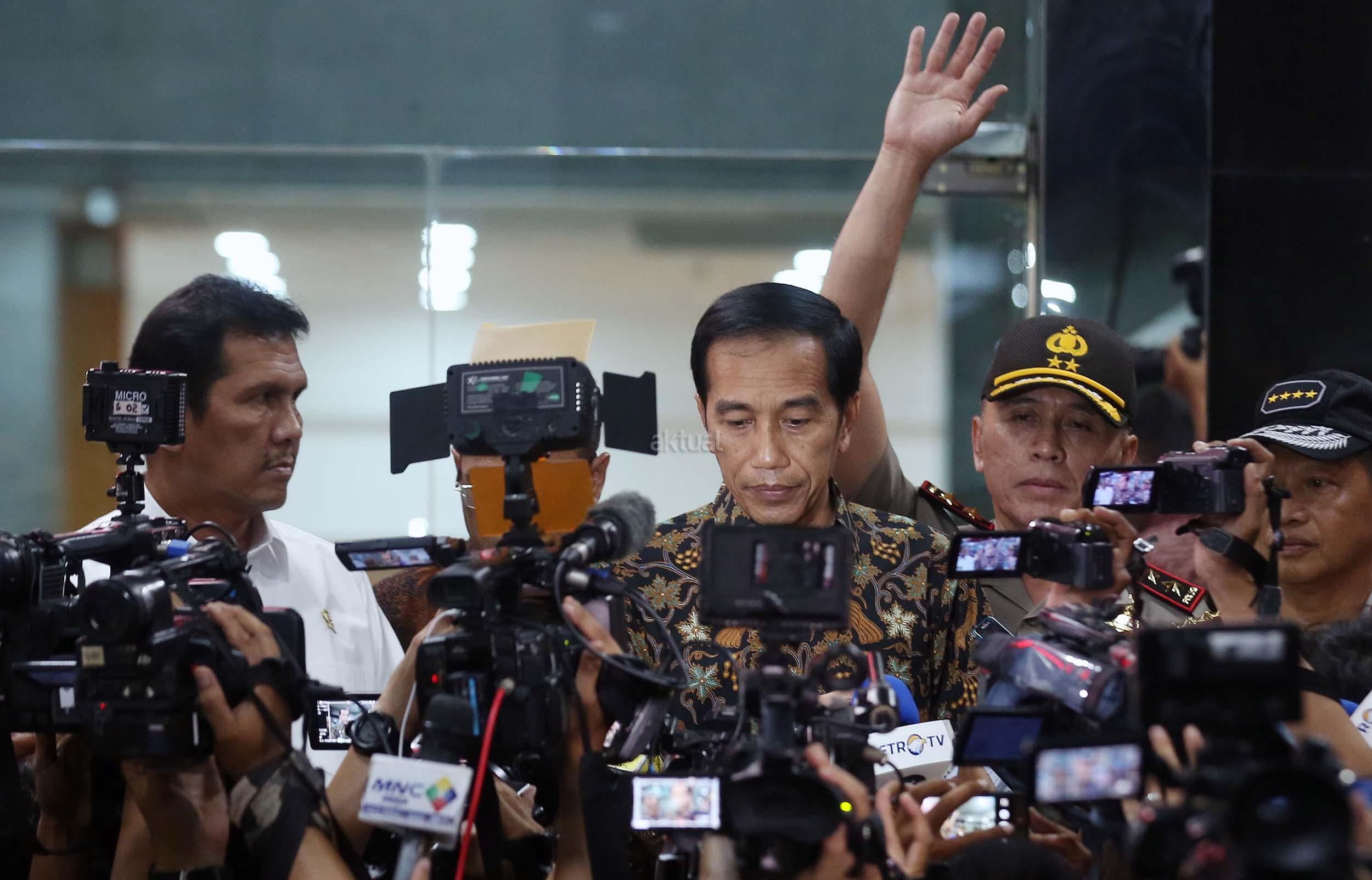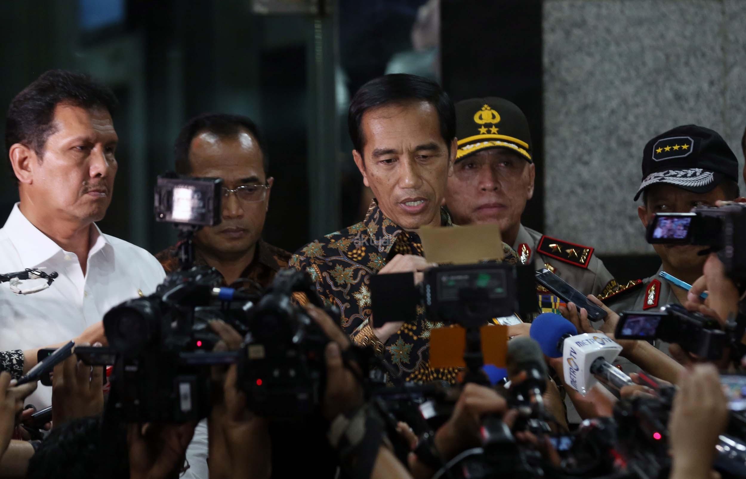 Presiden Jokowi memberikan keterangan persnya usai mendatangi kantor Kementerian Perhubungan, Jakarta, Selasa (11/10/2016). Jokowi mendatangi Kemenhub saat Operasi Tangkap Tangan (OTT) yang dilakukan Polri terkait praktek pungli perizinan kapal. Aktual/Munzir
