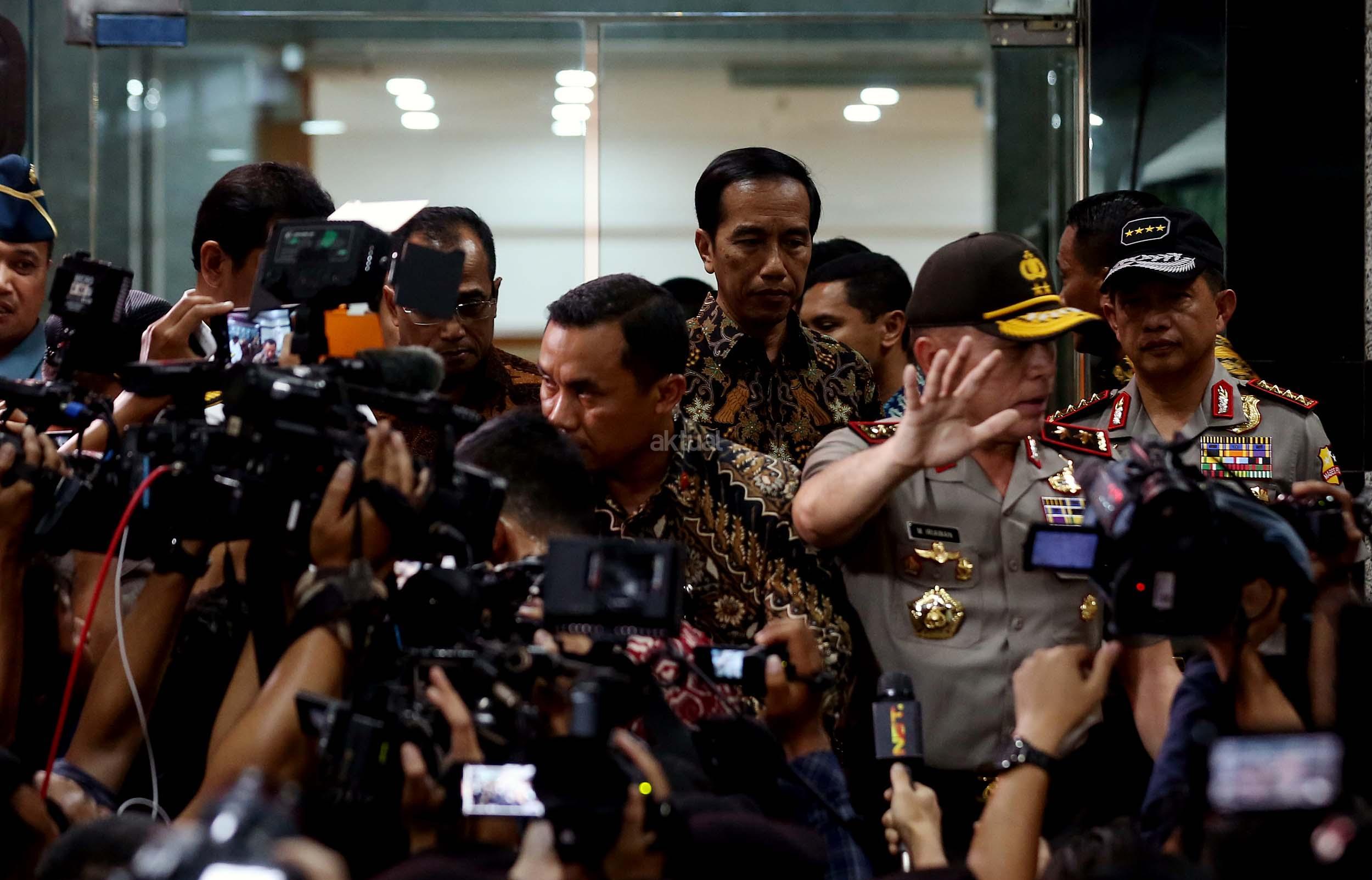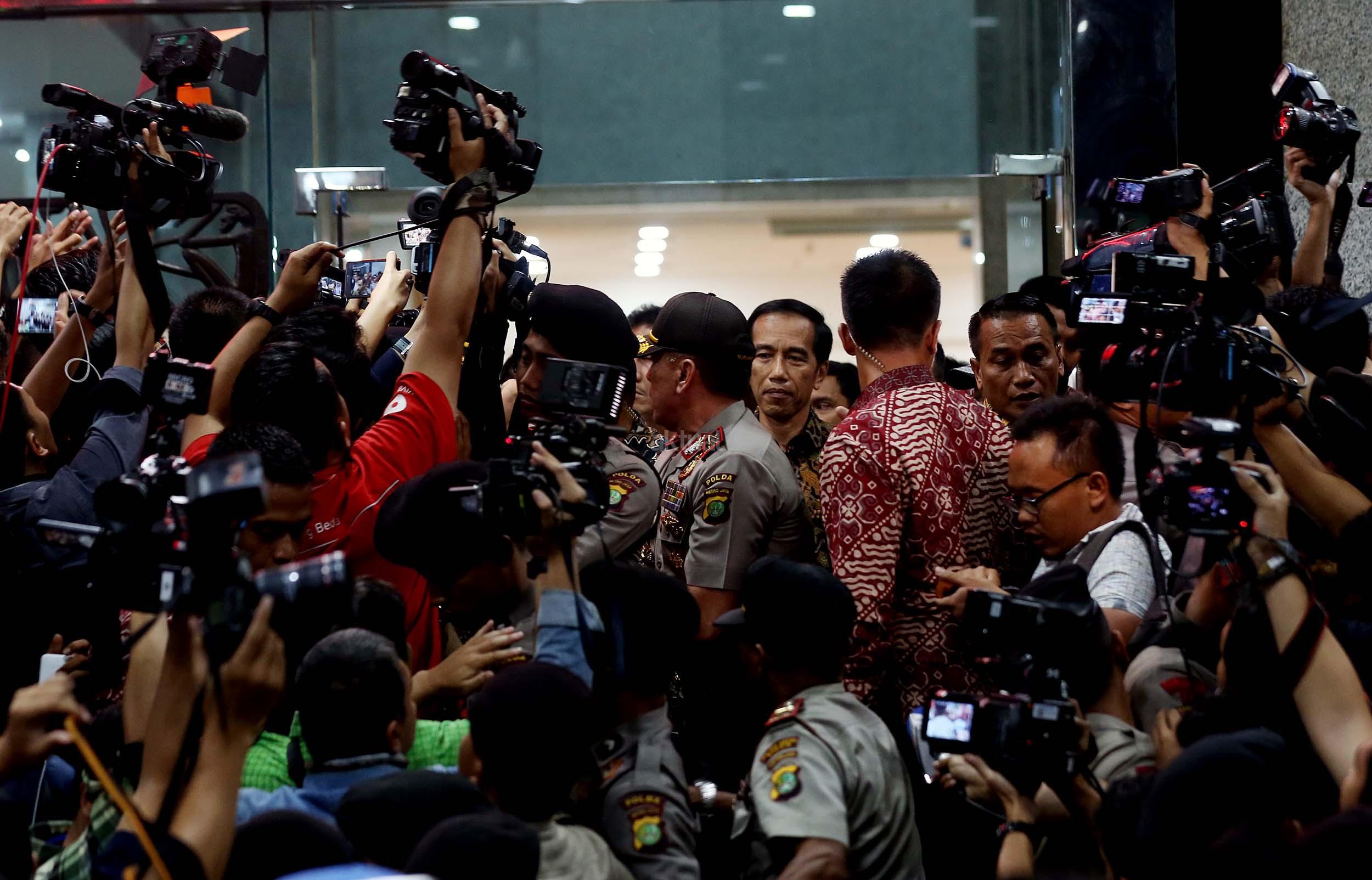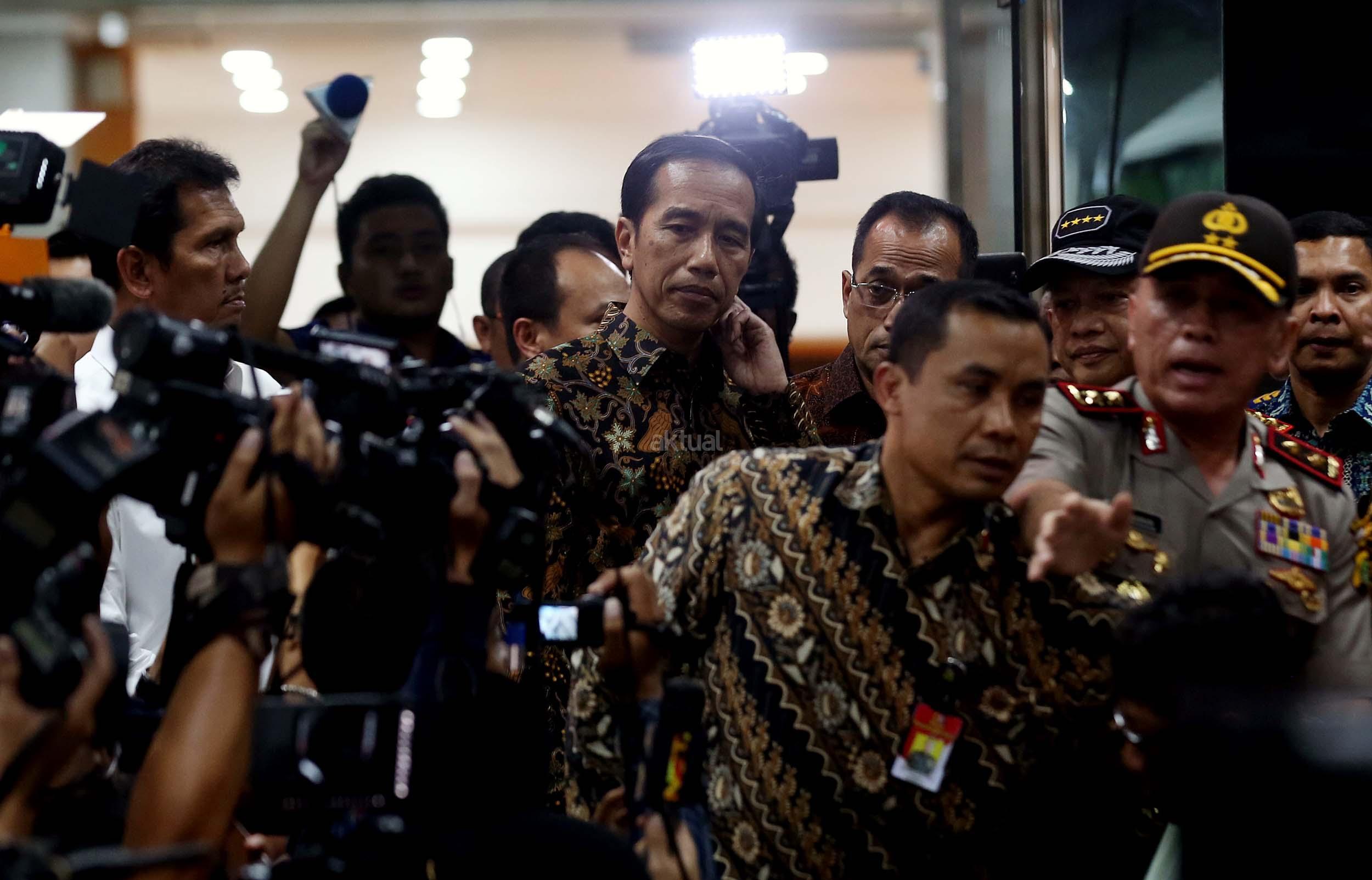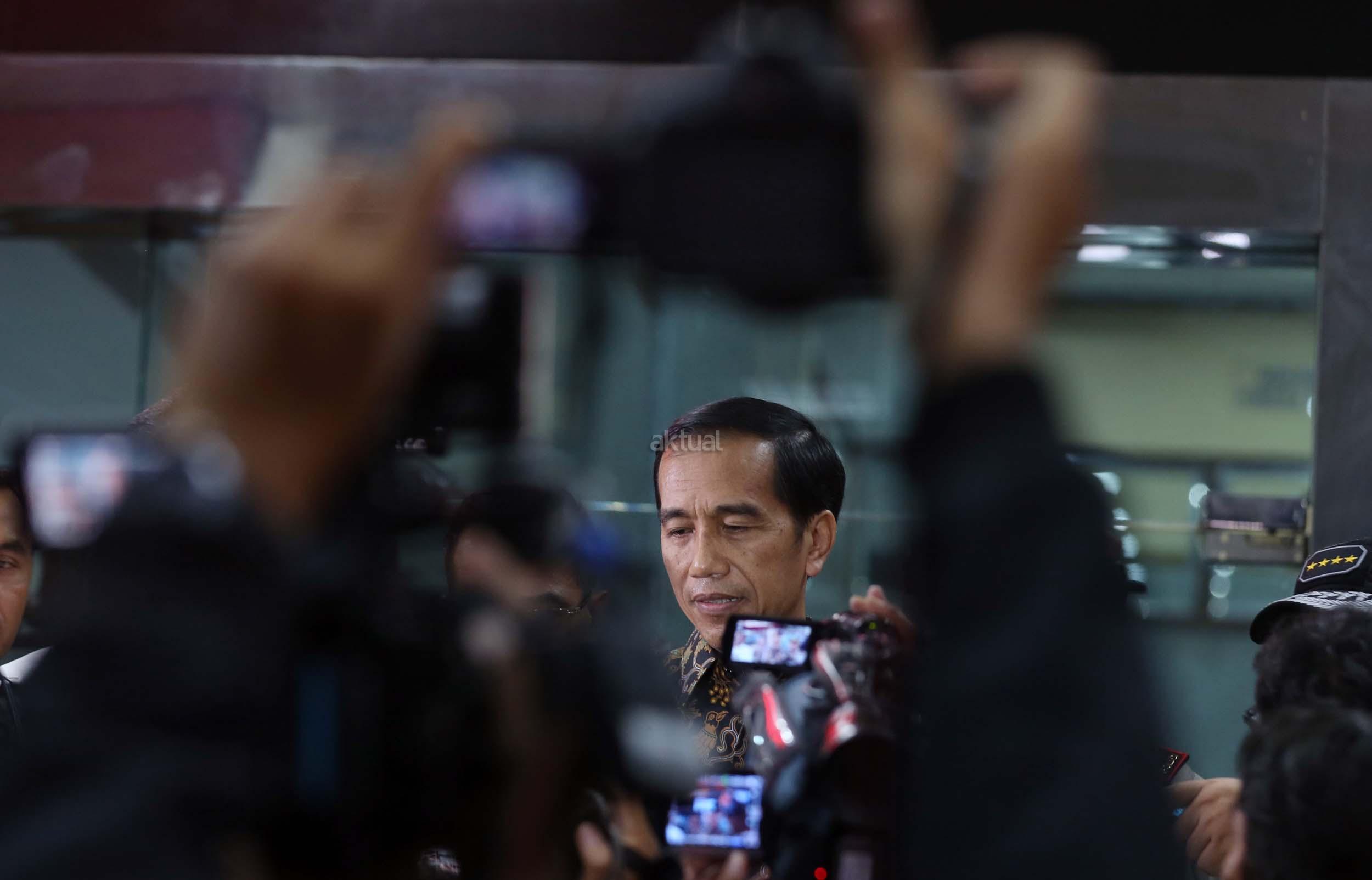 Presiden Jokowi memberikan keterangan persnya usai mendatangi kantor Kementerian Perhubungan, Jakarta, Selasa (11/10/2016). Jokowi mendatangi Kemenhub saat Operasi Tangkap Tangan (OTT) yang dilakukan Polri terkait praktek pungli perizinan kapal. Aktual/Munzir
