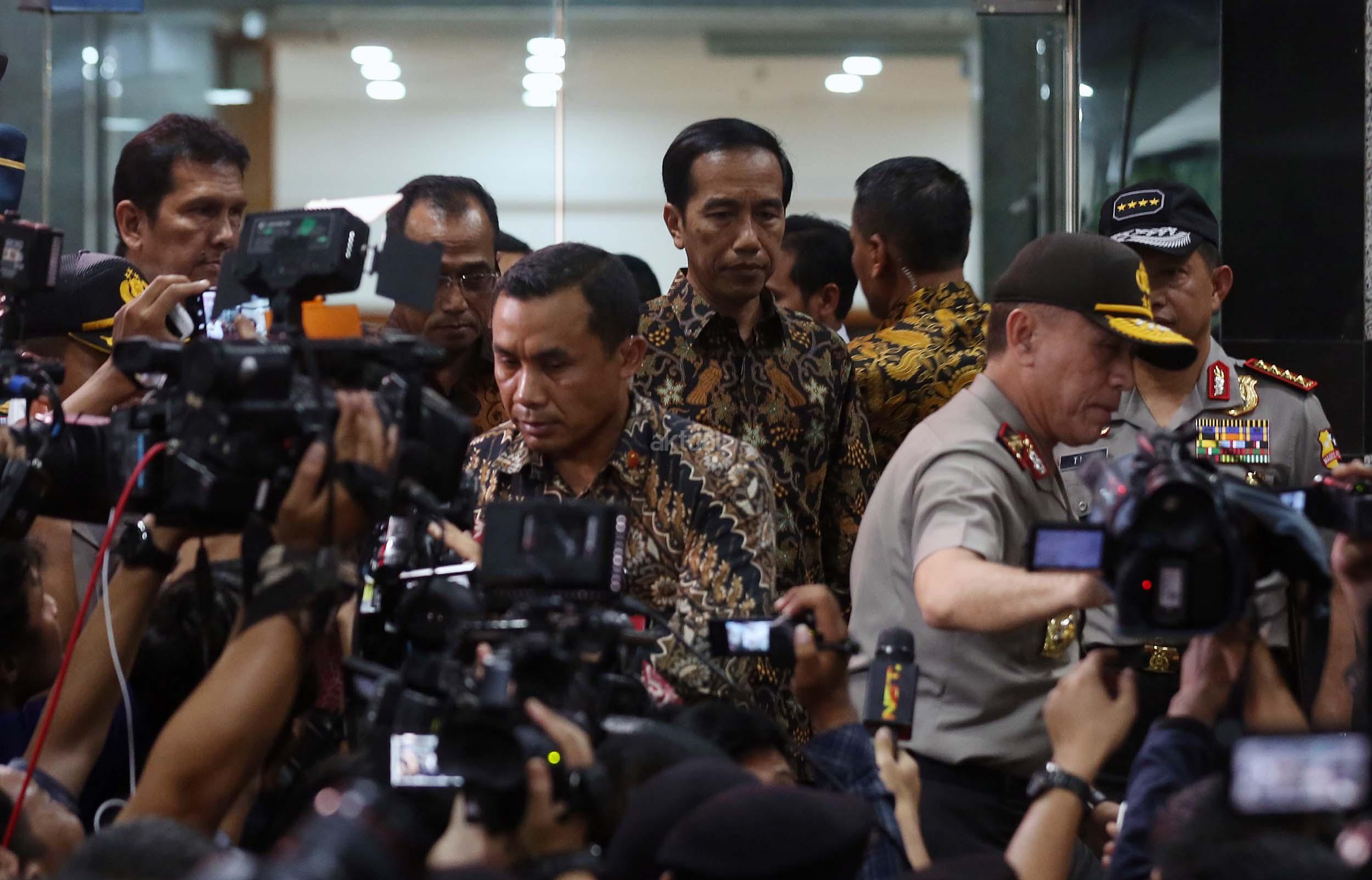 Presiden Jokowi memberikan keterangan persnya usai mendatangi kantor Kementerian Perhubungan, Jakarta, Selasa (11/10/2016). Jokowi mendatangi Kemenhub saat Operasi Tangkap Tangan (OTT) yang dilakukan Polri terkait praktek pungli perizinan kapal.