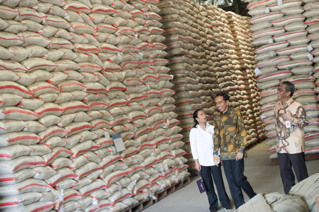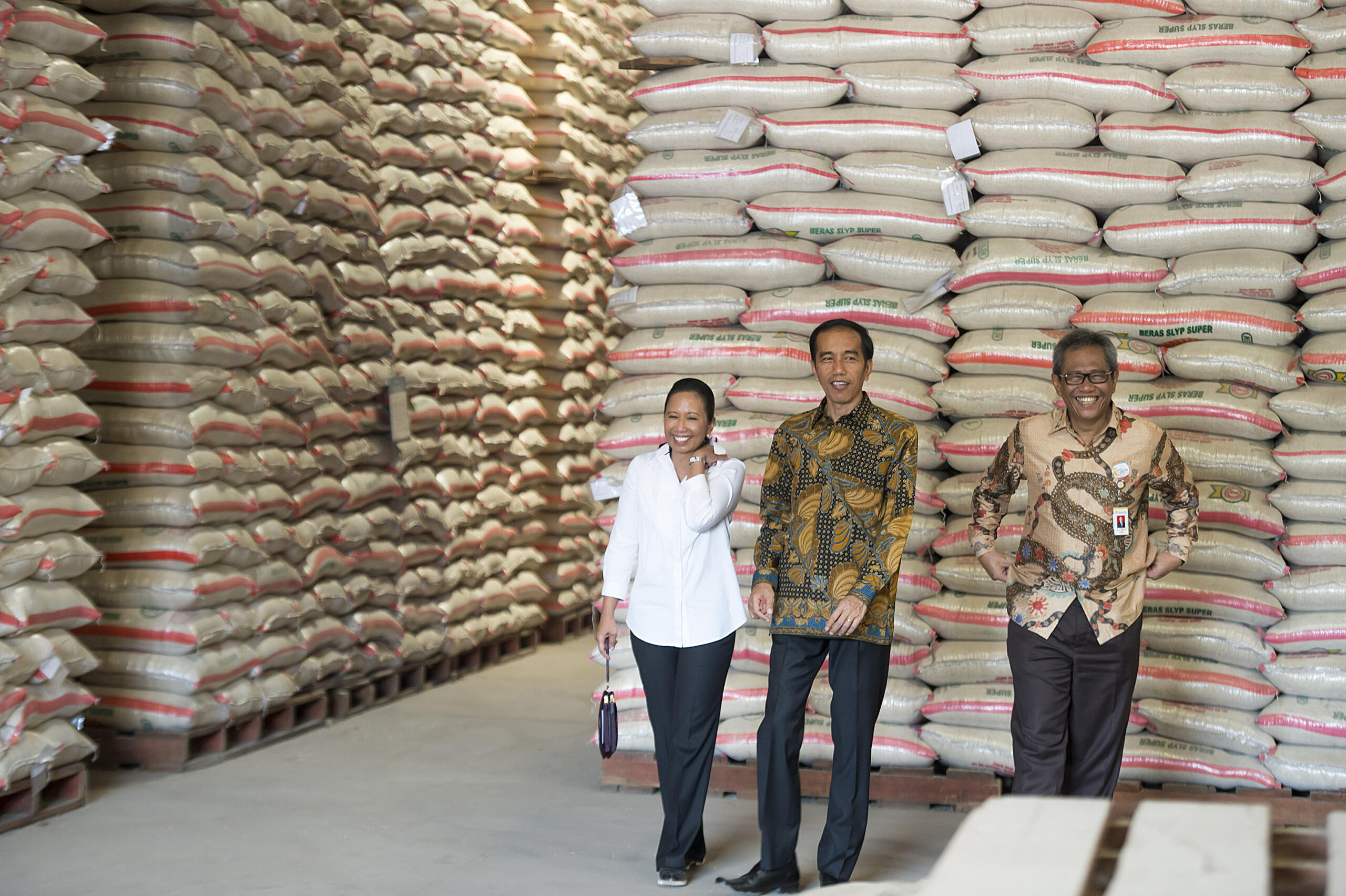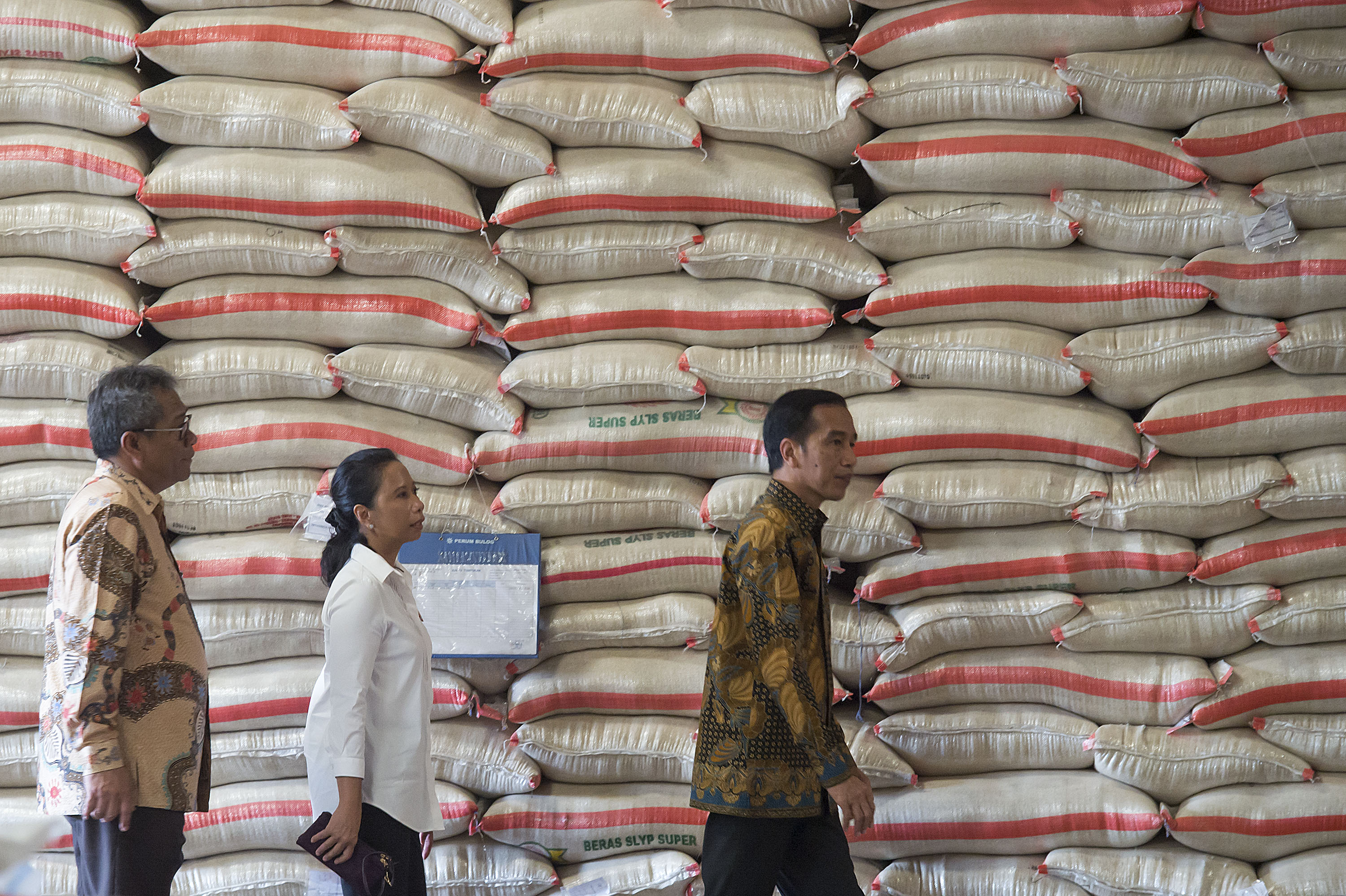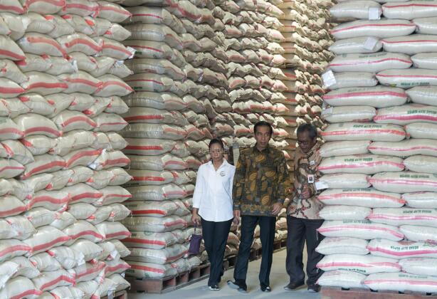 Presiden Joko Widodo (kanan) didampingi Menteri BUMN Rini Soemarno (tengah) dan Dirut Perum Bulog Djarot Kusumayakti (kiri) meninjau stok beras di Gudang Nomor 28 di Bulog Divre Kelapa Gading, Jakarta, Jumat (2/10). Pemerintah menggelar operasi pasar beras premium secara serentak di sejumlah kota besar di Indonesia untuk mengendalikan harga menjelang musim paceklik dengan harga Rp8.700 - Rp9.700 per Kg tergantung kualitasnya. ANTARA FOTO/Widodo S. Jusuf/pras/15.