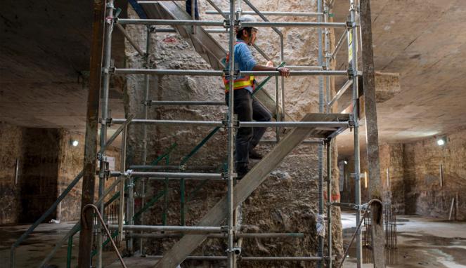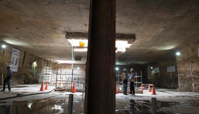 Aktivitas pekerja di proyek pengeboran terowongan untuk angkutan massal cepat (mass Rapid Transit/MRT) di kawasan Senayan, Jakarta Pusat, Kamis (29/10). Saat ini pengeboran telah mencapai jarak sekitar 120 meter menuju stasiun Senayan. Sementara itu, tunnel boring machine (TBM) yang kedua segera dioperasikan untuk pengeboran terowongan yang kedua. Kompas/Priyombodo (PRI) 29-10-2015