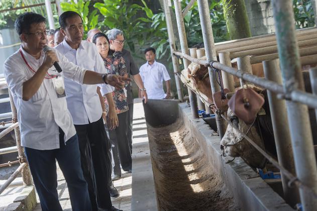 Presiden Joko Widodo (kanan) didampingi Pemilik PT Karya Anugerah Rumpin (KAR) Karnadi Winaga (kiri) mengunjugi tempat pembiakan dan penggemukan sapi PT KAR di Kecamatan Rumpin, Kabupaten Bogor, Jawa Barat, Selasa (21/6). Di lokasi tersebut telah berhasil dilakukan pembibitan sapi lokal unggul yang berkualitas sebagai sebuah program jangka panjang menuju swasembada daging. ANTARA FOTO/Widodo S. Jusuf/foc/16.
