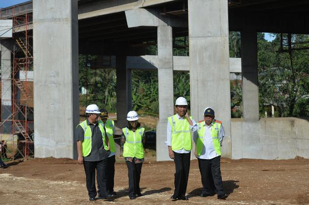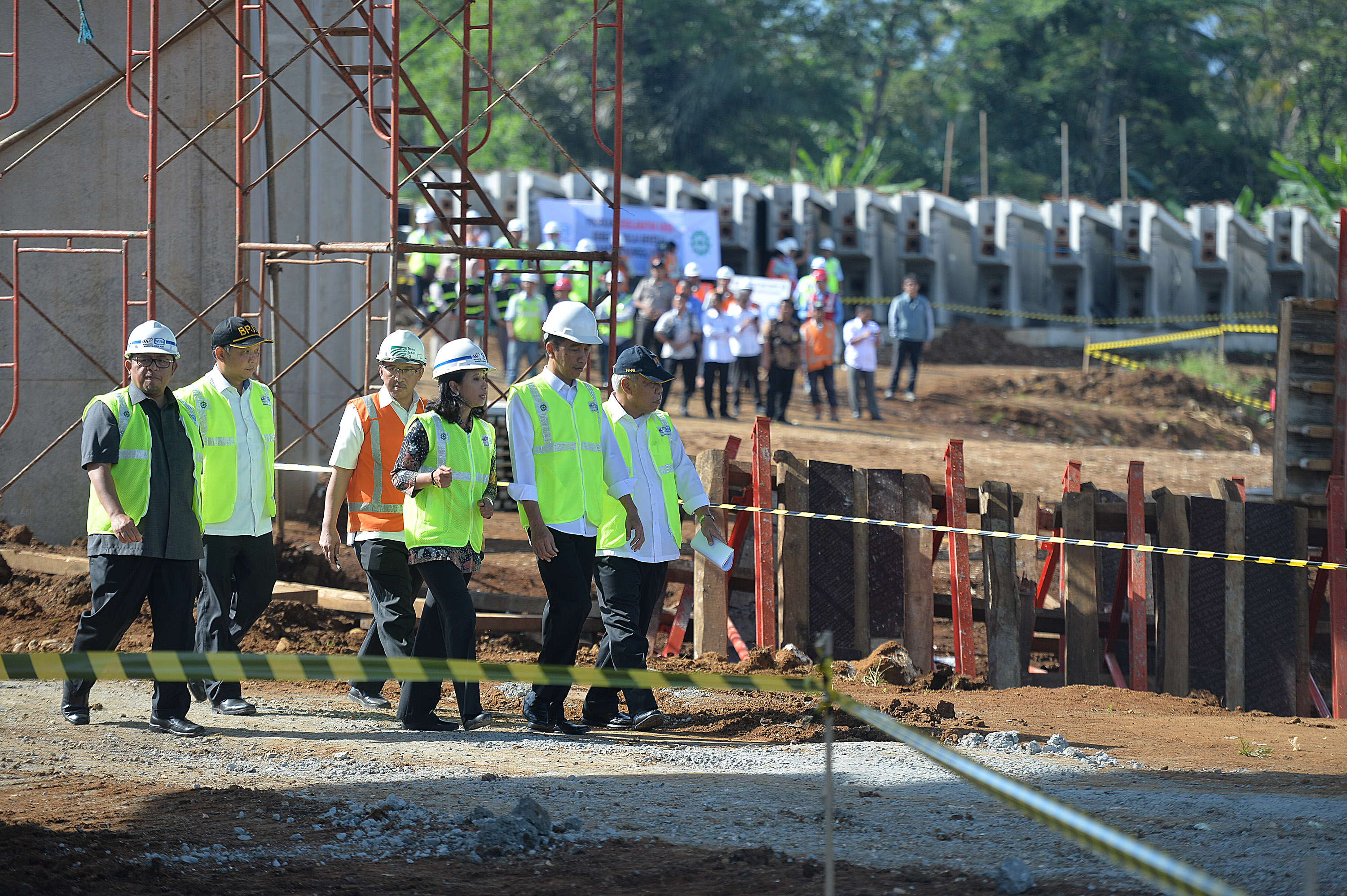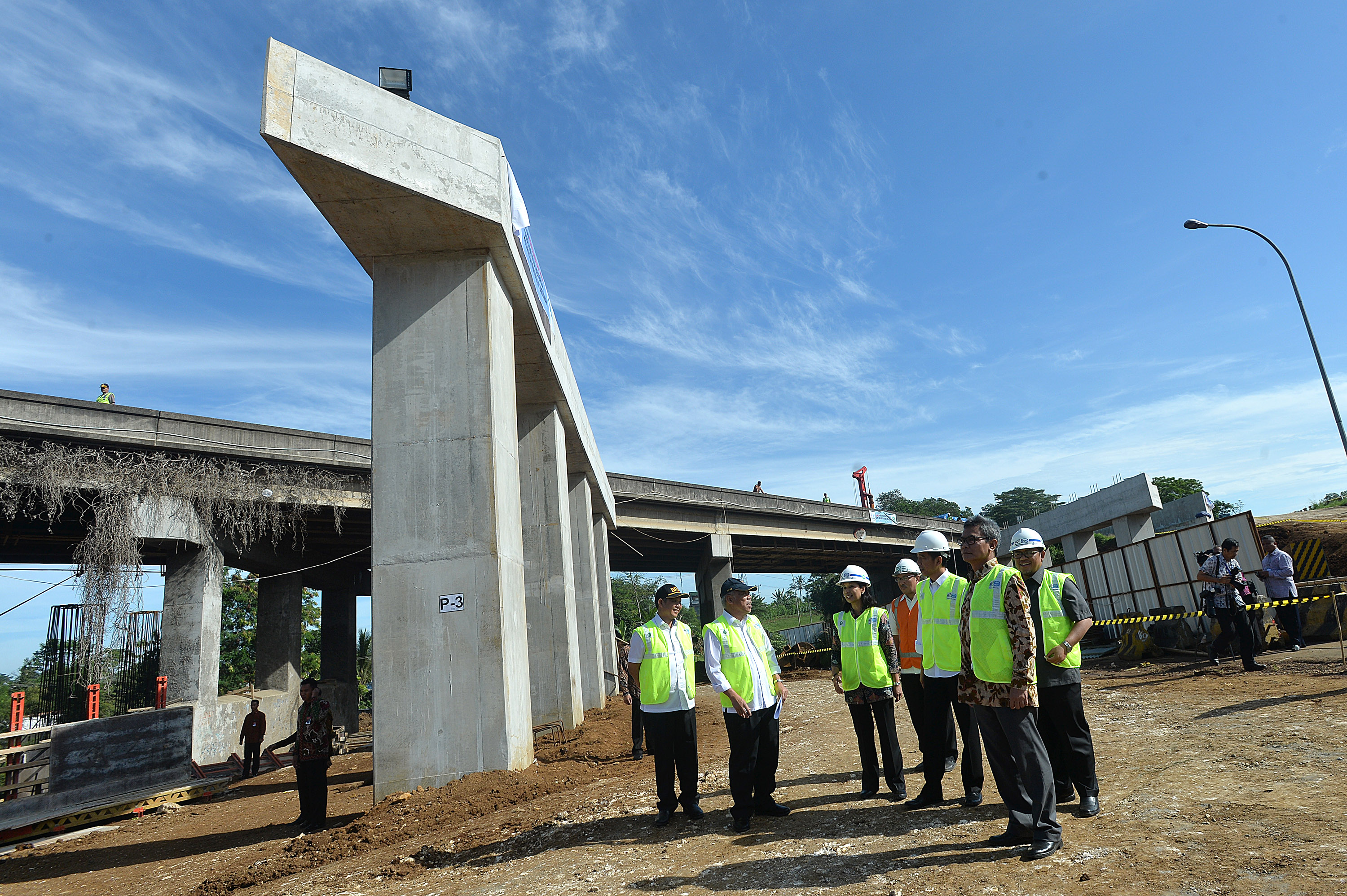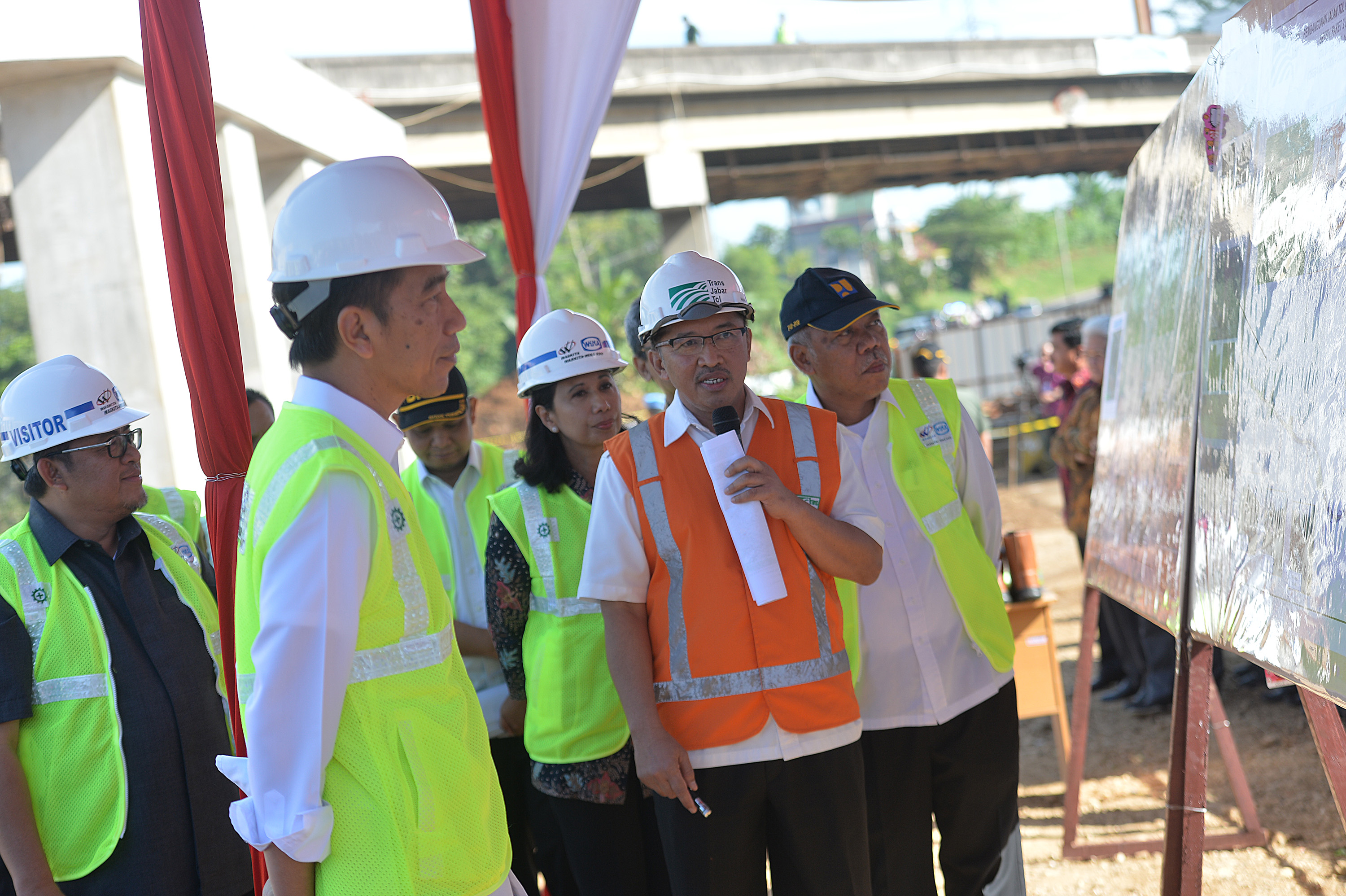 Presiden Joko Widodo (kedua kanan) didampingi Menteri PU dan PR Basuki Hadimuljono (kanan), Menteri BUMN Rini Soemarno (ketiga kanan), Gubernur Jawa Barat Ahmad Heryawan (kiri) dan Dirut PT Trans Jabar Tol Muhammad Sadeli (ketiga kiri) meninjau pembangunan Jalan Tol ruas Bogor-Ciawi-Sukabumi seksi satu di Gadog, Bogor, Jawa Barat, Selasa (21/6). Jalan tol dengan panjang total sekitar 53,6 kilometer menghubungkan kota Bogor dan Sukabumi tersebut terbagi menjadi empat seksi dengan total investasi sebesar Rp7,7 triliun dengan target selesai pada tahun 2018. ANTARA FOTO/Widodo S. Jusuf/foc/16.