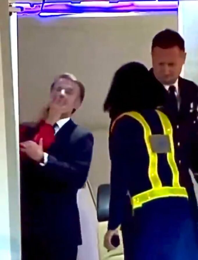 Setelah ”ditampar”, kemudian presiden berusia 47 tahun itu menyentuh wajahnya sebelum melambaikan tangan ke arah kerumunan yang menunggu mereka, dan istrinya yang berusia 72 tahun, mengenakan blazer merah, mengambil posisi di belakangnya saat mereka mulai keluar dari pesawat. Saat pasangan itu mulai menuruni tangga pesawat, Brigitte terlihat bersikap tenang dan elegan, tanpa menyambut uluran tangan suaminya. Macron menyusul satu langkah di belakang, masih memegang pegangan tangga. Pasangan itu tidak berpegangan tangan saat berjalan turun.