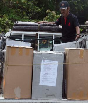 Habibie hadir ke TPS dengan mengenakan baju batik warna coklat lengan panjang dan peci. TPS-nya berada persis di depan rumahnya.