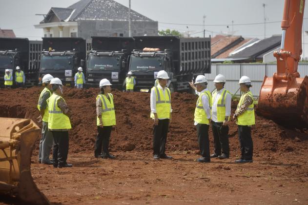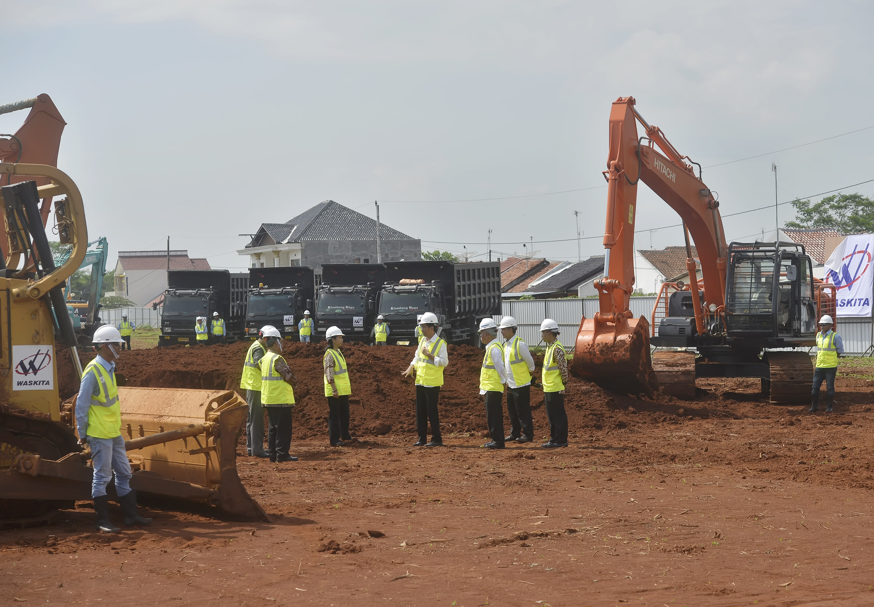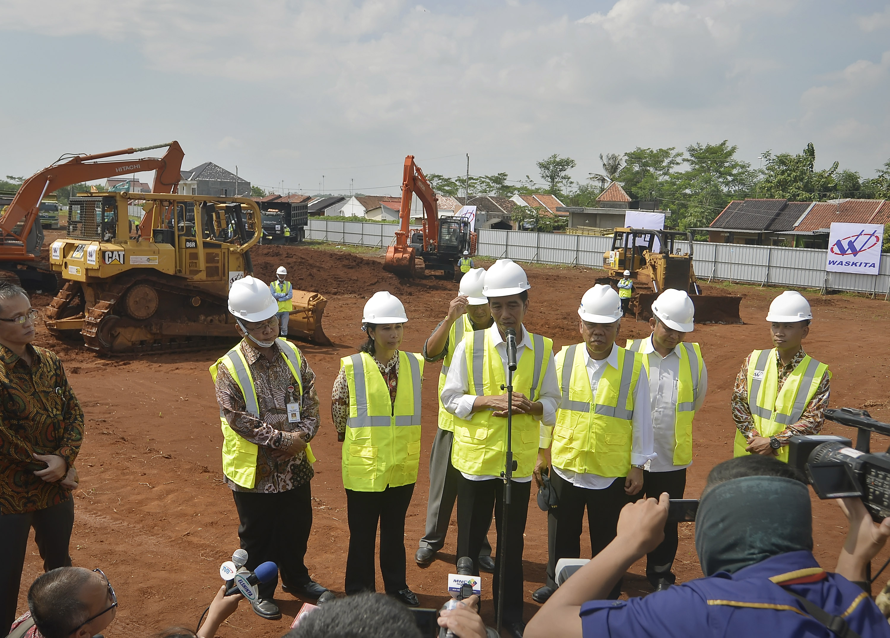 Presiden Joko Widodo (tengah) didampingi Menteri PU dan Perumahan Rakyat Basuki Hadimuldjono (ketiga kanan), Menteri BUMN Rini Soemarno (kedua kiri), Wagub Jateng Heru Sudjatmoko (kiri) serta Kepala Badan Pengatur Jalan Tol (BPJT) Herry Trisaputra Zuna (kedua kanan) memberikan keterangan pers usai meninjau proyek pembangunan Tol Pemalang- Batang dan Batang-Semarang di Kabupaten Batang, Jawa Tengah, Jumat (16/6). Panjang ruas Tol Pemalang-Batang 39,2 km dan ruas Tol Batang-Semarang 75 km, yang merupakan dua ruas tol yang bernilai investasi Rp15,85 triliun tersebut merupakan jaringan jalan tol Trans Jawa dalam rangka mempercepat pembangunan infrastruktur nasional. ANTARA FOTO/Yudhi Mahatma/aww/16.